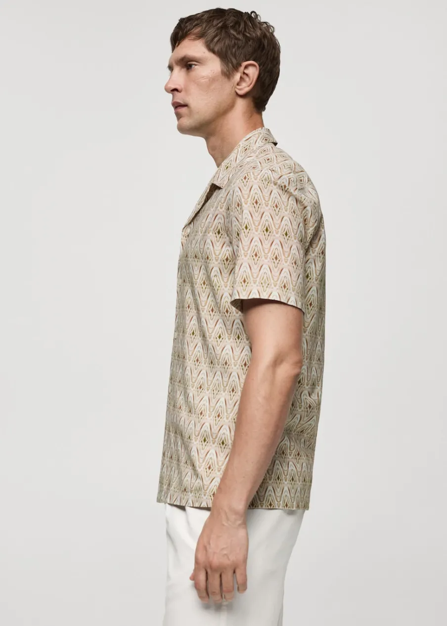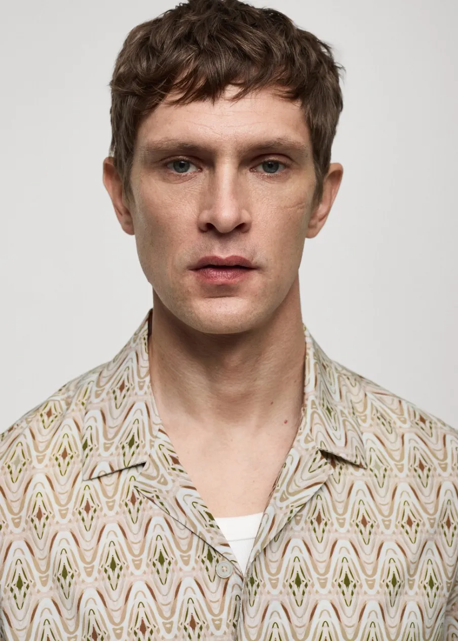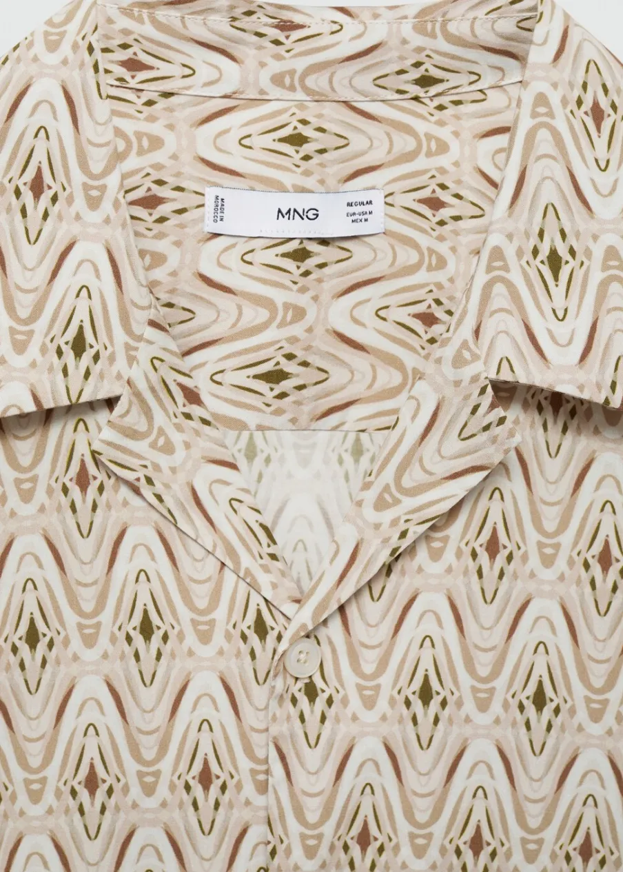 Krój regular. Tkanina mieszanka bawełny. Lejąca tkanina. Kołnierzyk typu bowling. Krótki rękaw. Prosty dół. Model ma 185 cm wzrostu i nosi rozmiar M. Zapięcie na guziki z przodu. Nadruk.