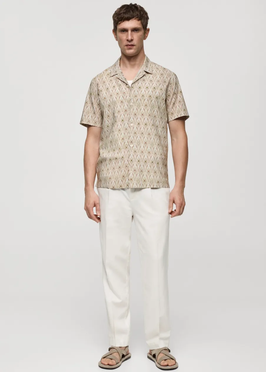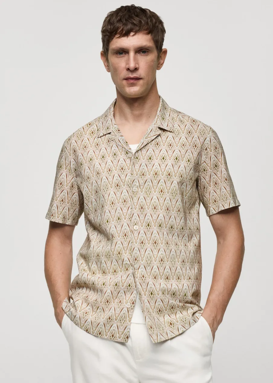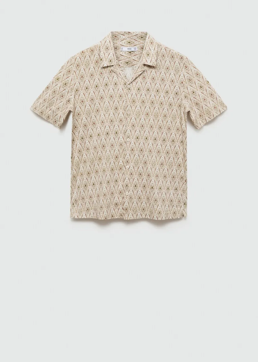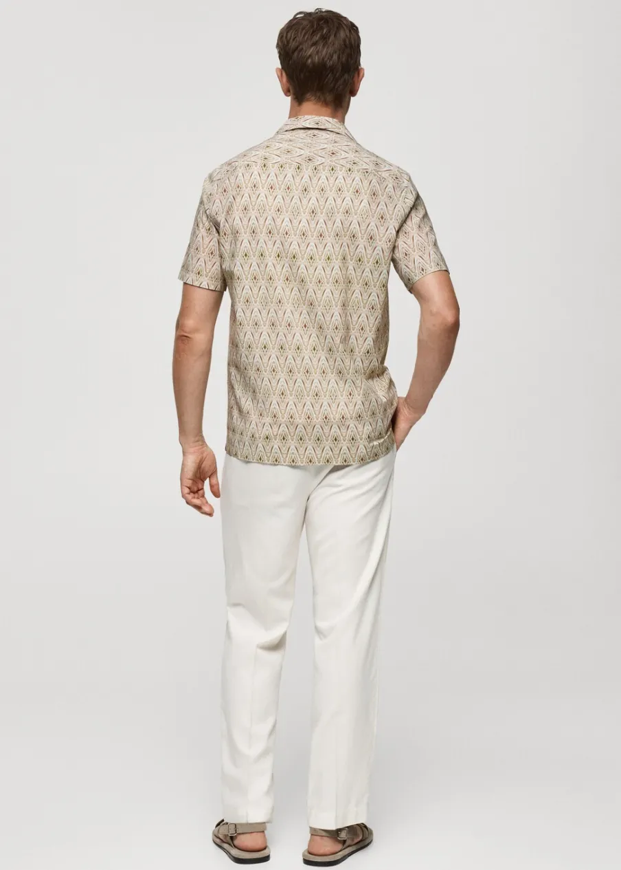 Krój regular. Tkanina mieszanka bawełny. Lejąca tkanina. Kołnierzyk typu bowling. Krótki rękaw. Prosty dół. Model ma 185 cm wzrostu i nosi rozmiar M. Zapięcie na guziki z przodu. Nadruk.