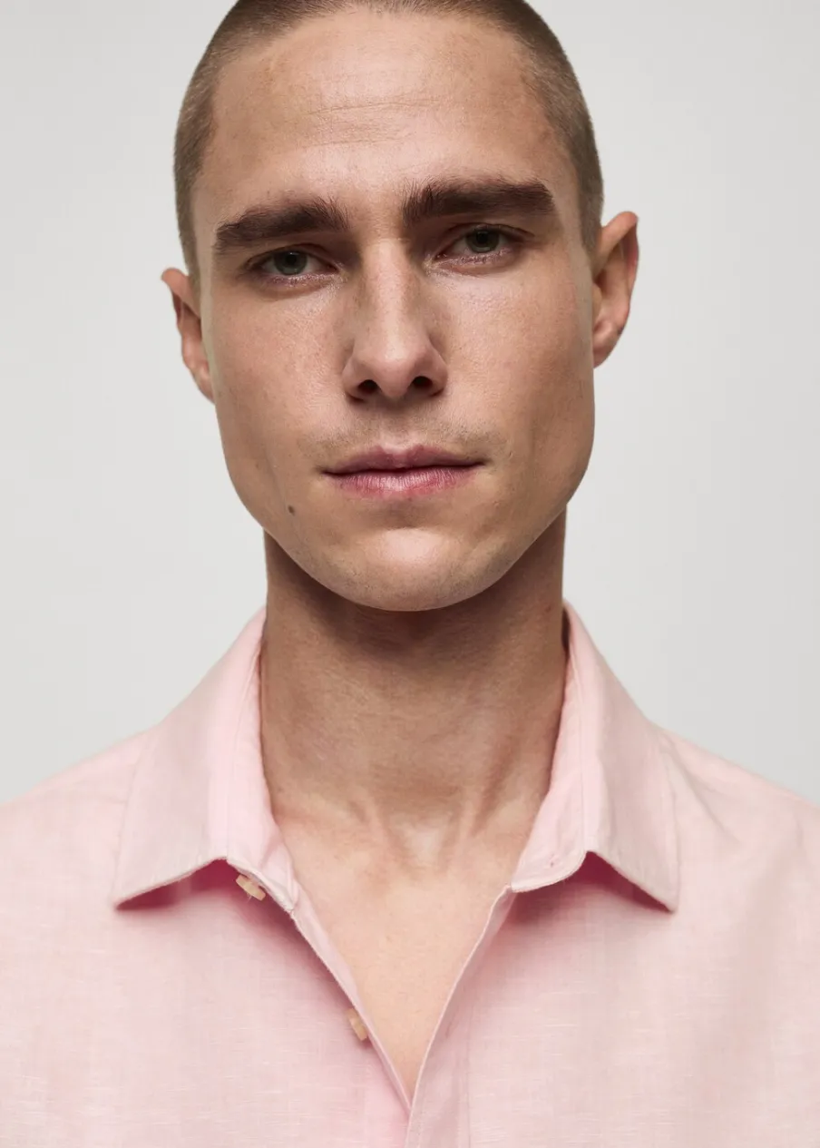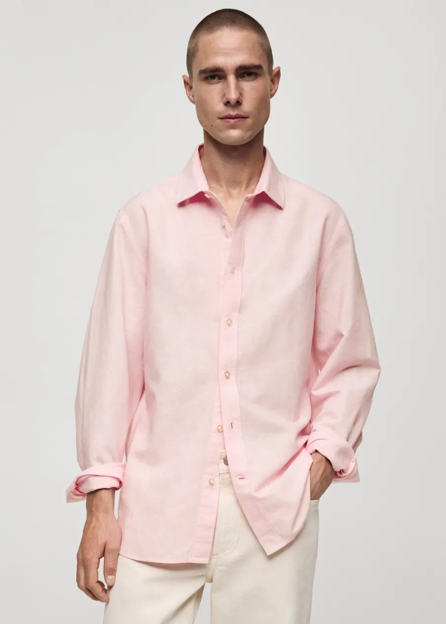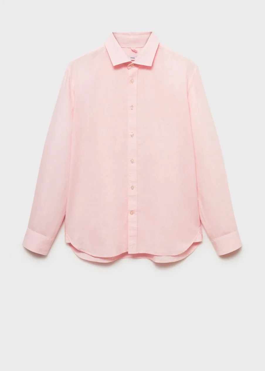 Wyłącznie online. Tkanina mieszanka bawełny i lnu. Koszulowy kołnierz. Długi rękaw z guzikami na mankietach. Model ma 183 cm wzrostu i nosi rozmiar M. Klasyczny krój. Zapięcie na guziki z przodu. Zaokrąglony dół.
