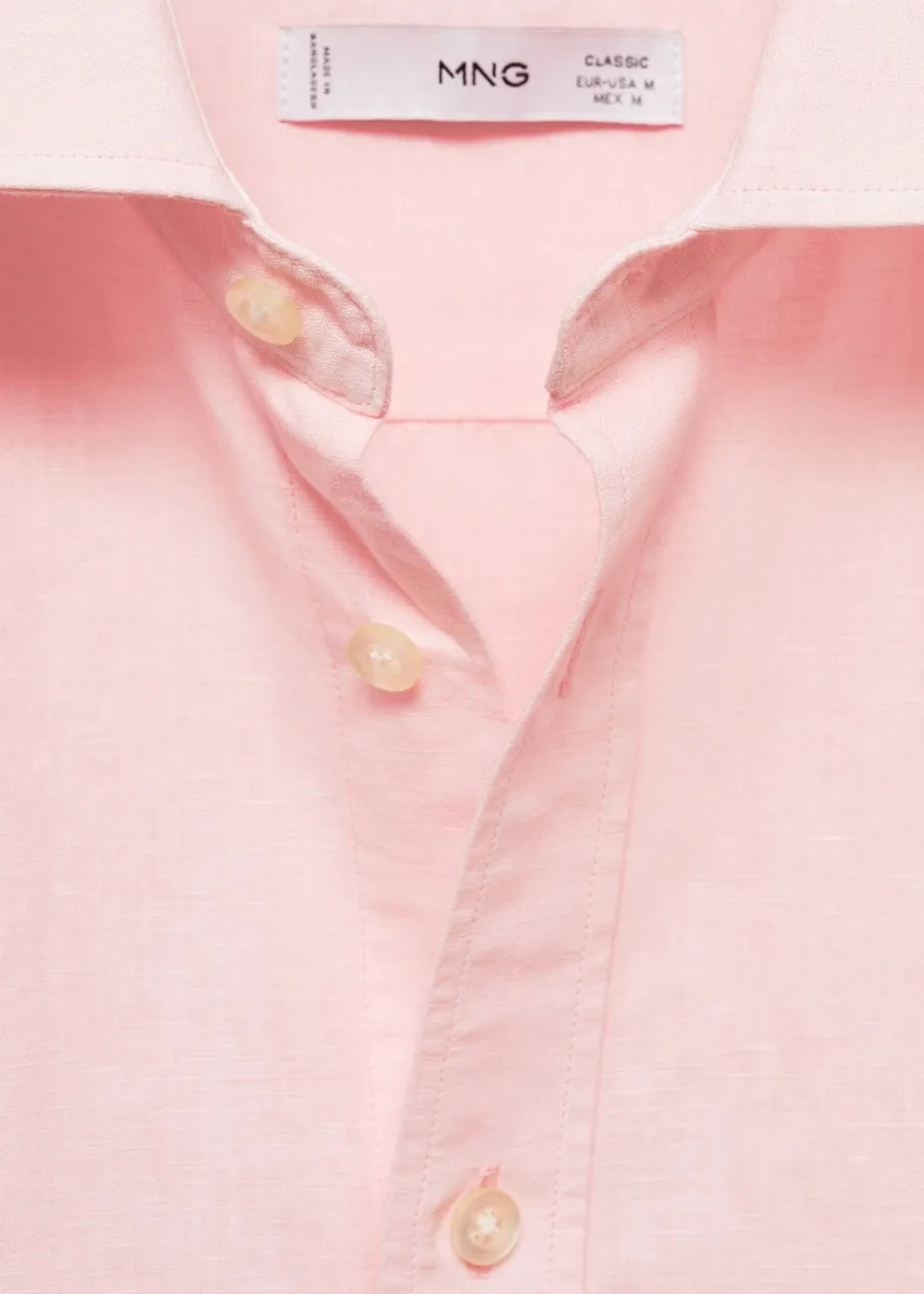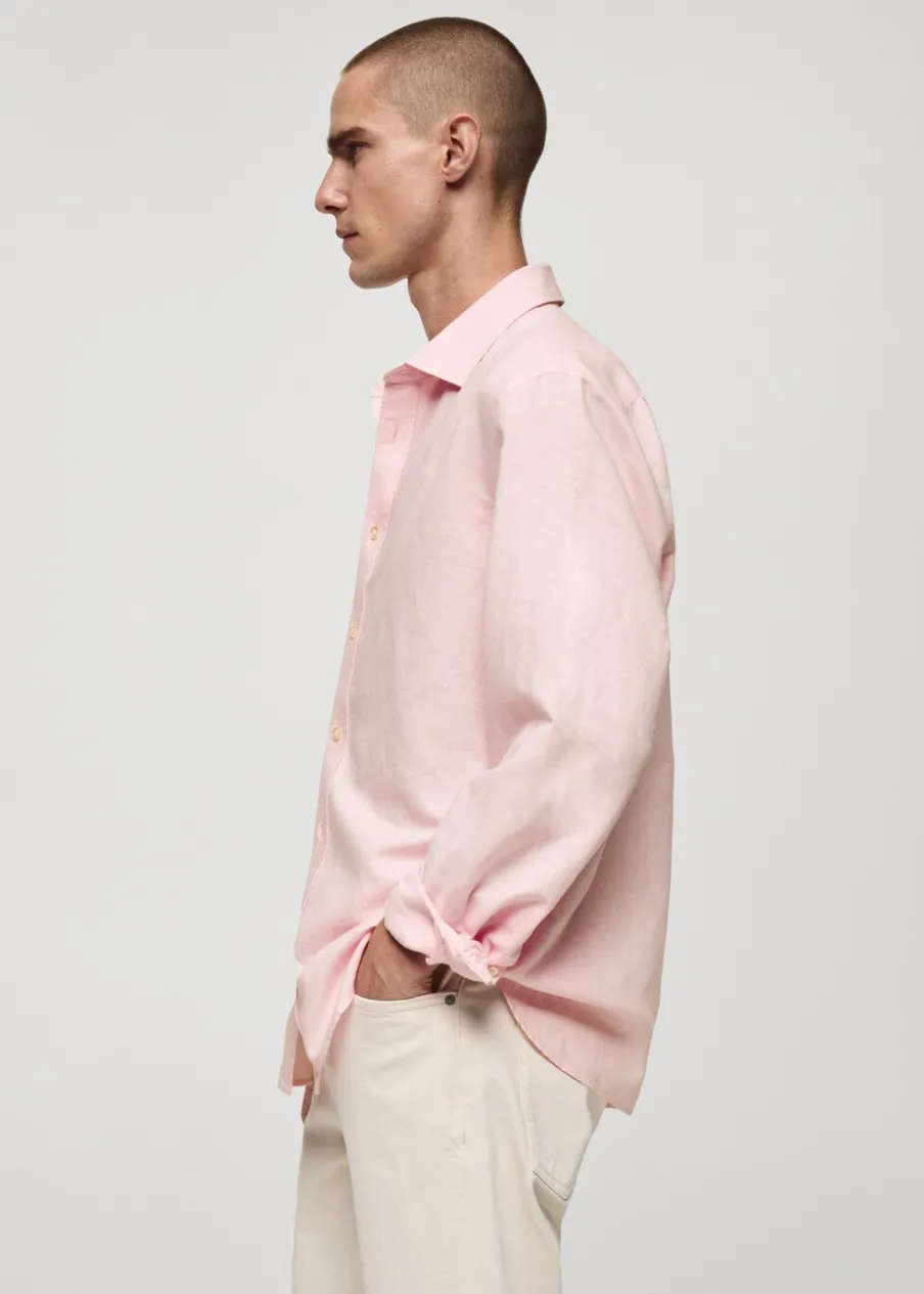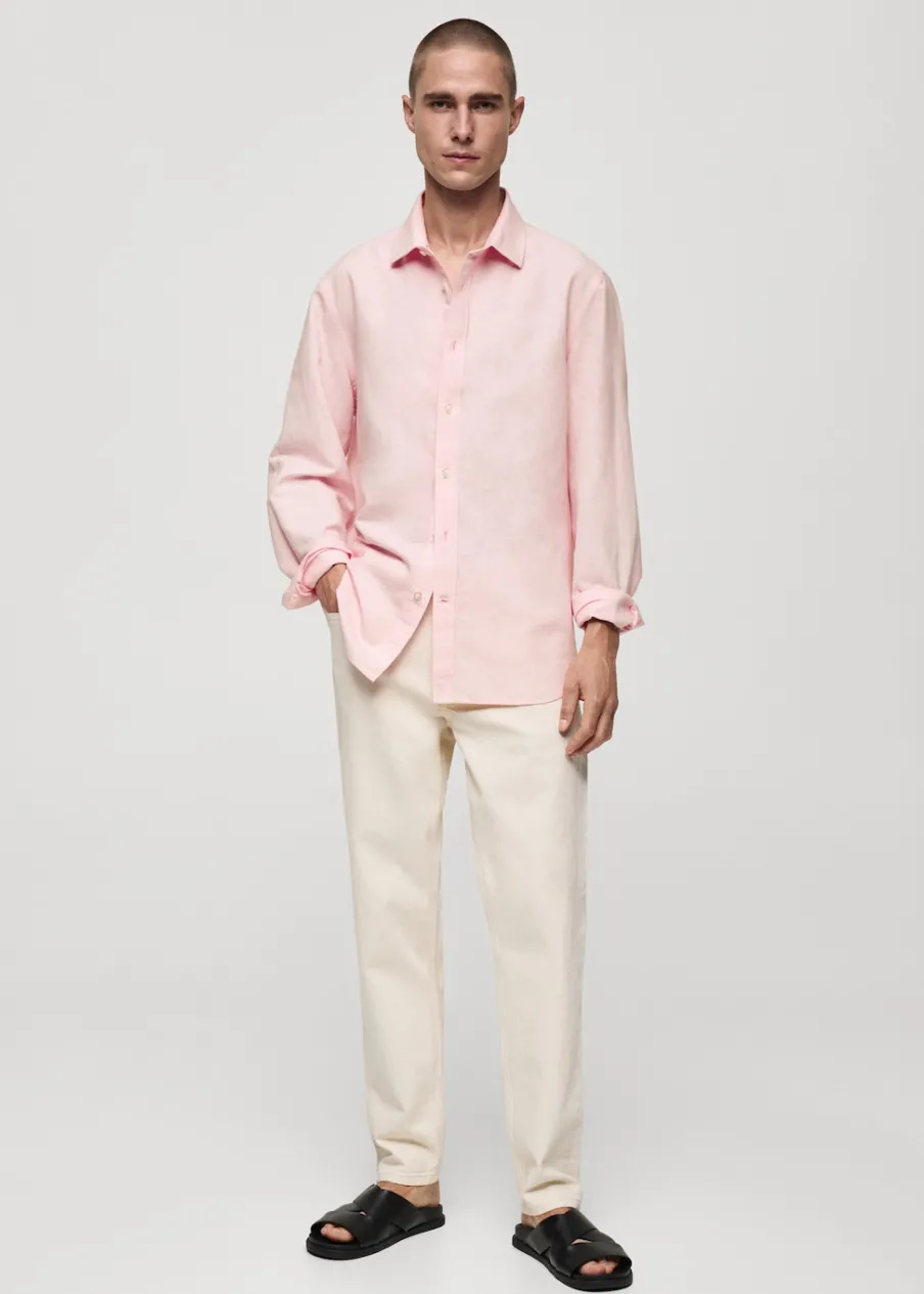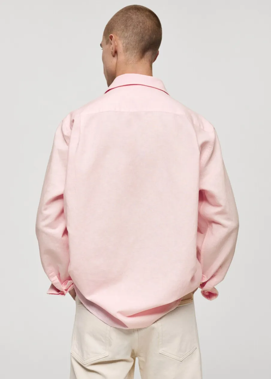 Wyłącznie online. Tkanina mieszanka bawełny i lnu. Koszulowy kołnierz. Długi rękaw z guzikami na mankietach. Model ma 183 cm wzrostu i nosi rozmiar M. Klasyczny krój. Zapięcie na guziki z przodu. Zaokrąglony dół.