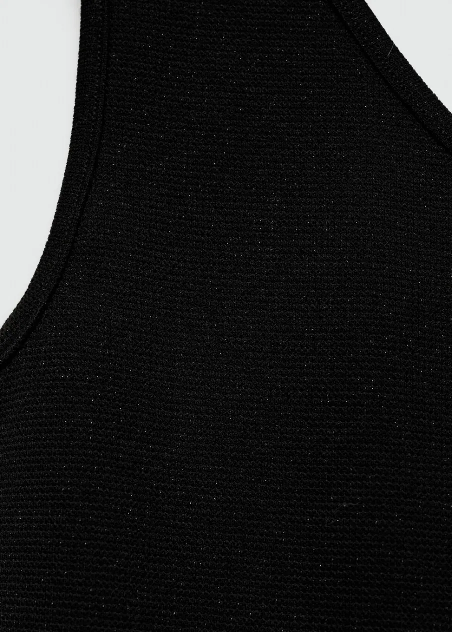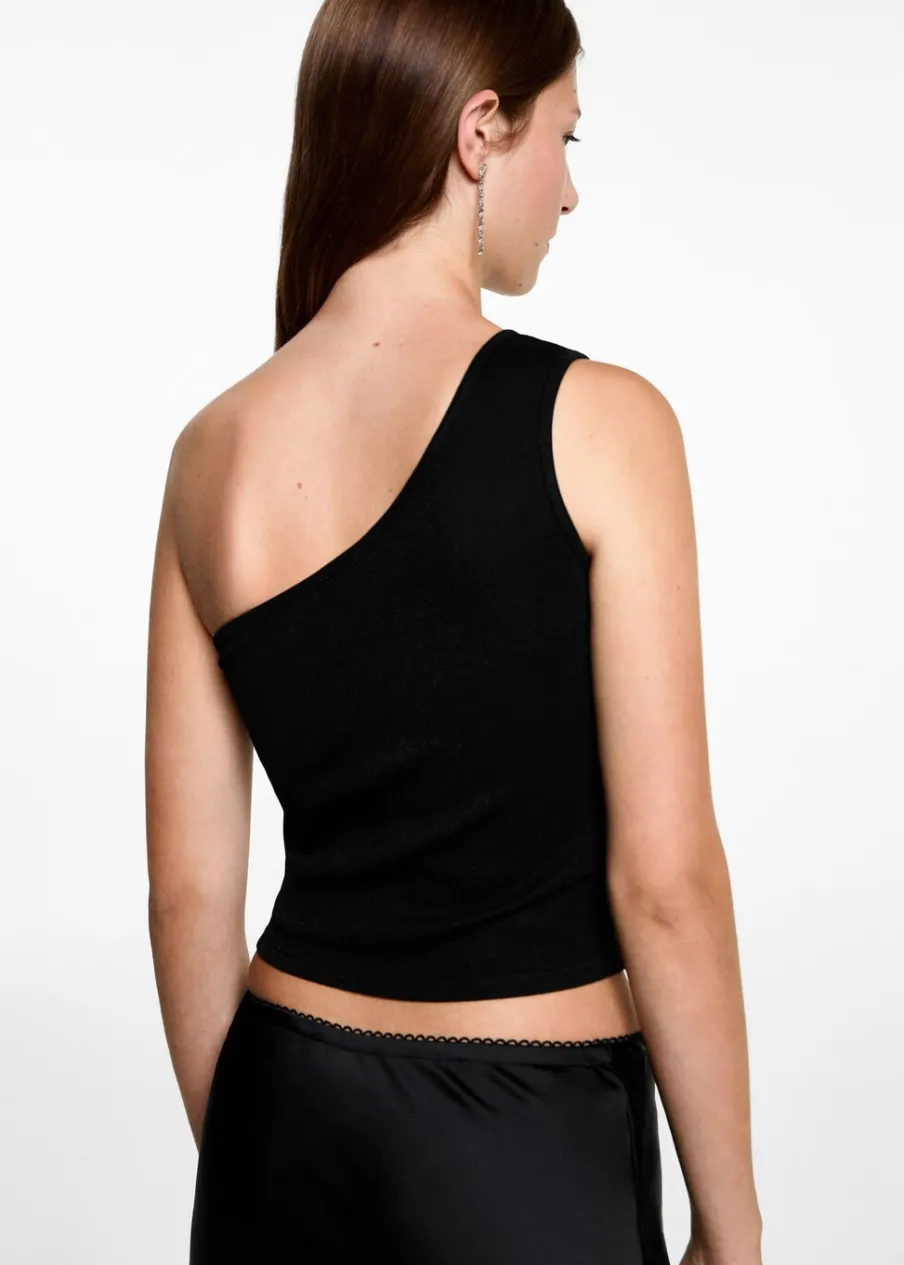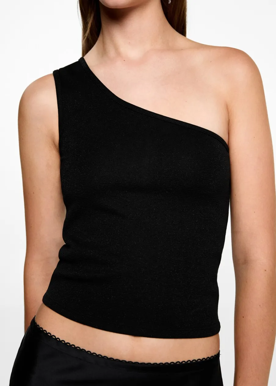 Kolekcja wieczorowa i imprezowa. Detal z lureksu. Asymetryczny krój. Deseń crop. Szerokie ramiączko. Modelka ma 172 cm wzrostu i nosi rozmiar M.