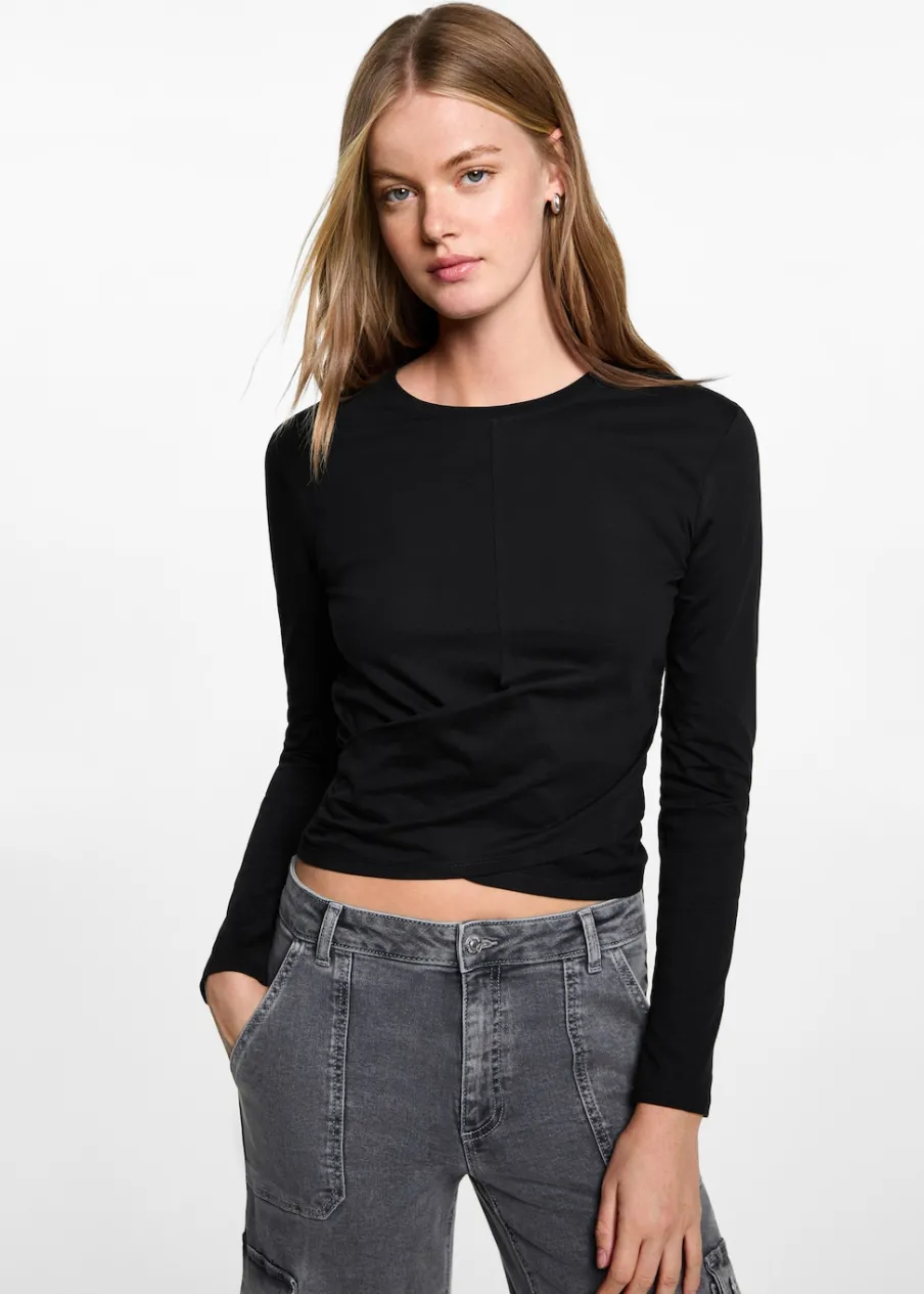Bawełna 100%. Model prosty. Okrągły dekolt. Długi rękaw. Marszczony detal. Modelka ma 172 cm wzrostu i nosi rozmiar M.