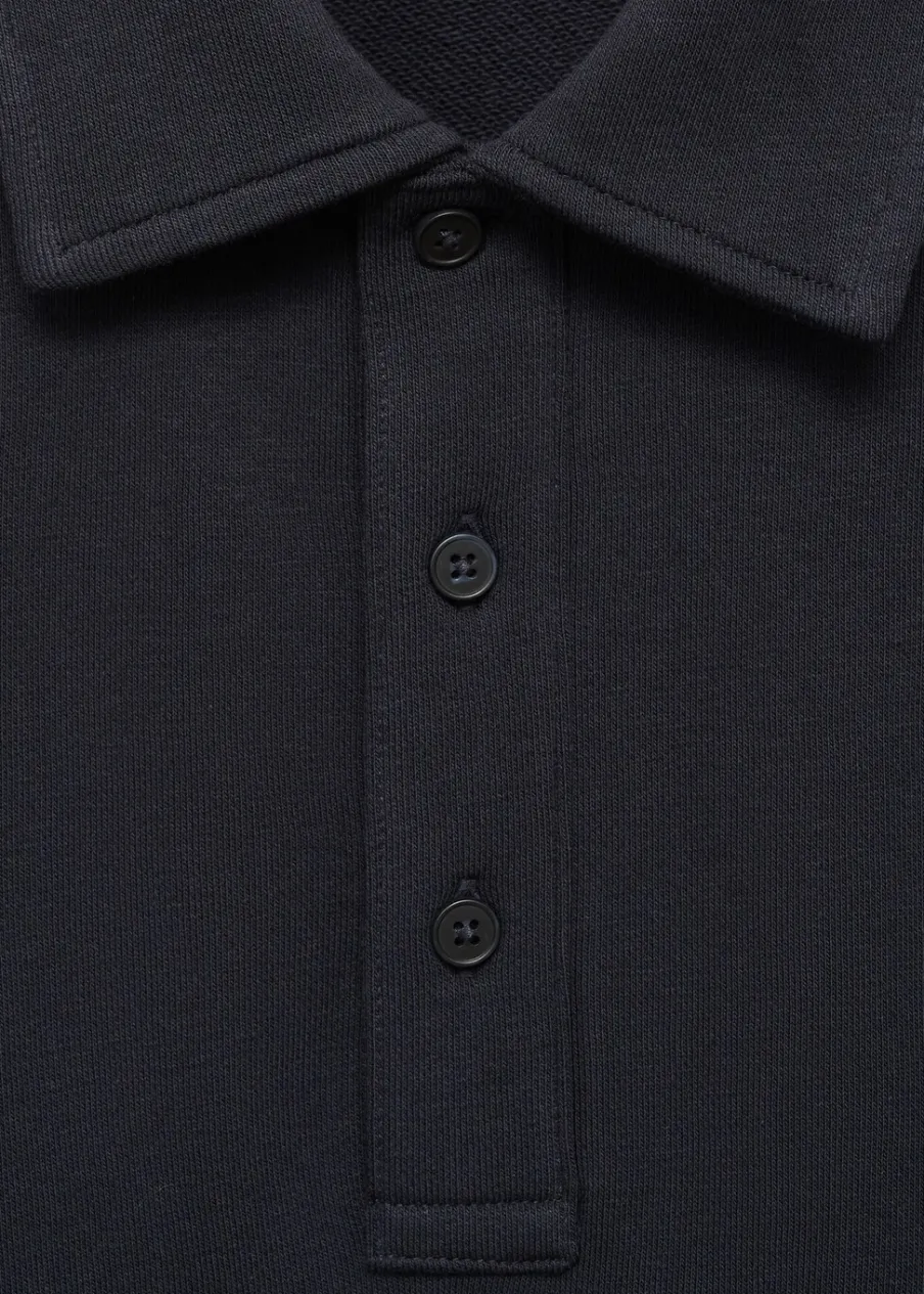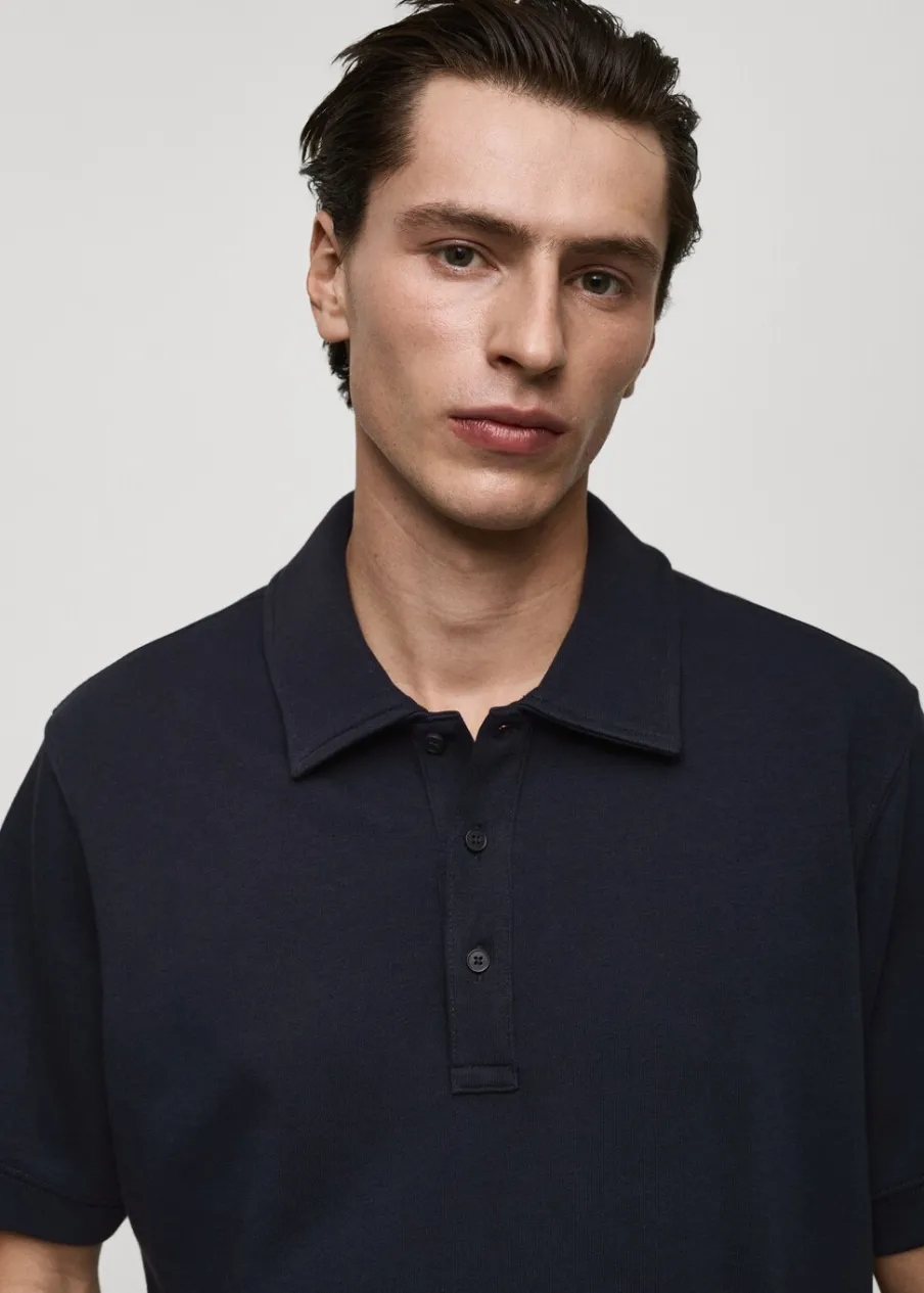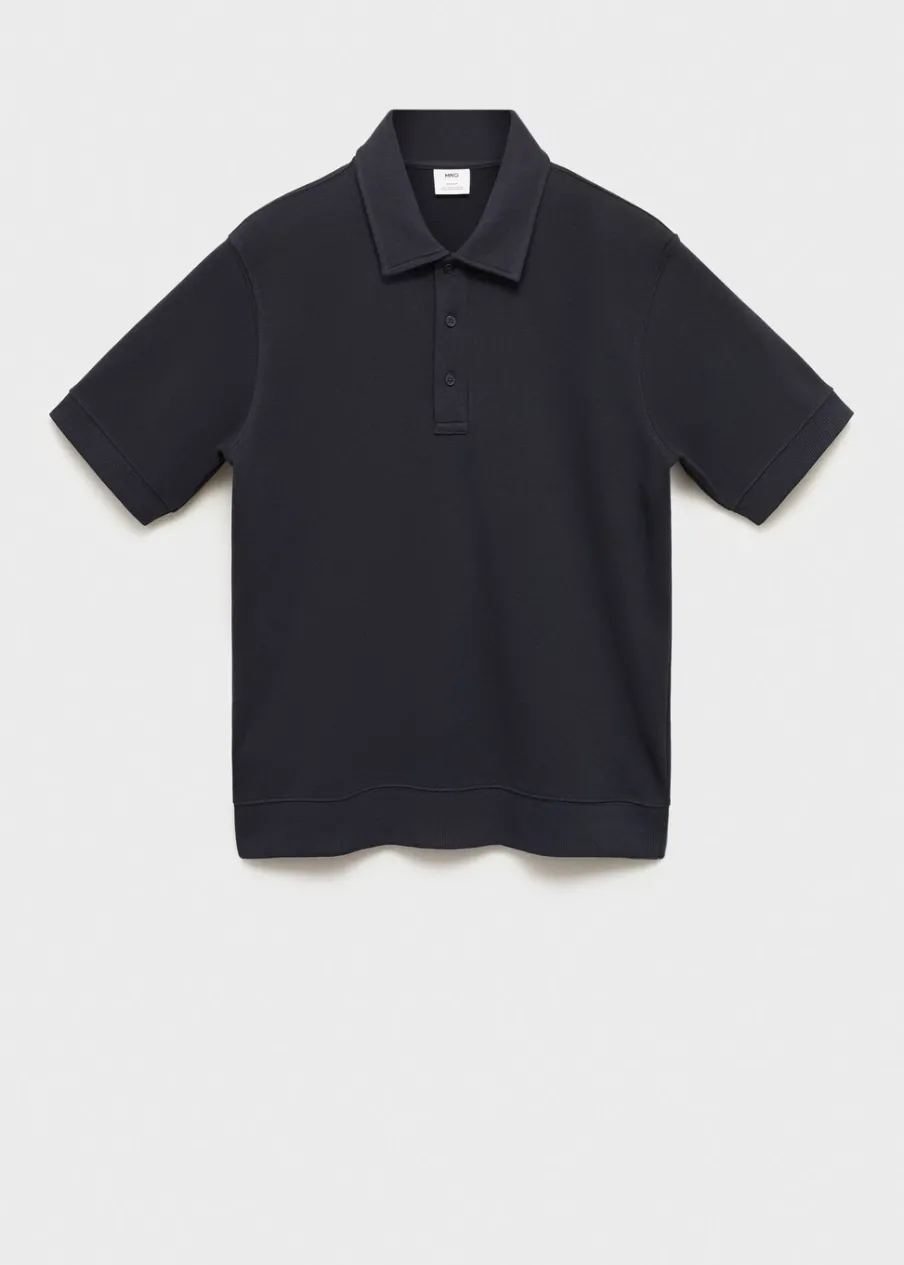 Krój regular. Tkanina mieszanka bawełny. Kołnierzyk polo z zapięciem na guziki. Krótki rękaw. Prosty dół. Prążkowane wykończenia. Model ma 185 cm wzrostu i nosi rozmiar M.