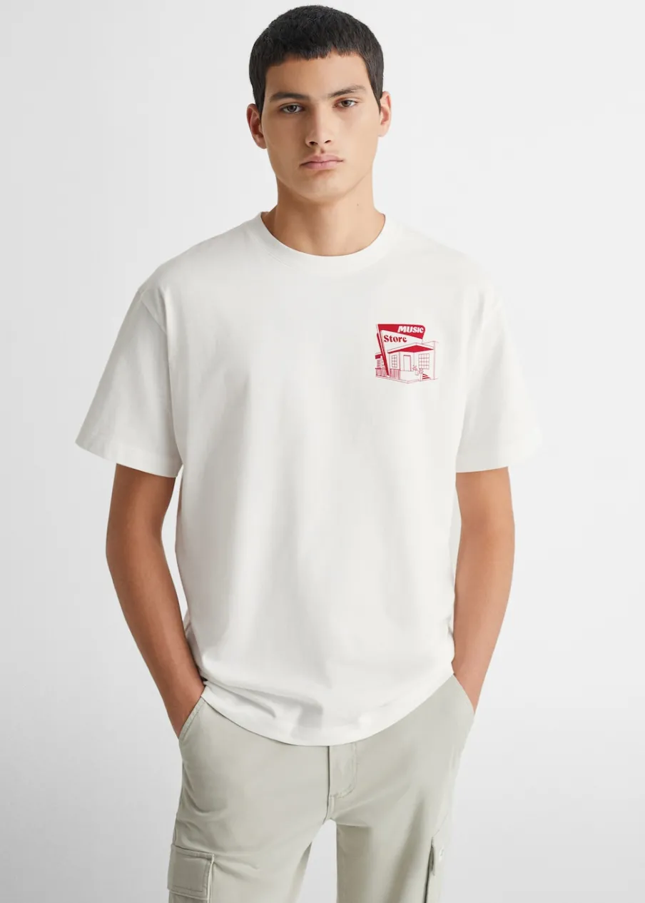 Opis100% bomull. Krój regular. Wzór z tyłu. Model prosty. Krótki rękaw. Okrągły dekolt.