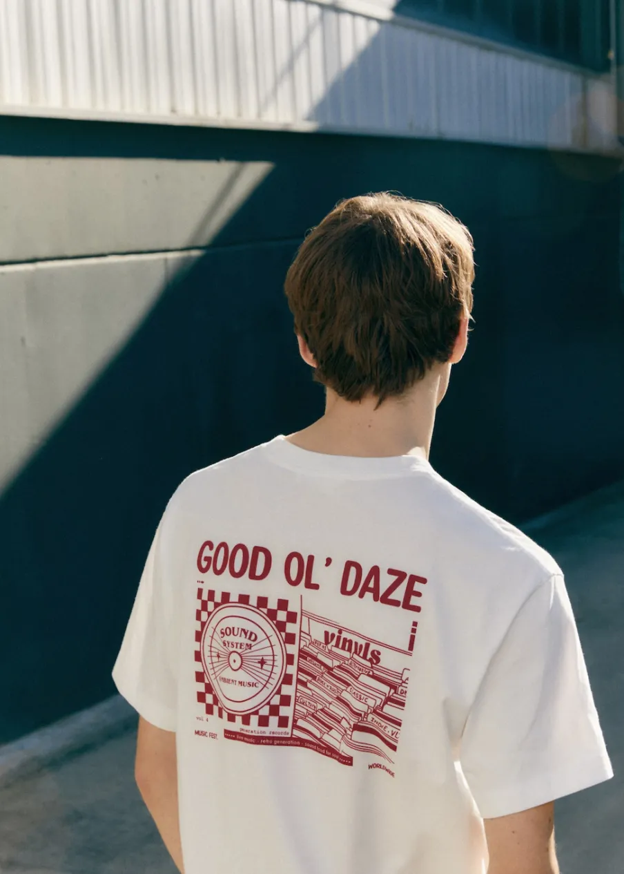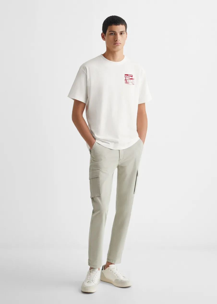 100% bomull. Krój regular. Wzór z tyłu. Model prosty. Krótki rękaw. Okrągły dekolt.