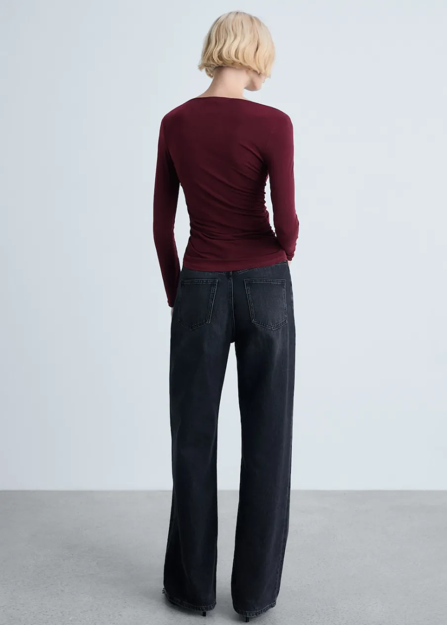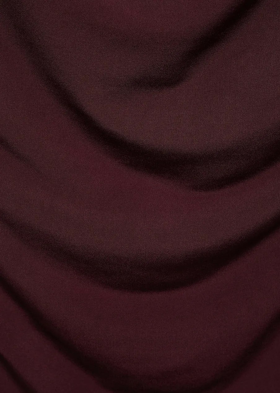 Elastyczna tkanina. Model wcięty. Model z drapowaniem. Dekolt w kształcie łódki. Długi rękaw. Bez zapięcia.
