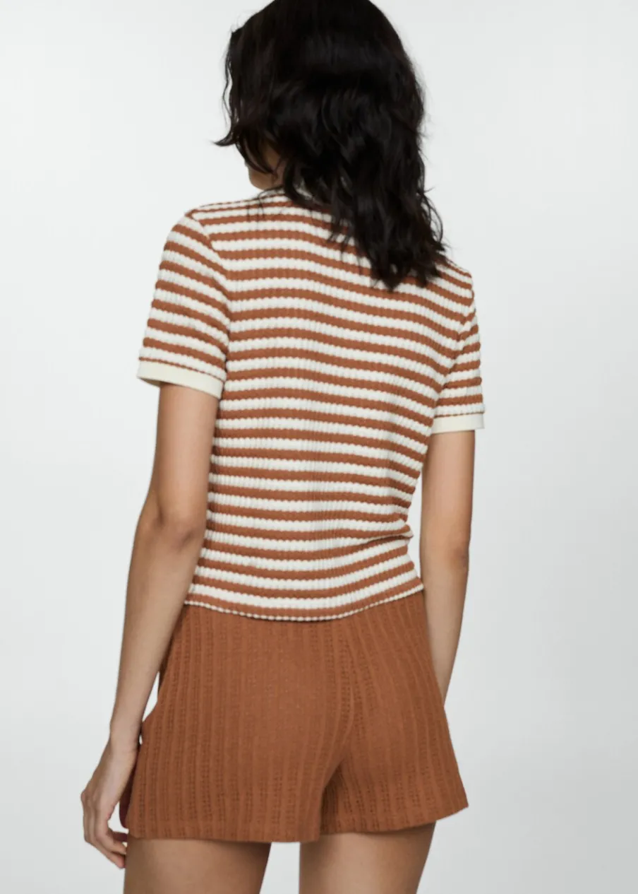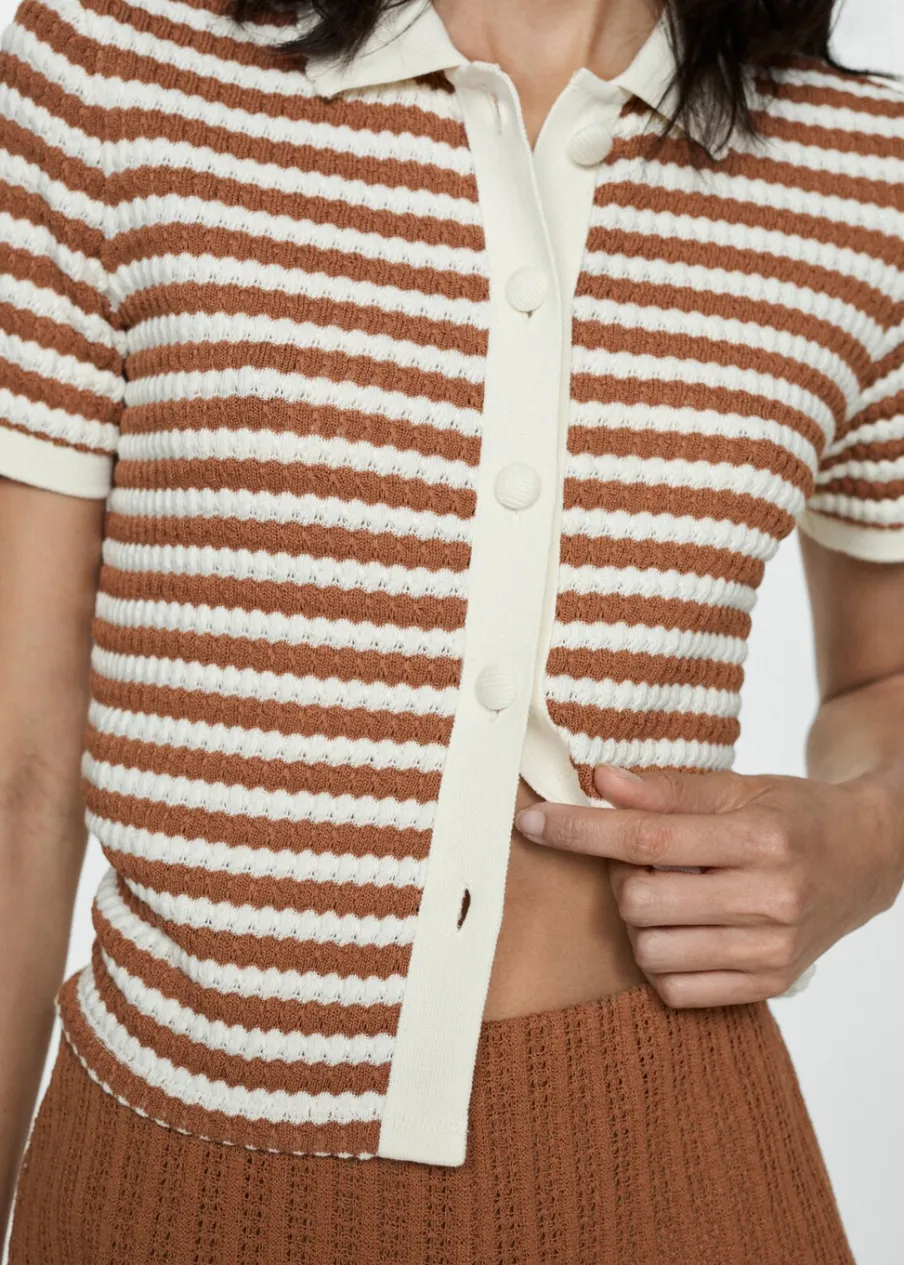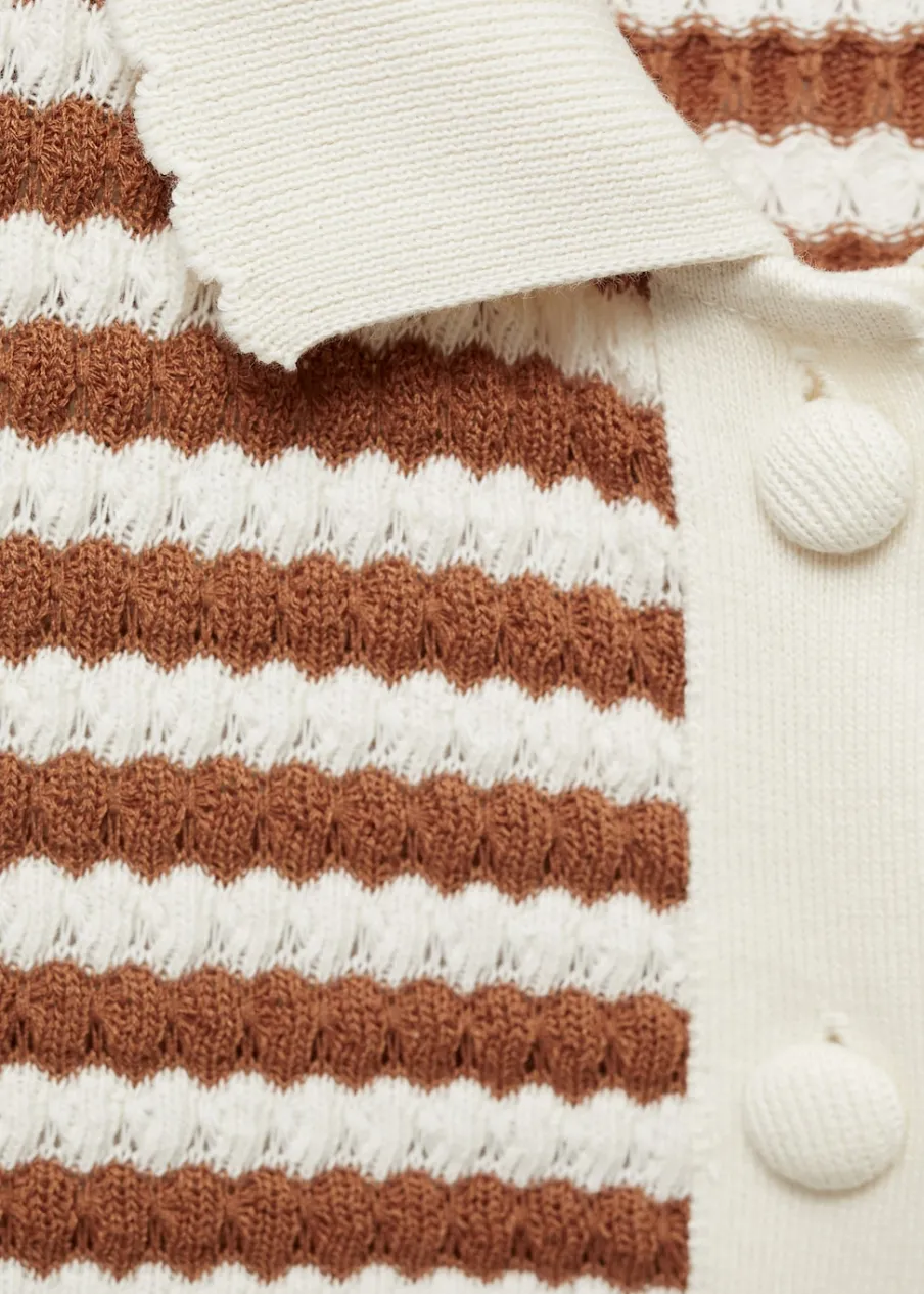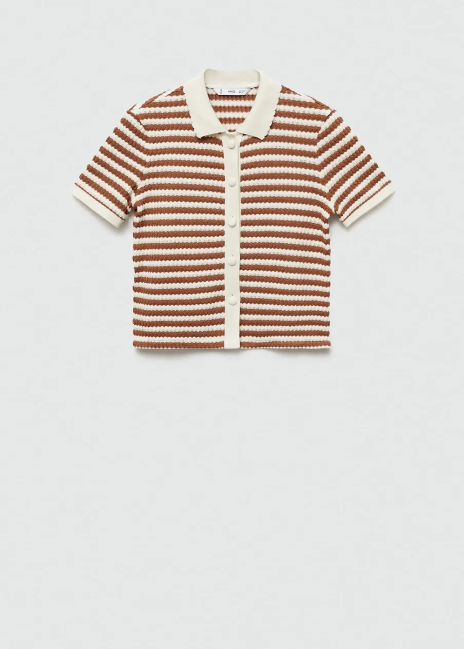Tkanina mieszanka bawełny. Dzianinowa tkanina. Model prosty. Model łączony. Koszulowy kołnierz. Krótki rękaw. Kontrastowe wykończenia. Szydełkowa tkanina. Zapięcie na guziki z przodu.