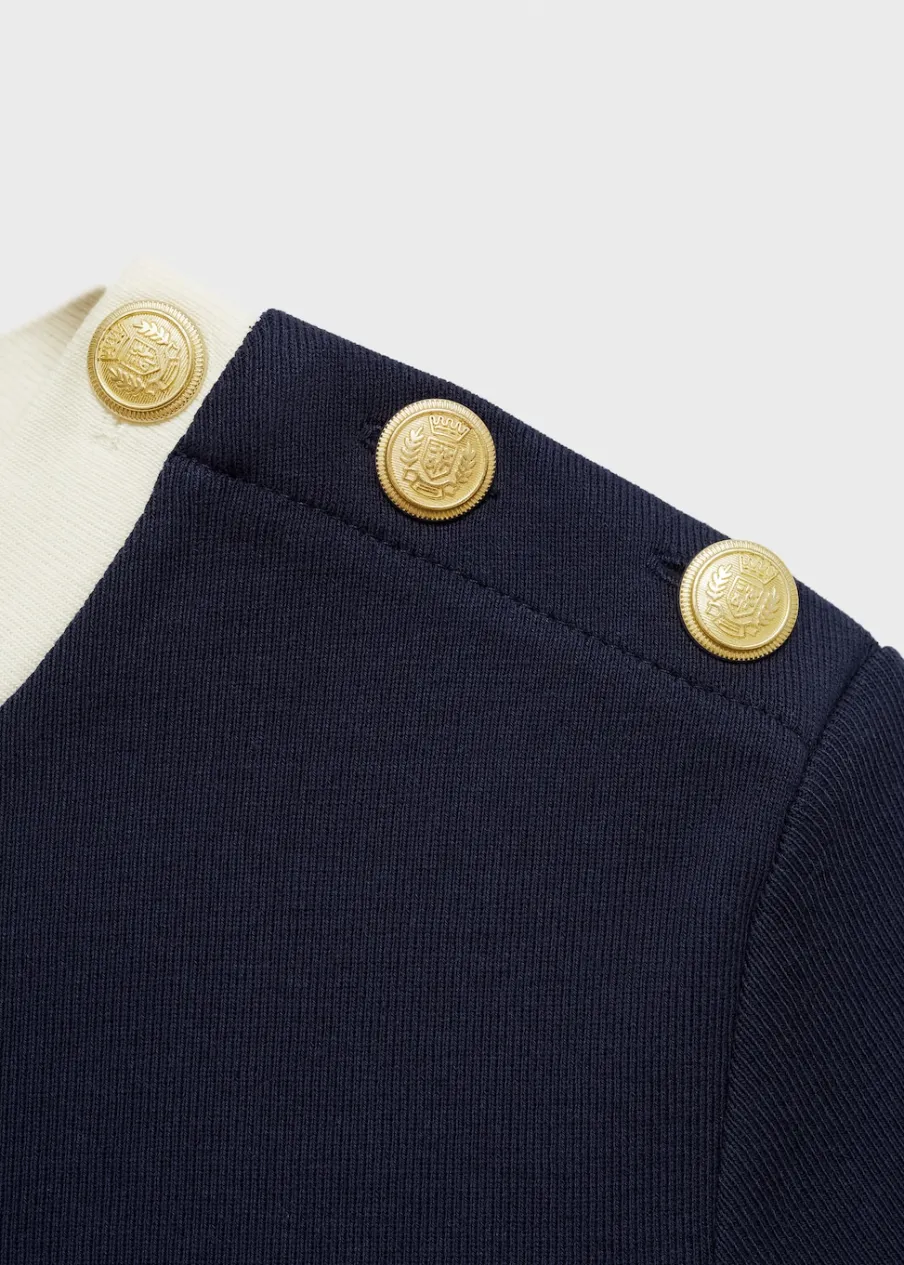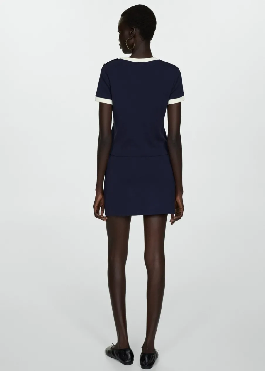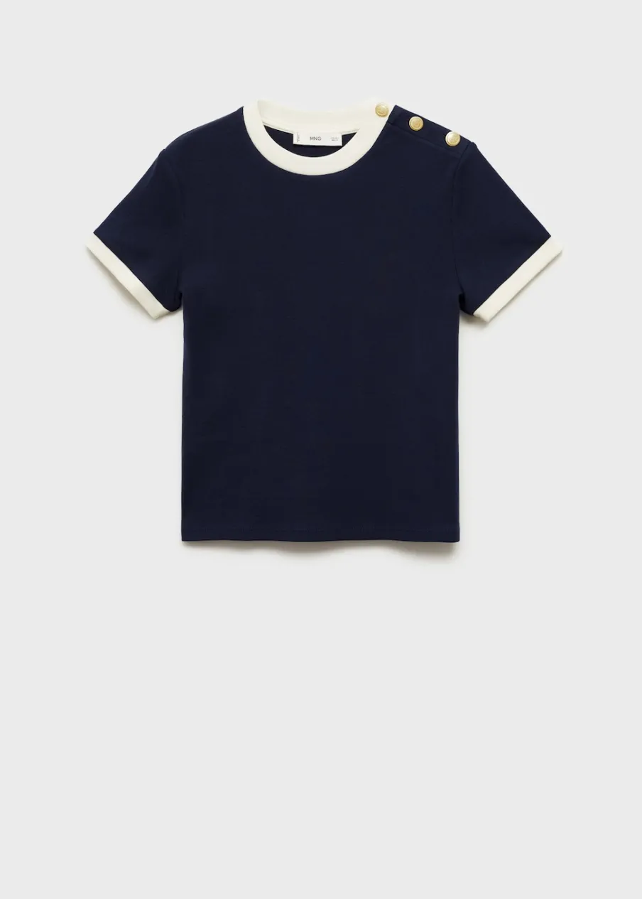 Wąski krój. Model dostępny w wersji gładkiej lub ze wzorem. Okrągły dekolt. Krótki rękaw. Kontrastowy detal. Ozdobne guziki. Bez zapięcia. Wzór w paski. Tkanina z 100% bawełny.