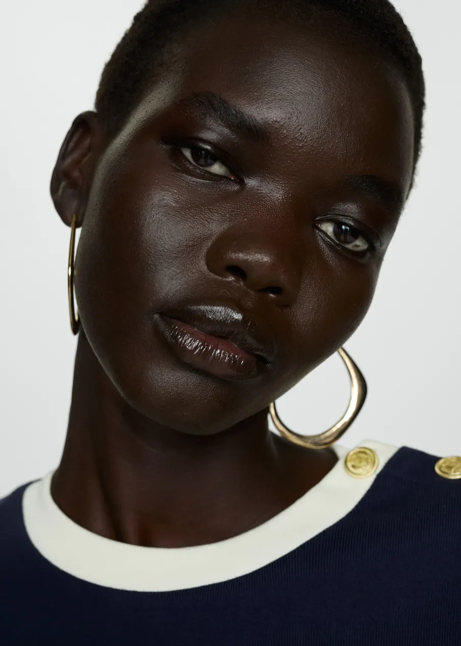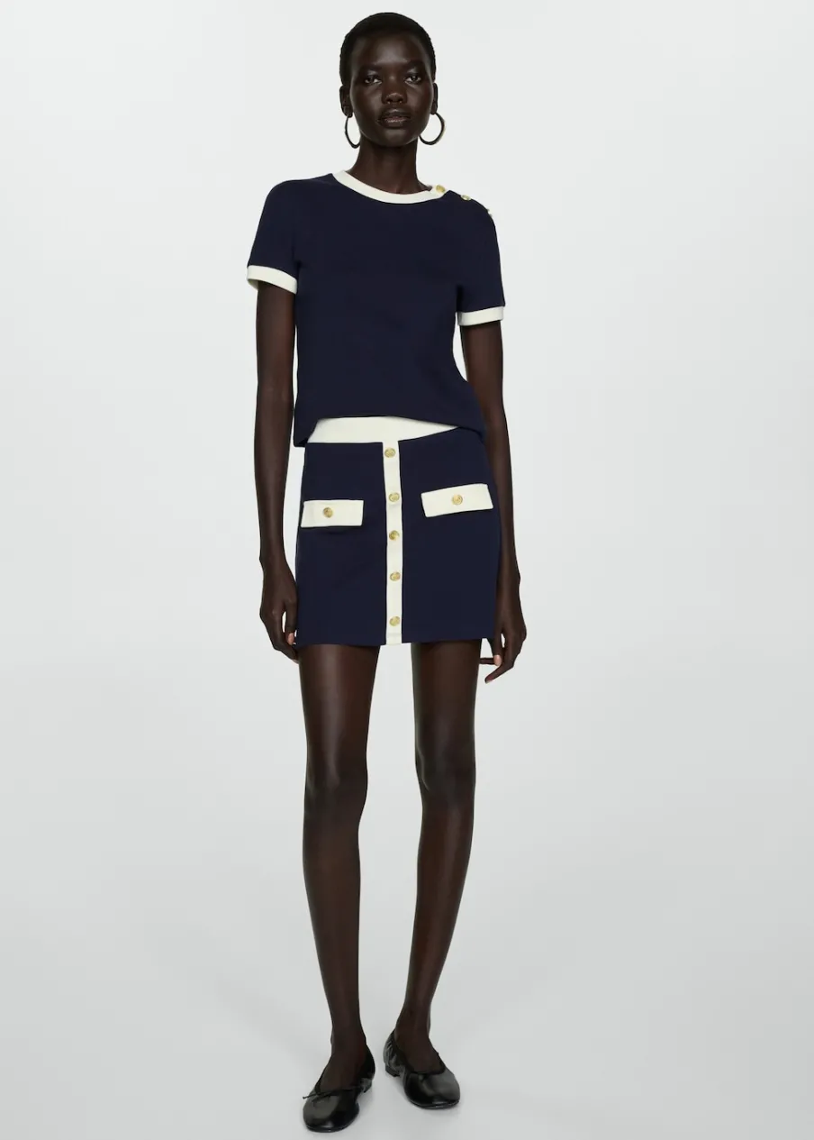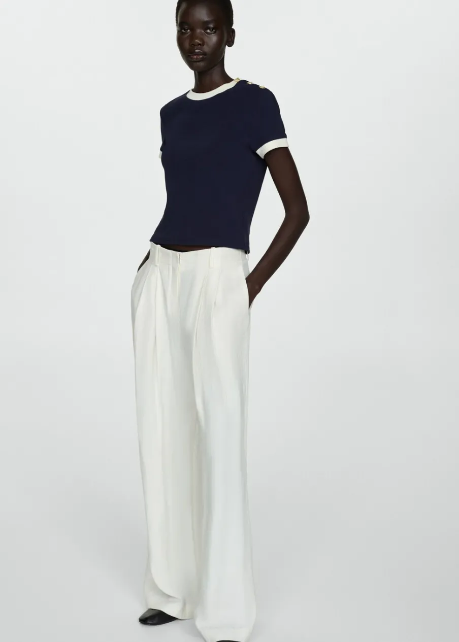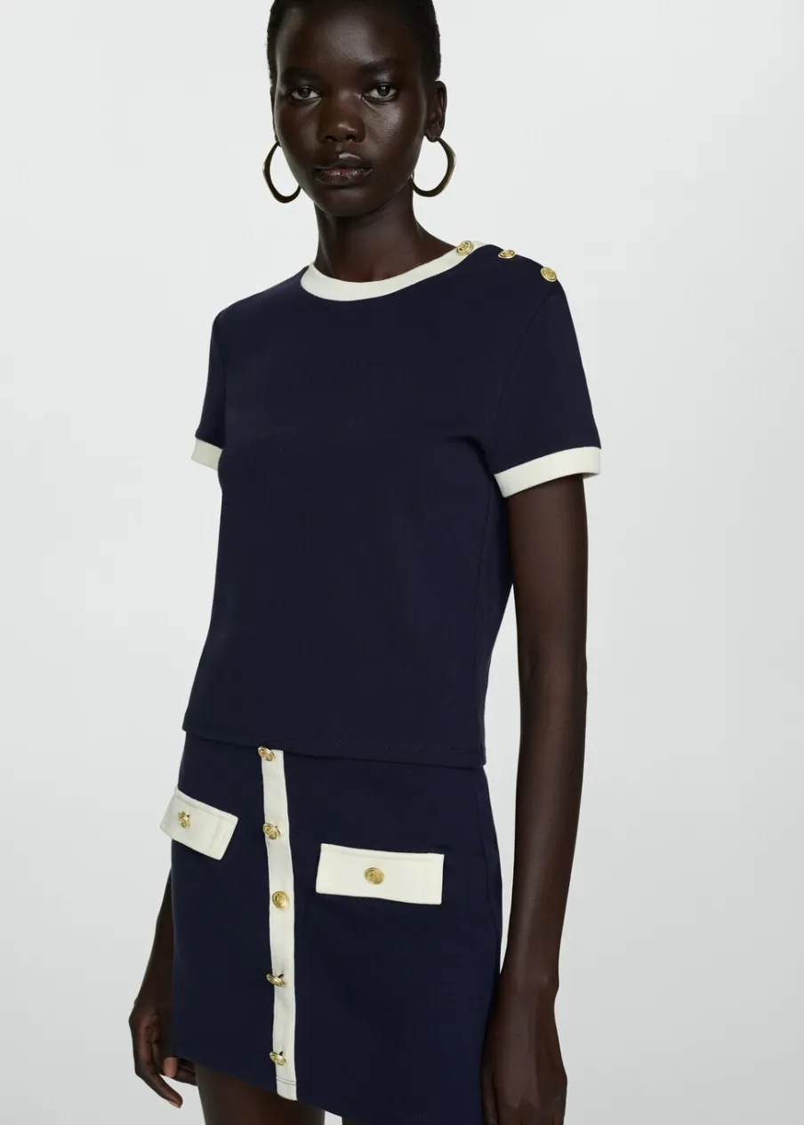Wąski krój. Model dostępny w wersji gładkiej lub ze wzorem. Okrągły dekolt. Krótki rękaw. Kontrastowy detal. Ozdobne guziki. Bez zapięcia. Wzór w paski. Tkanina z 100% bawełny.