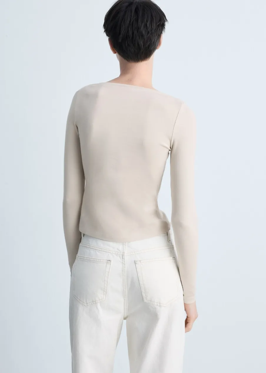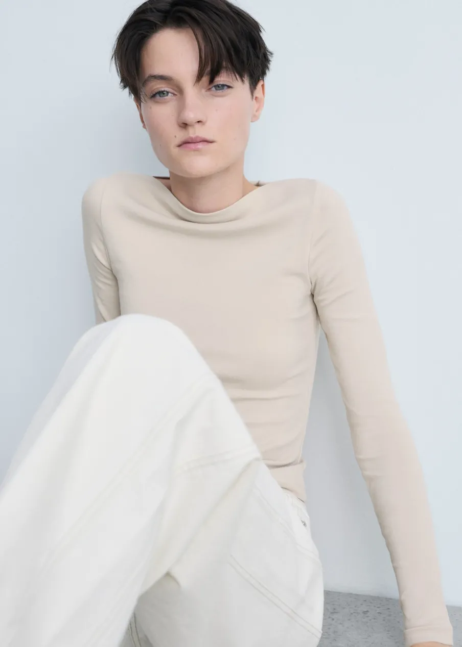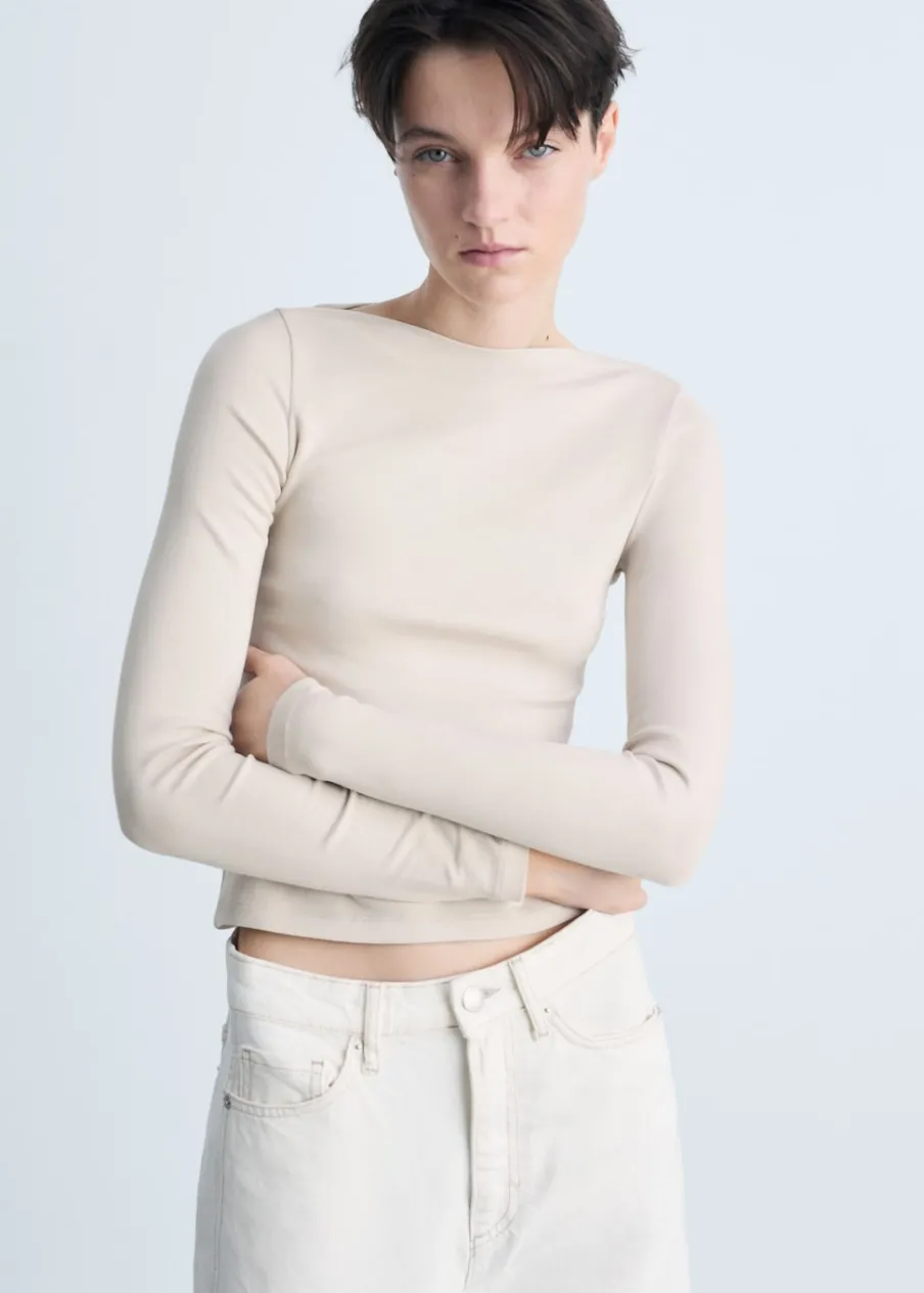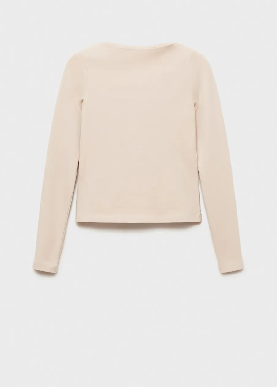 Bawełniana tkanina. Slim-fit. Fason o średniej długości. Dekolt w kształcie łódki. Długi rękaw. Bez zapięcia.