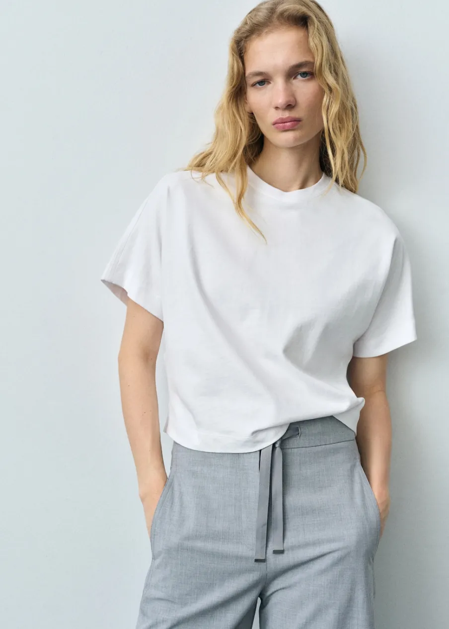 Krój: oversize. Krótki krój. Okrągły dekolt. Krótki rękaw. Bez zapięcia.
