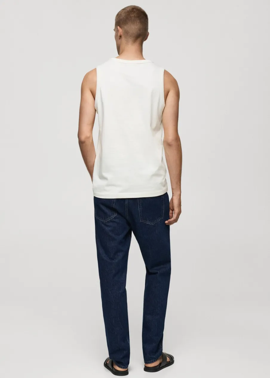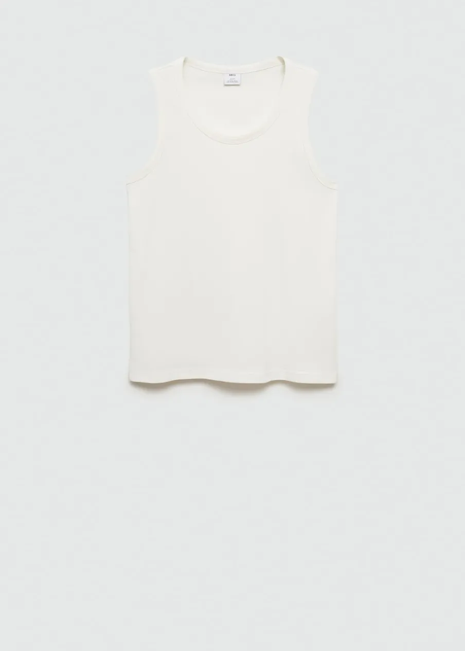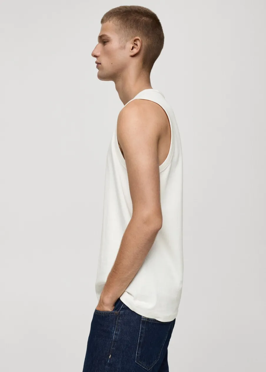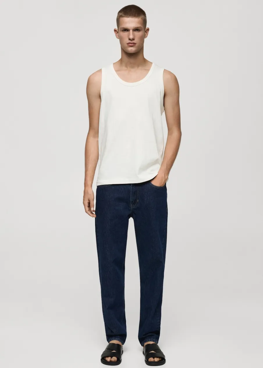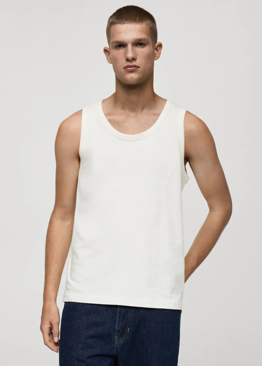 Krój regular. Okrągły dekolt z prążkowanym wykończeniem. Szerokie ramiączka. Prosty dół. Model ma 187 cm wzrostu i nosi rozmiar M. Model typu tank top. Tkanina z 100% bawełny.