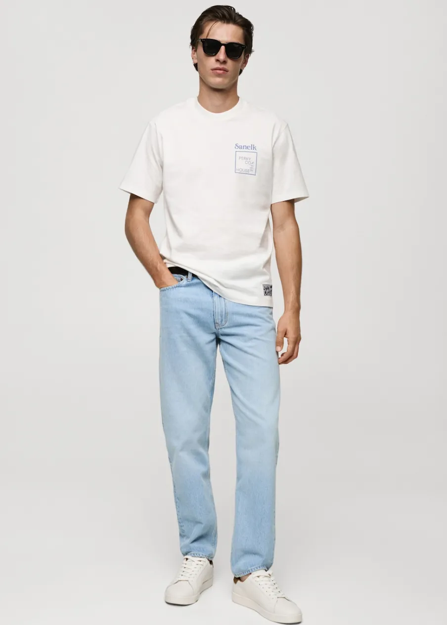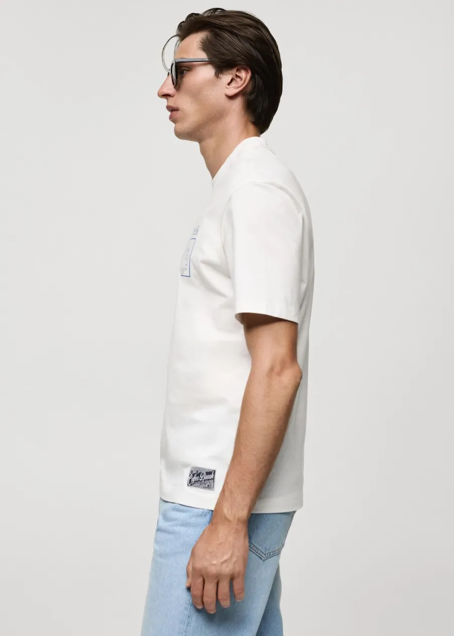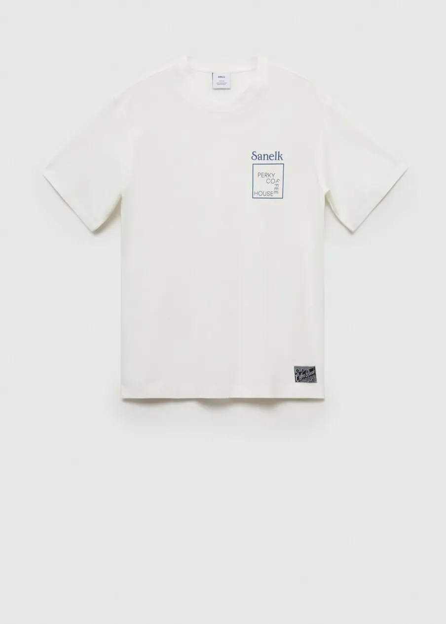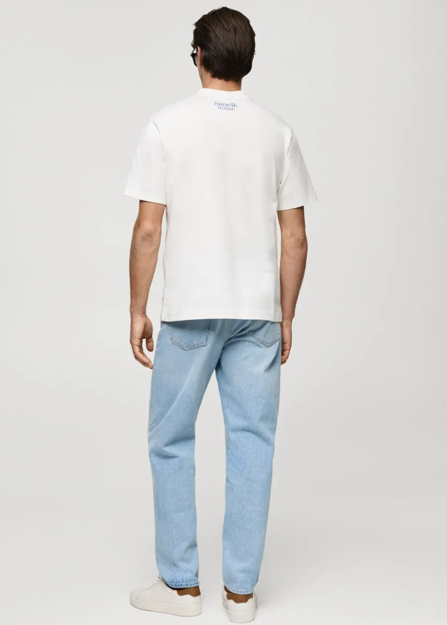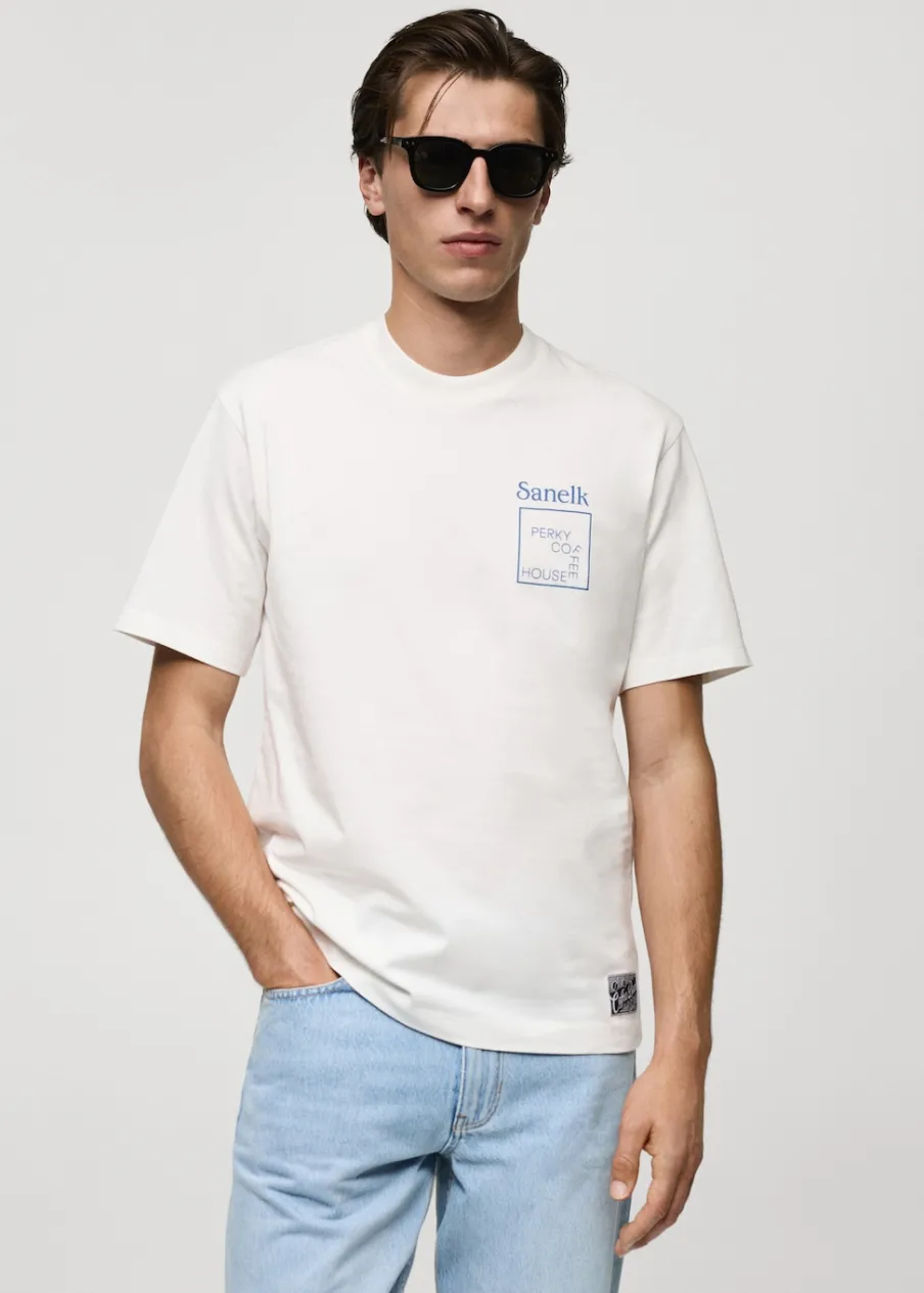 Krój regular. Nadruk na klatce piersiowej. Okrągły dekolt. Krótki rękaw. Nadruki z tyłu. Prosty dół. Model ma 187 cm wzrostu i nosi rozmiar M. Naszywka u dołu. Tkanina z 100% bawełny.