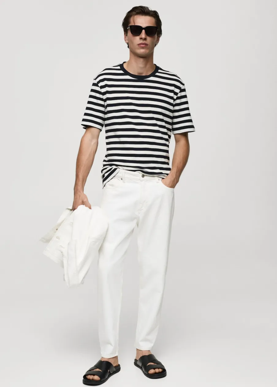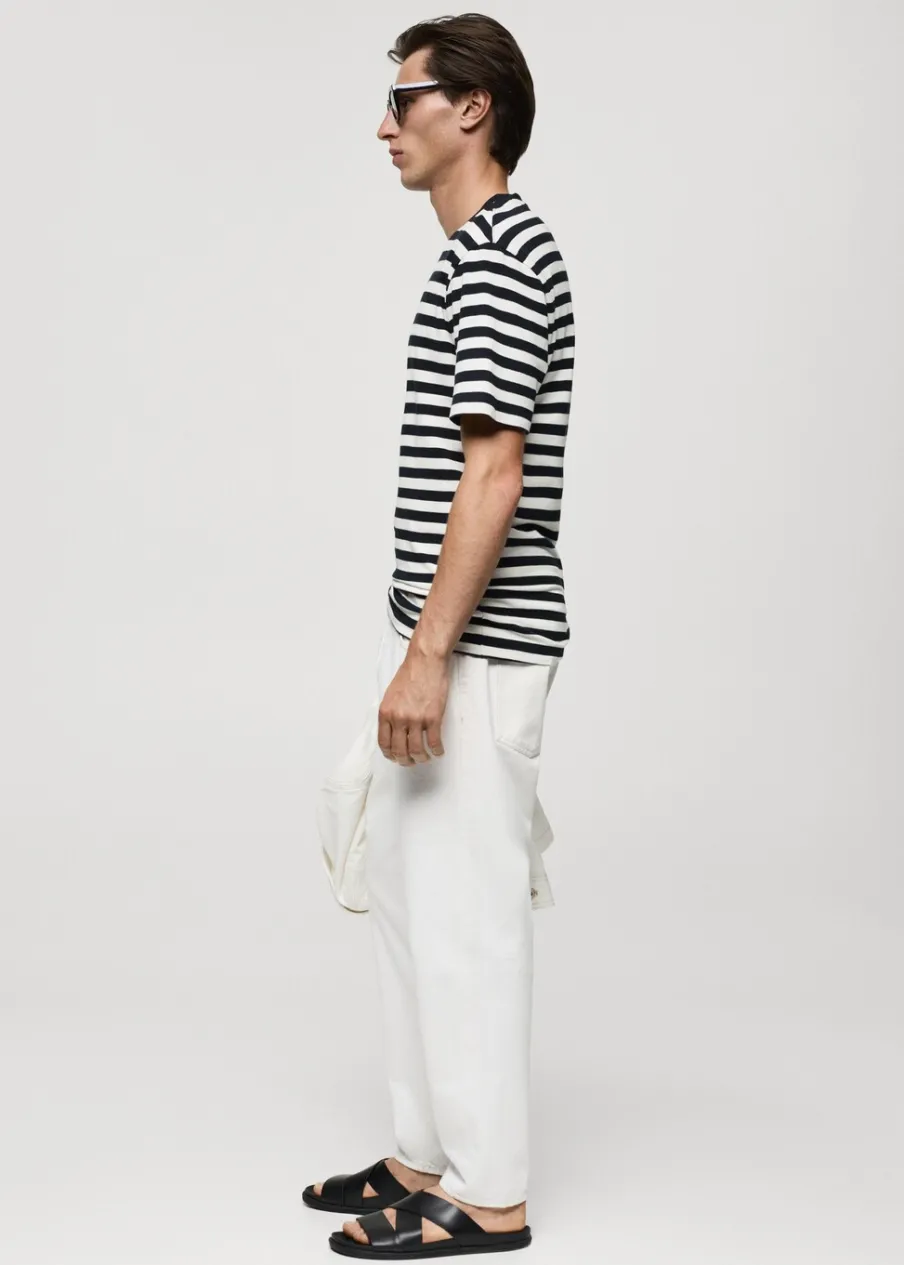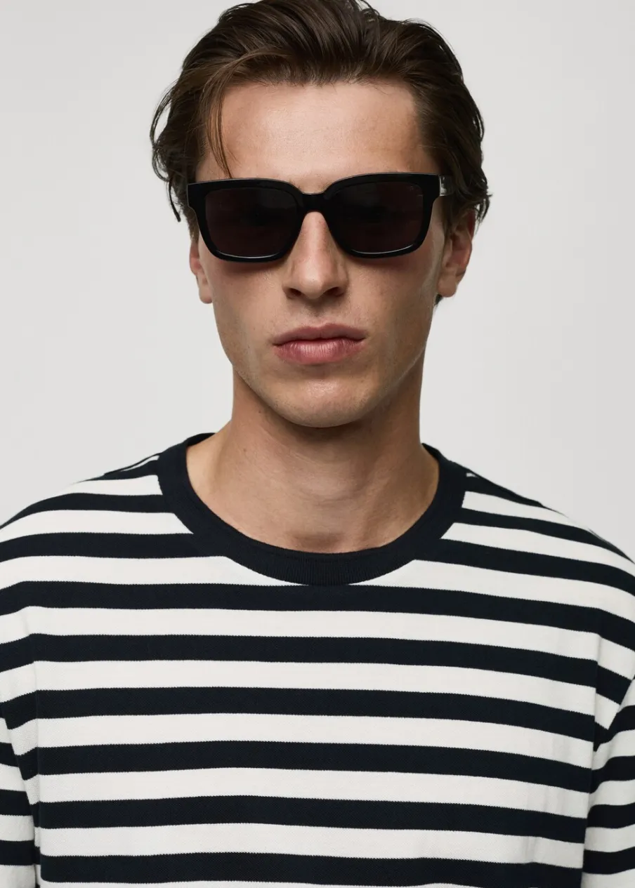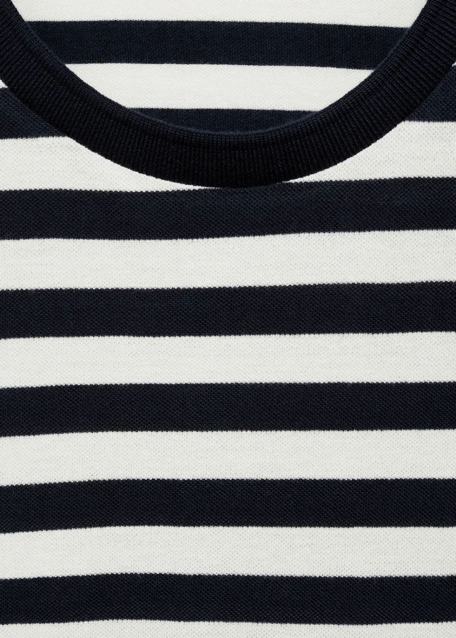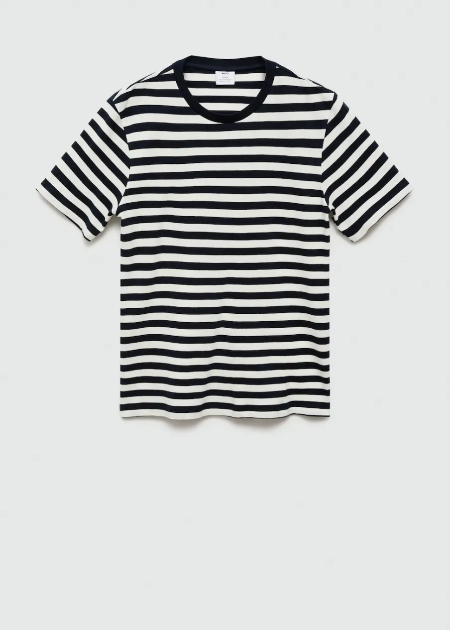 Krój regular. Kontrastowy, koszulowy kołnierz. Nadruk w poziome paski. Krótki rękaw. Prosty dół. Model ma 185 cm wzrostu i nosi rozmiar M. Tkanina z 100% bawełny.