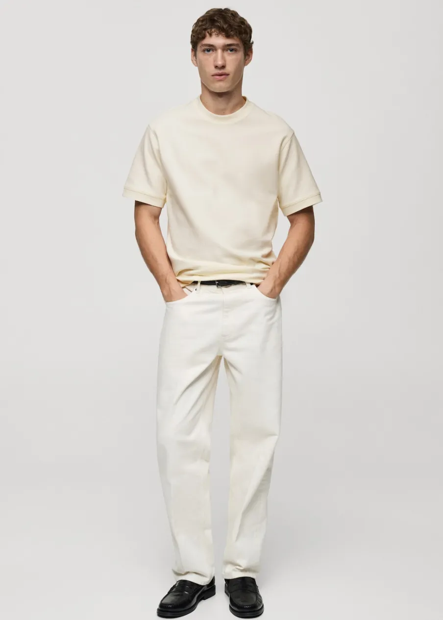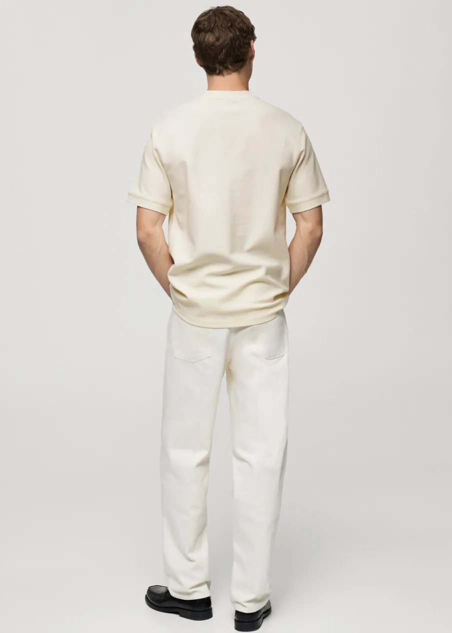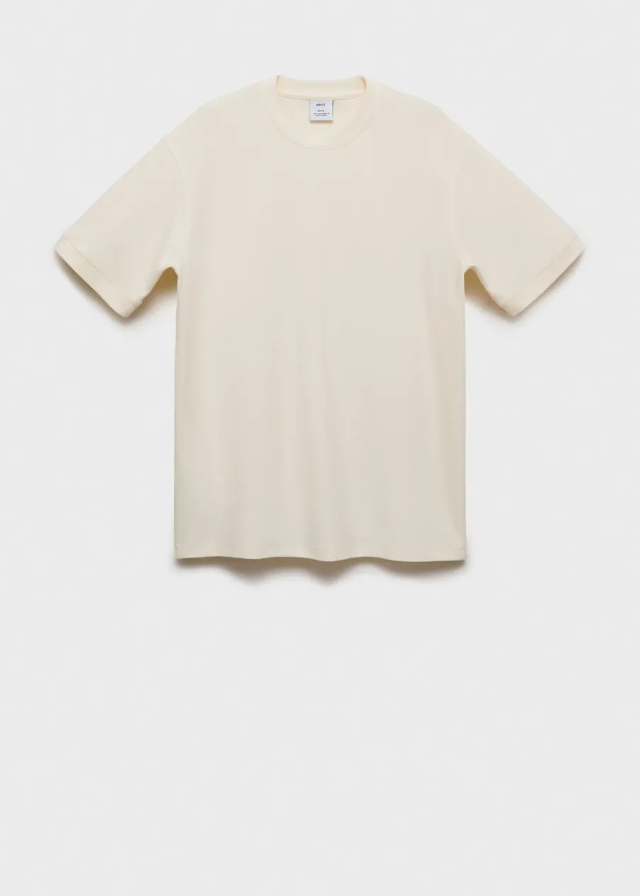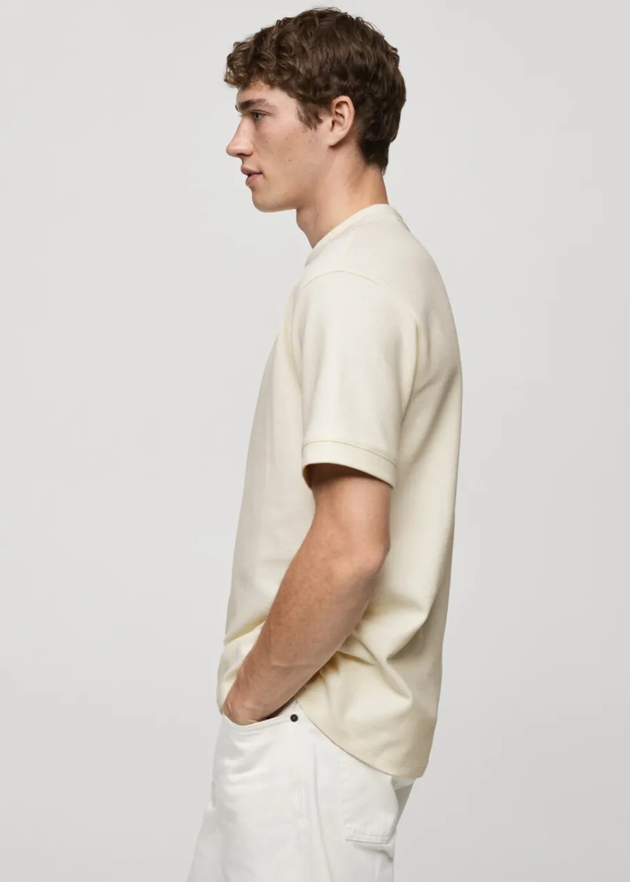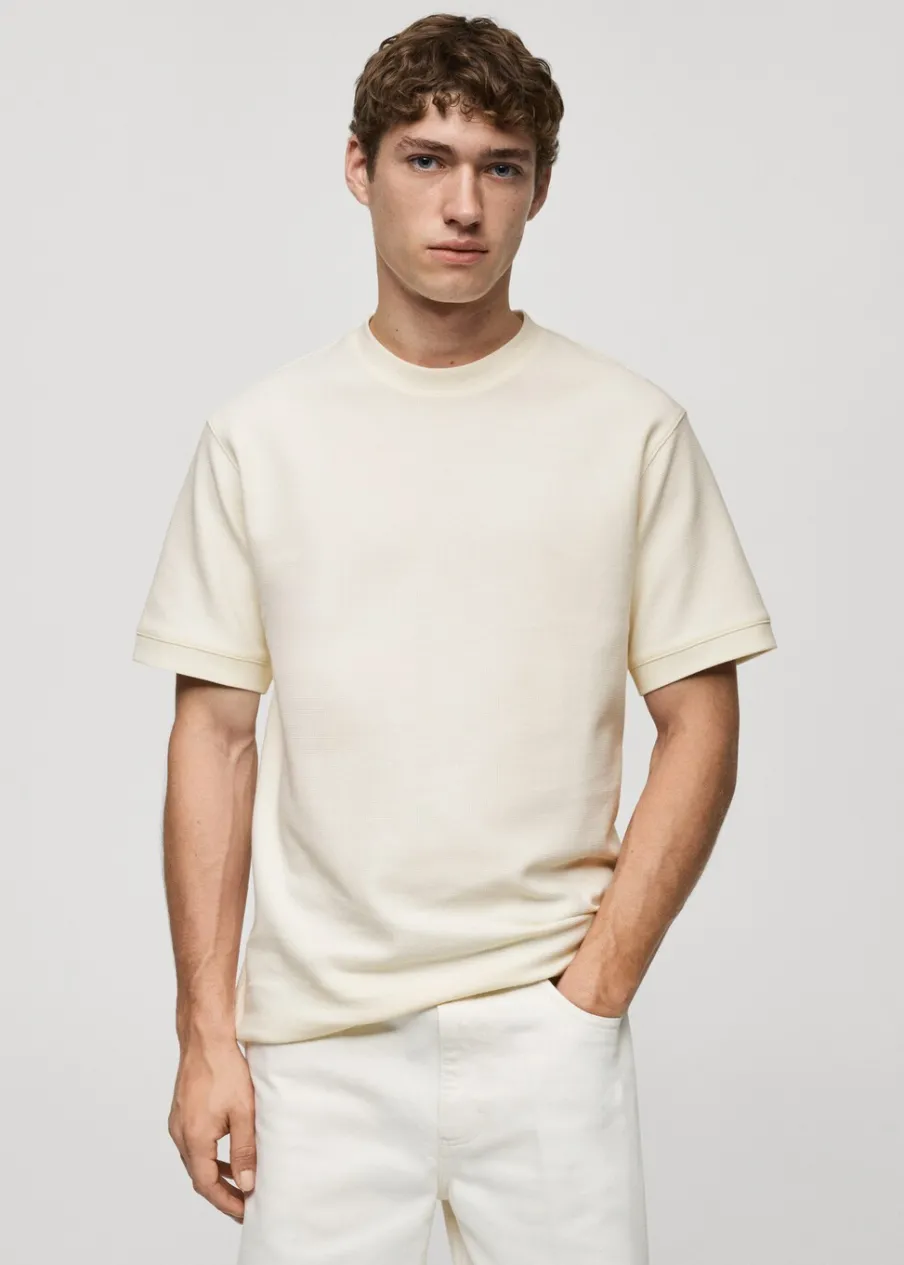 Krój regular. Tkanina mieszanka bawełny. Wykończenie z mikroteksturą. Okrągły dekolt. Krótki rękaw. Prosty dół. Model ma 185 cm wzrostu i nosi rozmiar M.