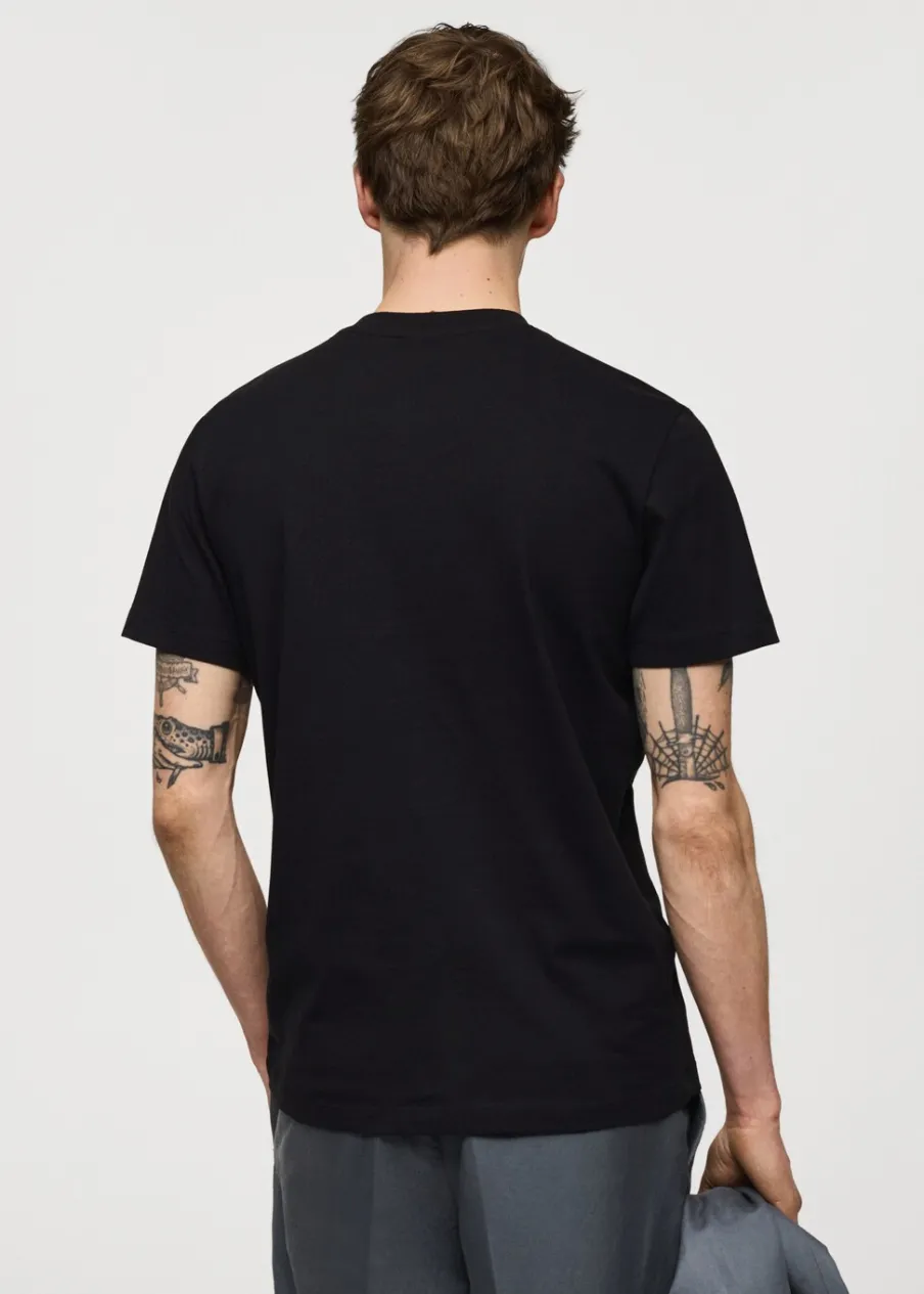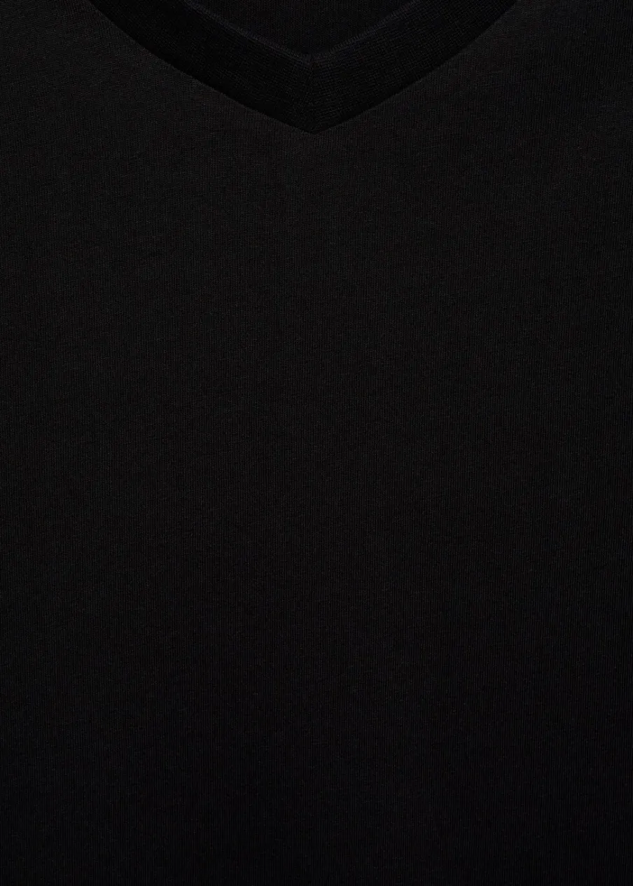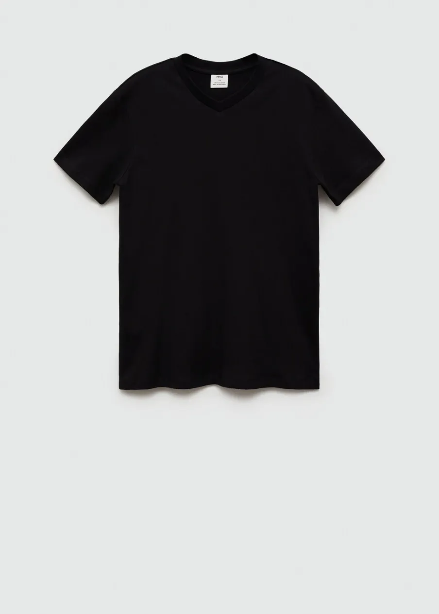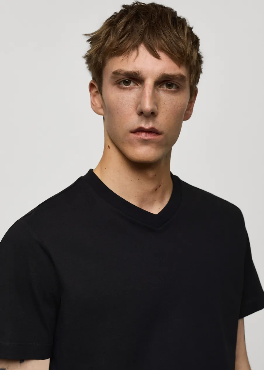 Kolory średniobrązowy i indygo dostępne tylko online. Slim-fit. Dekolt V. Krótki rękaw. Prosty dół. Model ma 190 cm wzrostu i nosi rozmiar M. Tkanina z 100% bawełny.