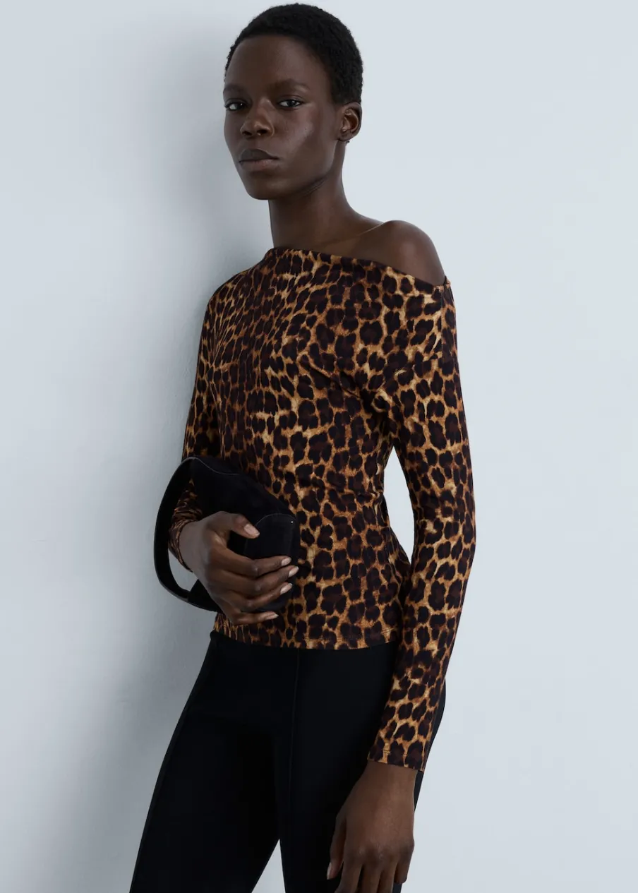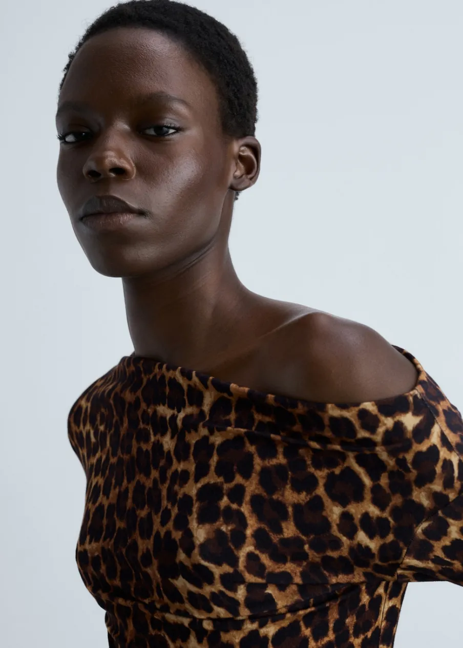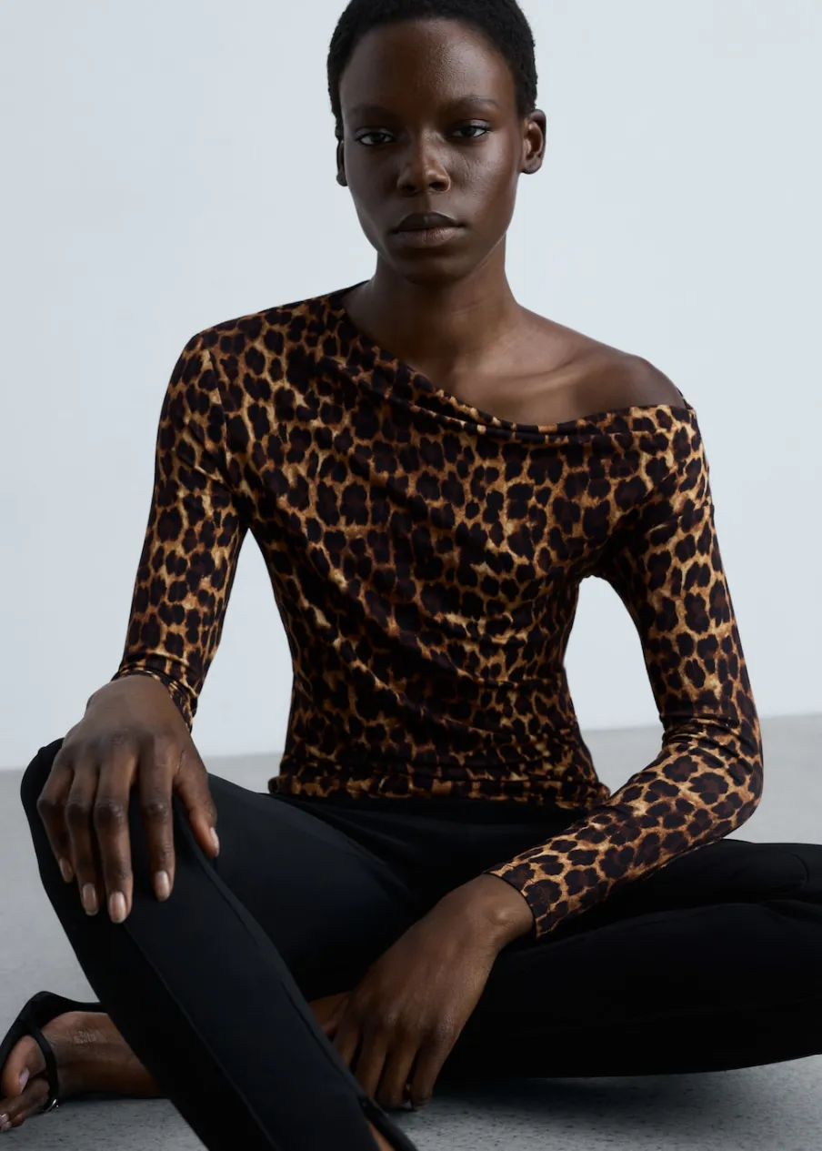 Lejąca tkanina. Model prosty. Wzór w lamparcie cętki. Zwierzęcy wzór. Asymetryczny dekolt. Długi rękaw. Bez zapięcia.