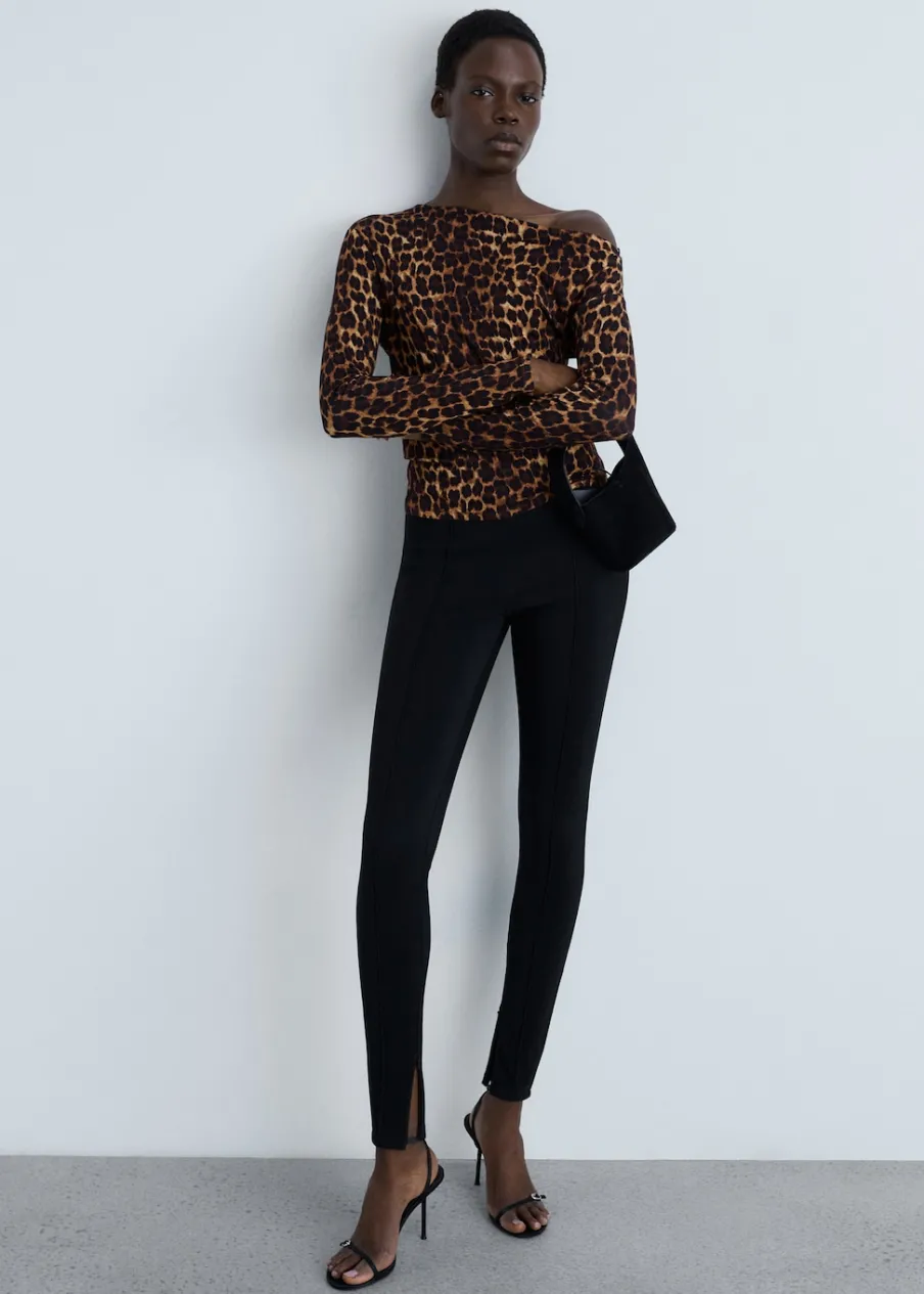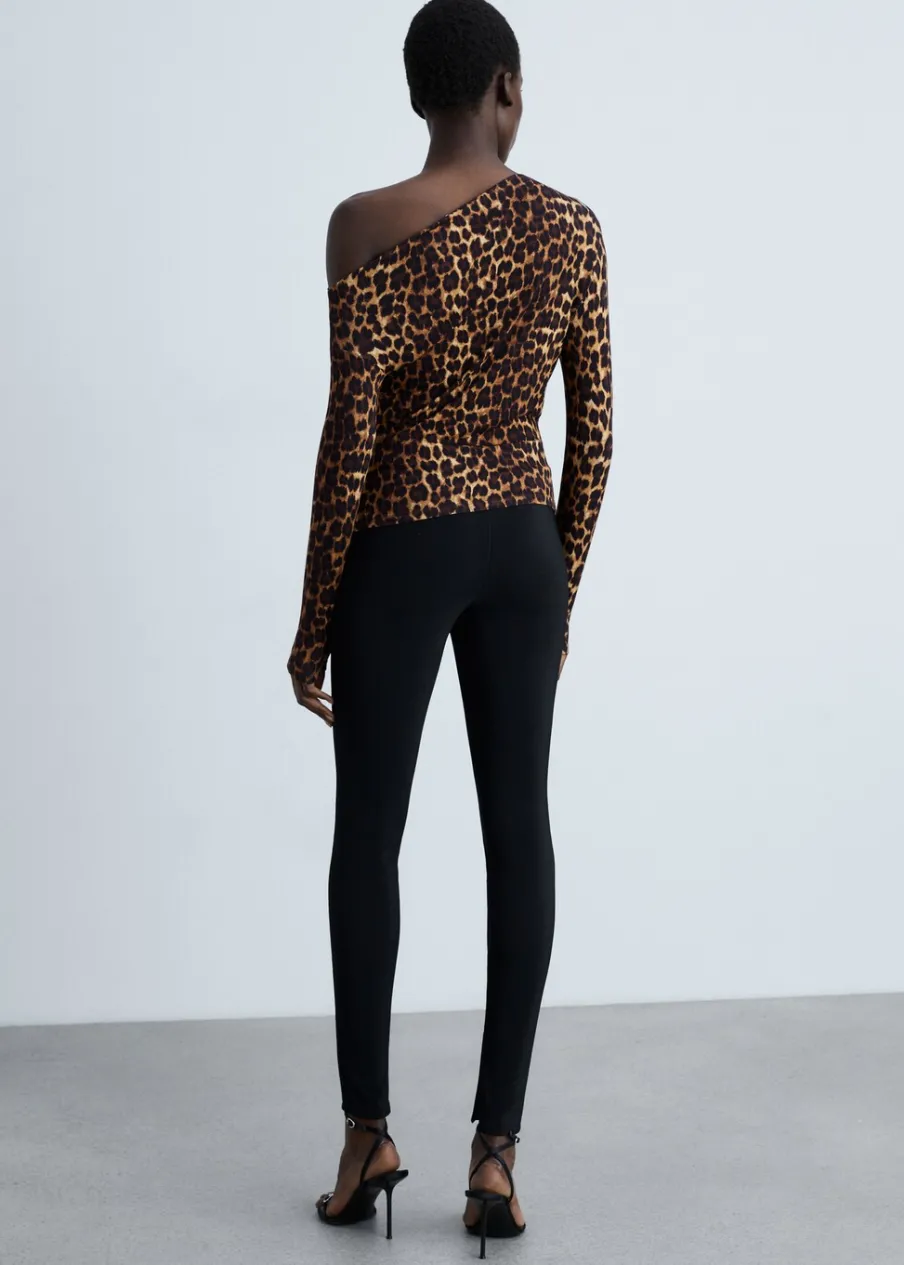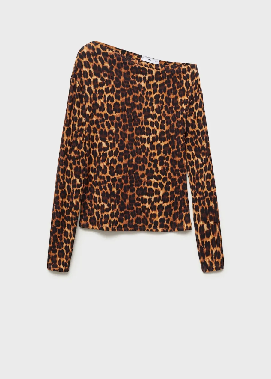Lejąca tkanina. Model prosty. Wzór w lamparcie cętki. Zwierzęcy wzór. Asymetryczny dekolt. Długi rękaw. Bez zapięcia.