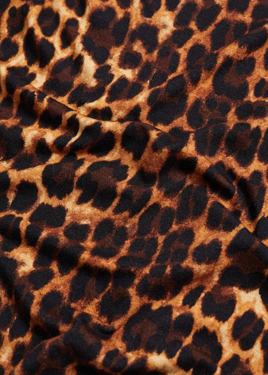 OpisLejąca tkanina. Model prosty. Wzór w lamparcie cętki. Zwierzęcy wzór. Asymetryczny dekolt. Długi rękaw. Bez z…