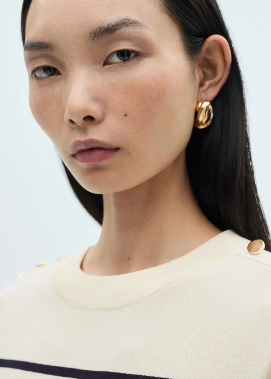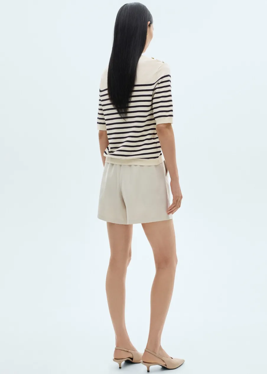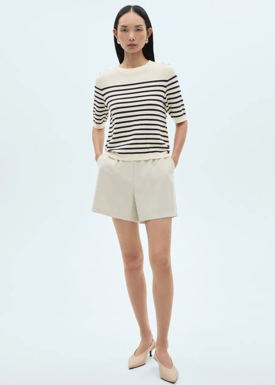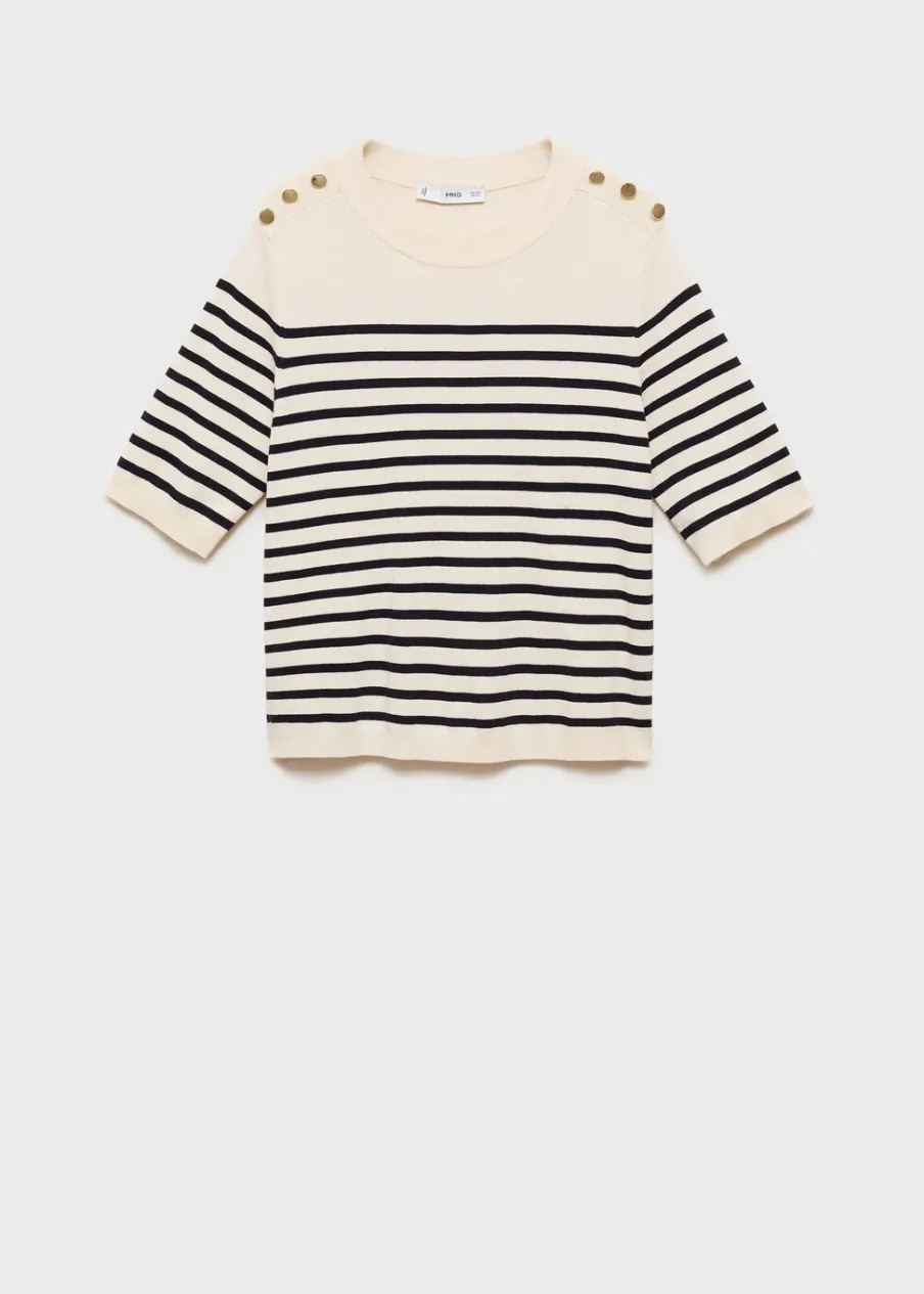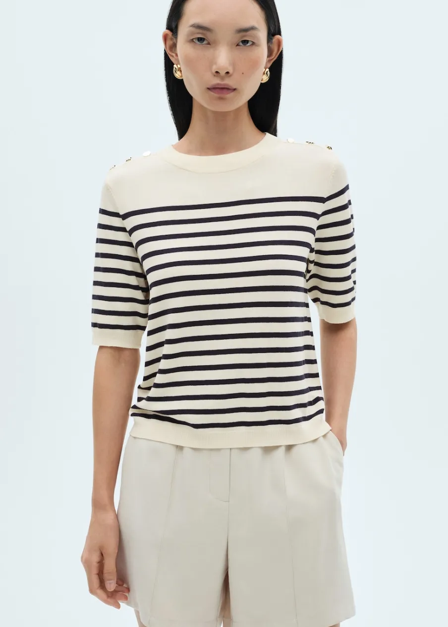 Tkanina z cienkiej dzianiny. Model standardowy. Slim-fit. Wzór w pasy. Okrągły dekolt. Krótki rękaw. Ściągaczowe wykończenia. Bez zapięcia. Detal z ozdobnymi guzikami.