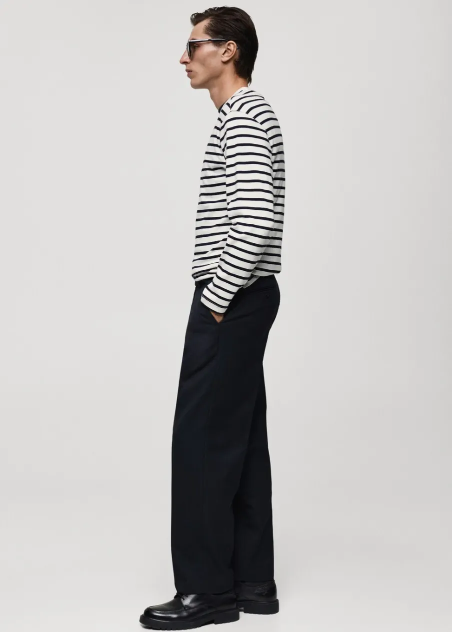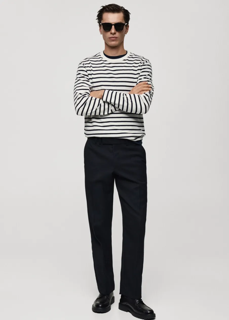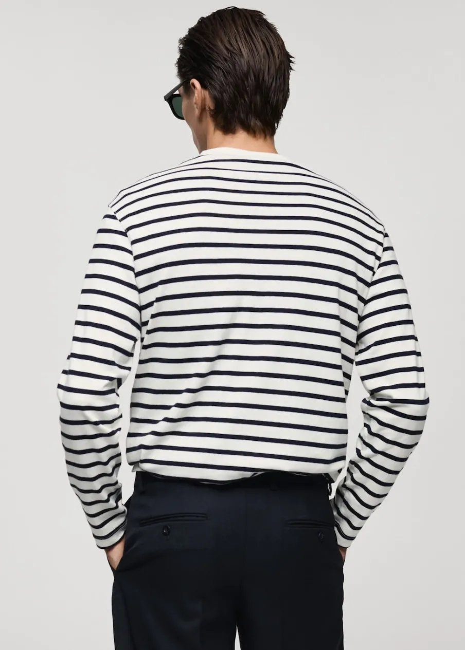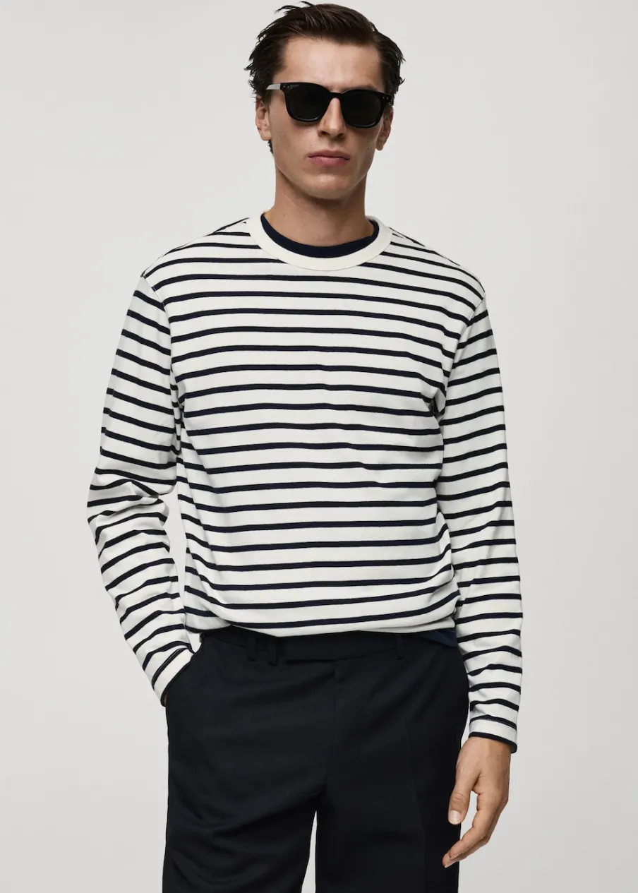 Regular fit, 100% βαμβάκι, csíkos minta, hosszú ujj, kerek nyakkivágás, a modell testmagassága 185 cm és M-es méretet visel.