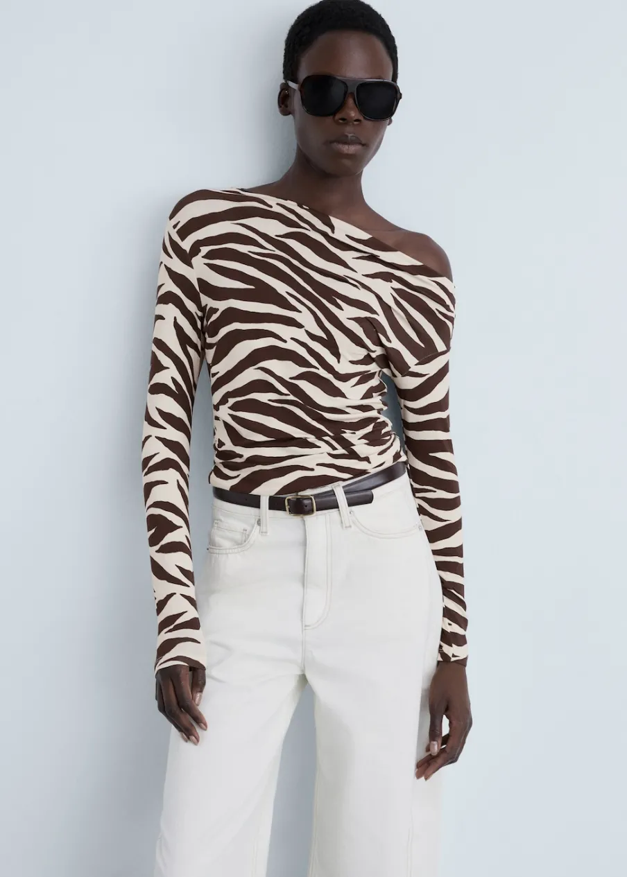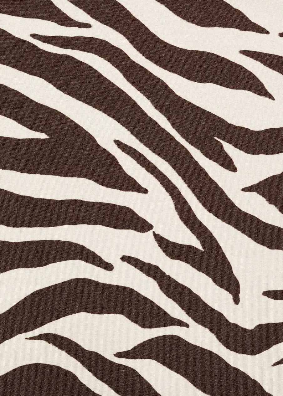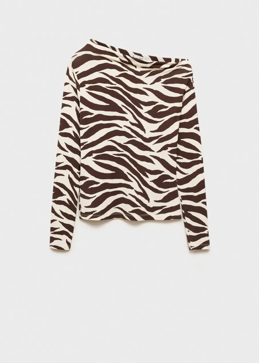 Cienka tkanina. Slim-fit. Wzór w zebrę. Zwierzęcy wzór. Asymetryczny dekolt. Długi rękaw. Bez zapięcia.