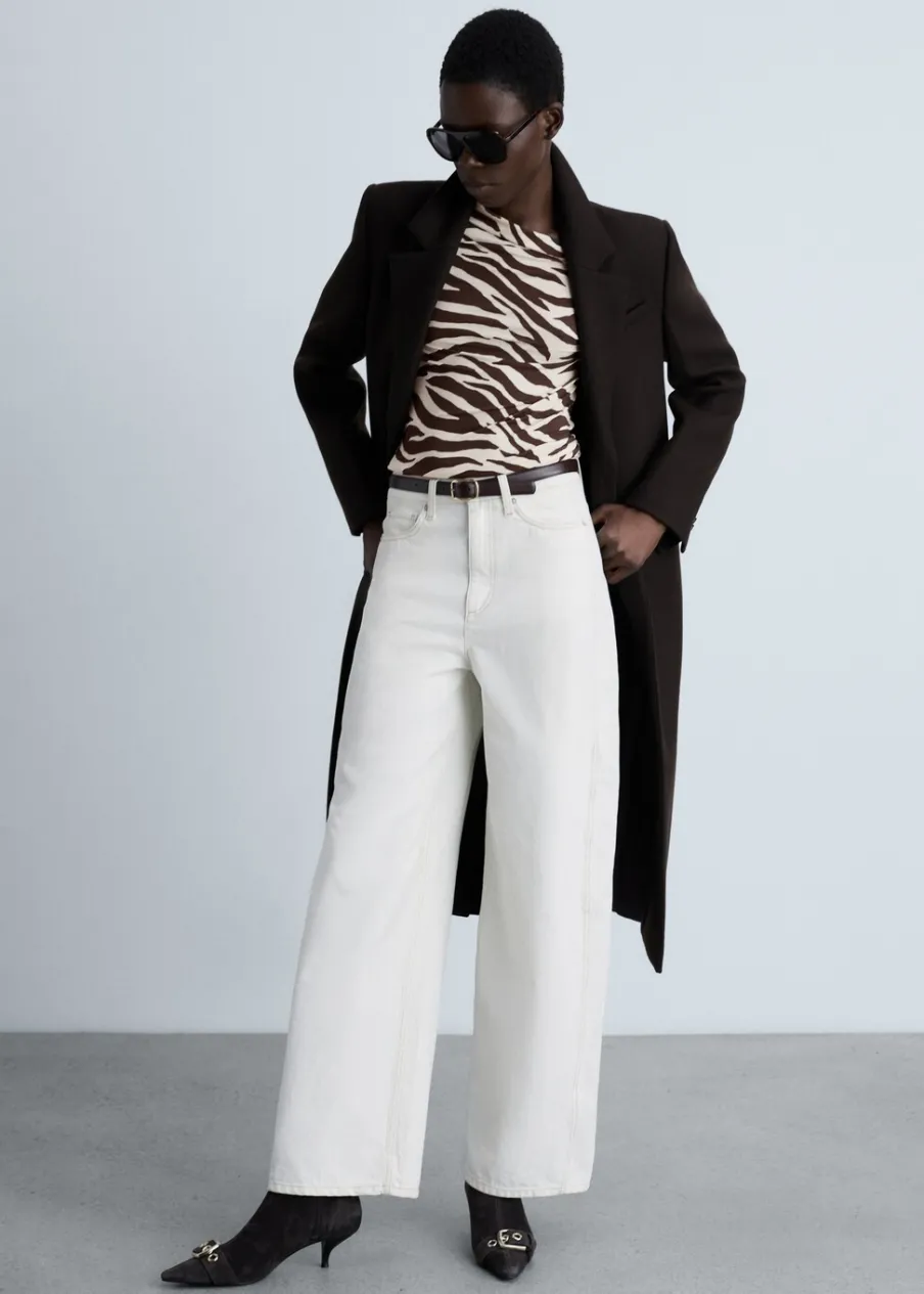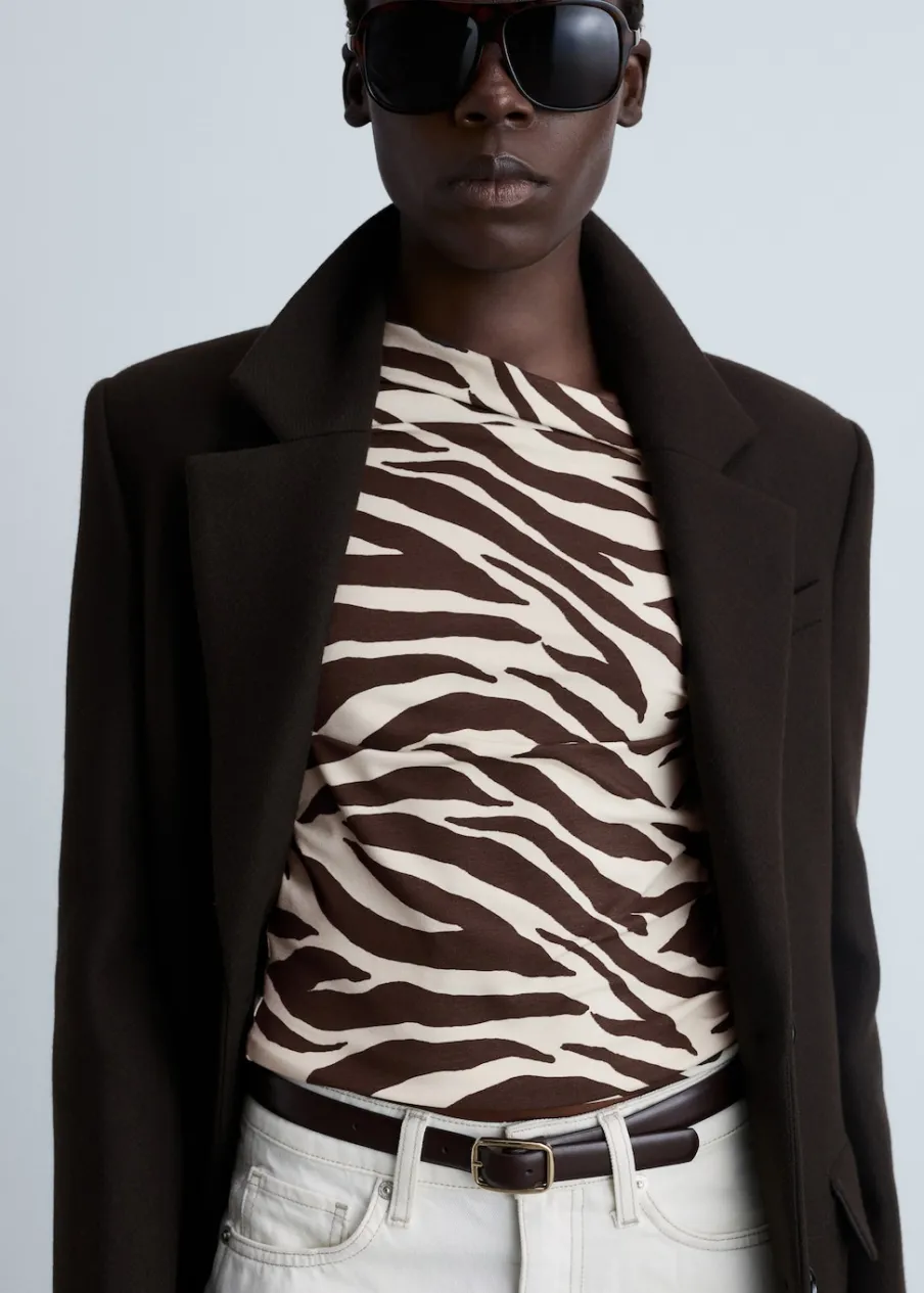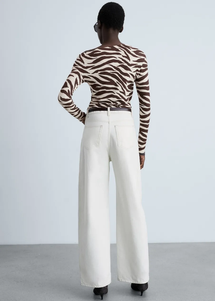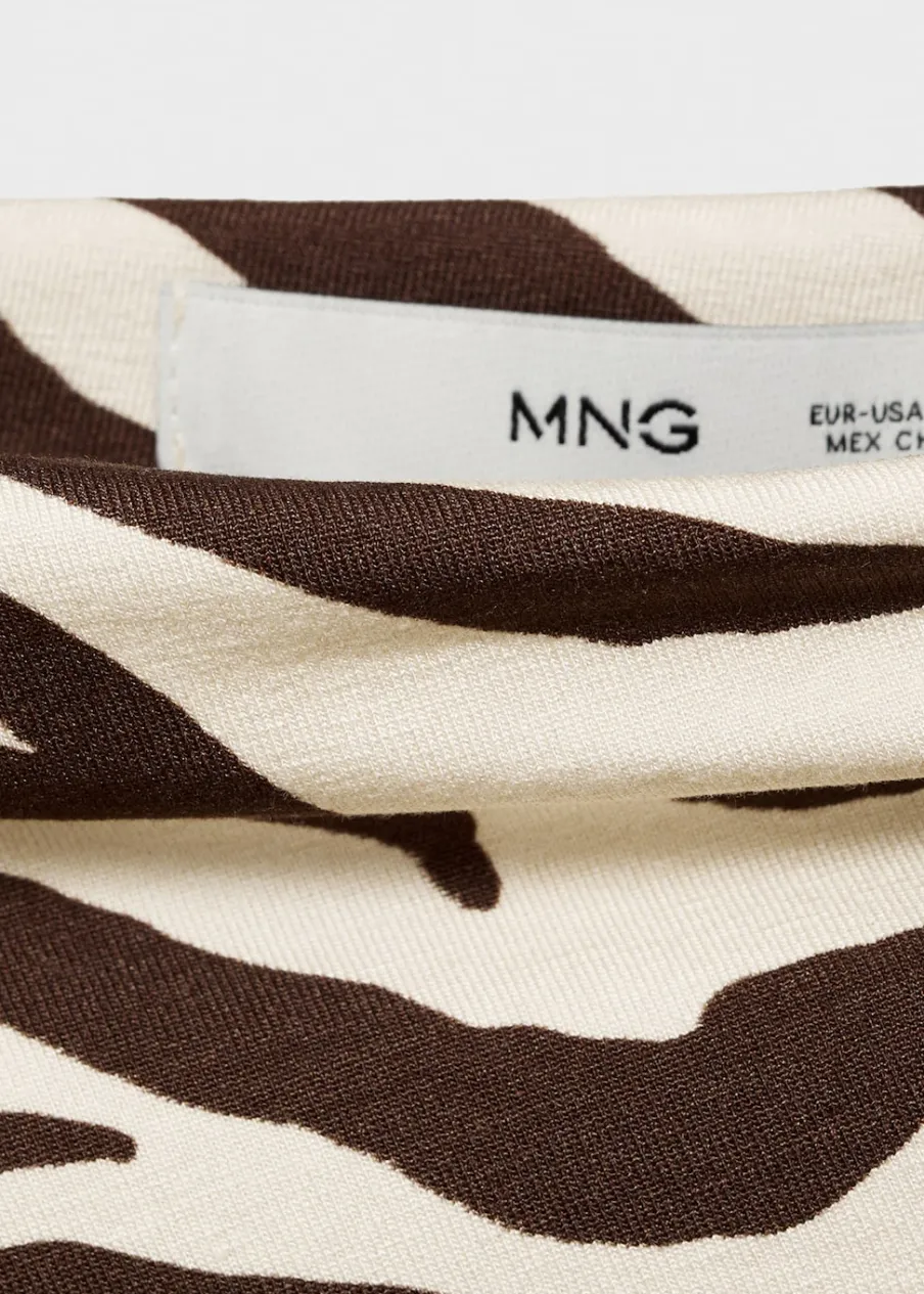 Cienka tkanina. Slim-fit. Wzór w zebrę. Zwierzęcy wzór. Asymetryczny dekolt. Długi rękaw. Bez zapięcia.