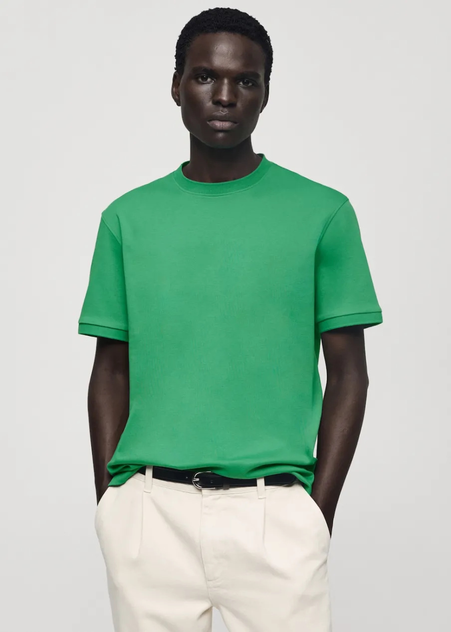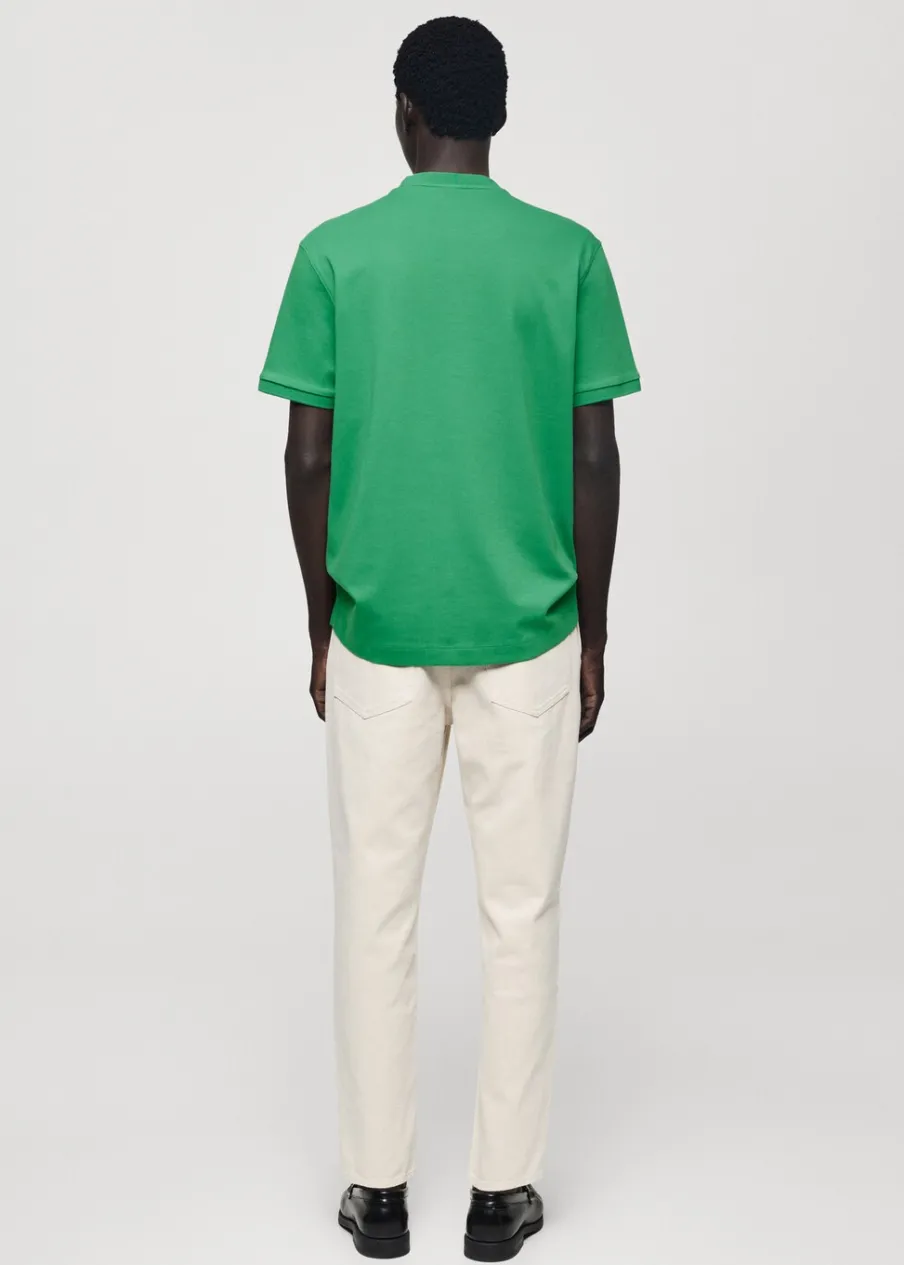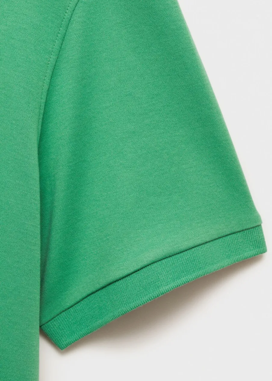 Krój regular. Okrągły dekolt. 100% bomull. Prosty dół z rozcięciami po bokach. Model ma 190 cm wzrostu i nosi rozmiar M. Kołnierzyk i rękawy z prążkowanego materiału.