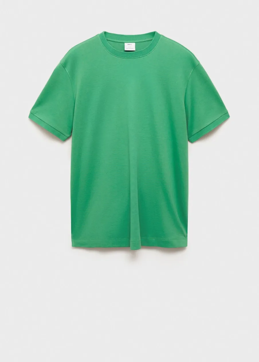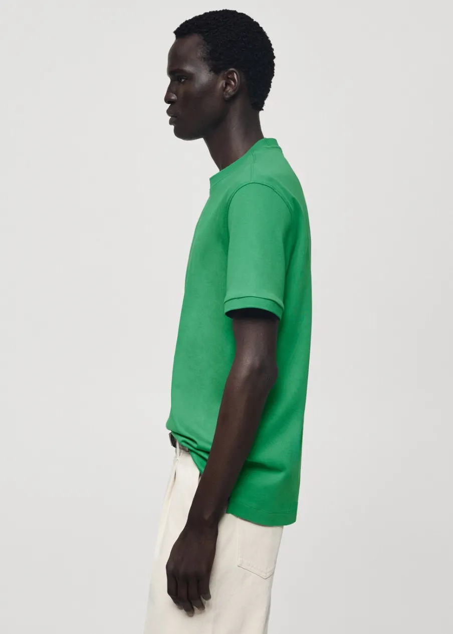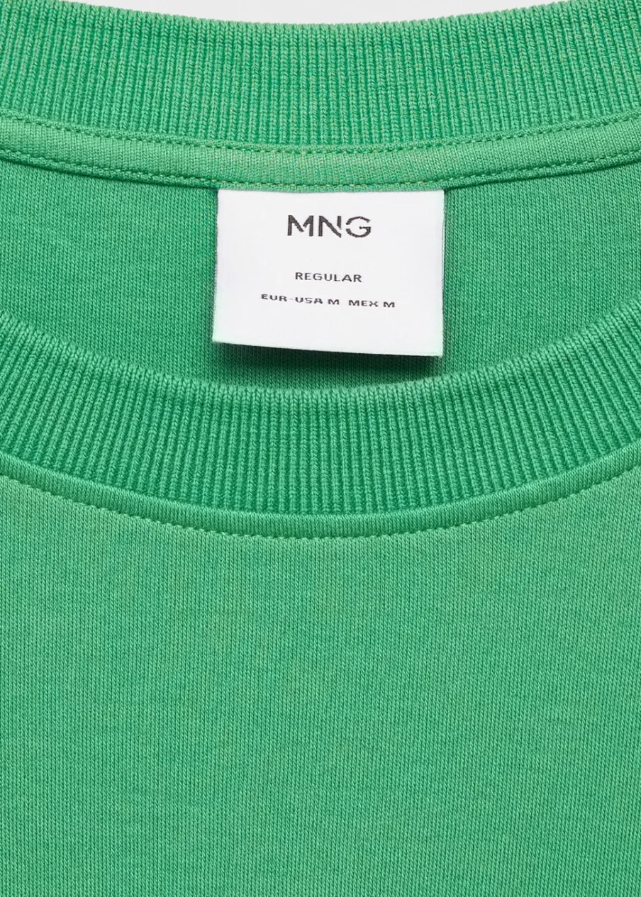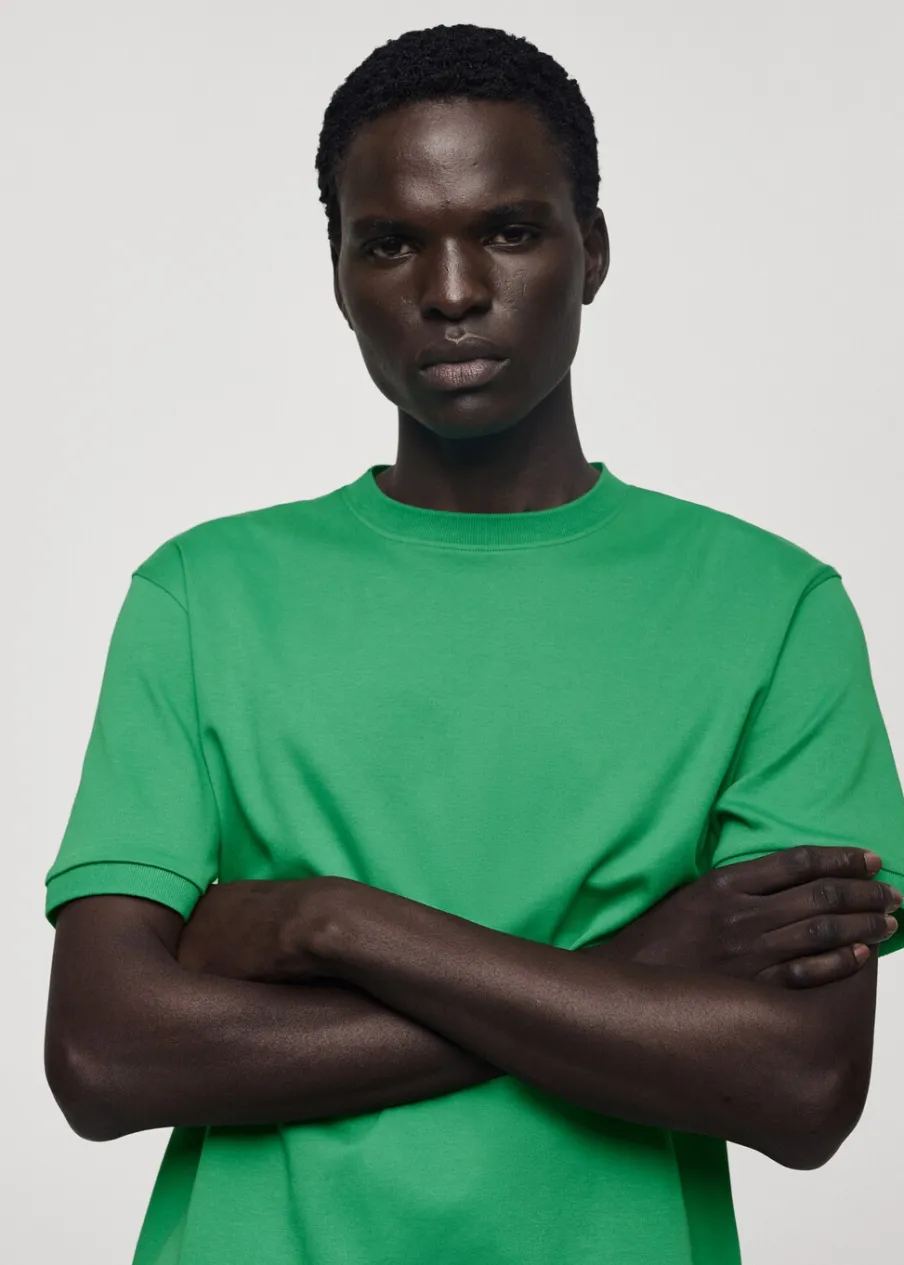 Krój regular. Okrągły dekolt. 100% bomull. Prosty dół z rozcięciami po bokach. Model ma 190 cm wzrostu i nosi rozmiar M. Kołnierzyk i rękawy z prążkowanego materiału.