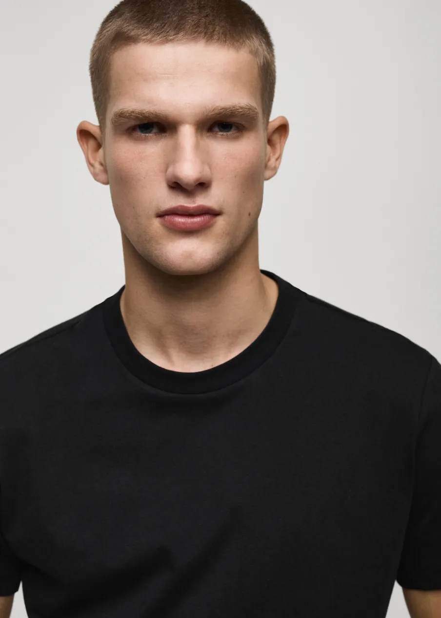 Slim-fit. 100% bomull. Okrągły dekolt. Krótki rękaw. Model ma 185 cm wzrostu i nosi rozmiar M. Kolory zielony i camel są dostępne tylko online.