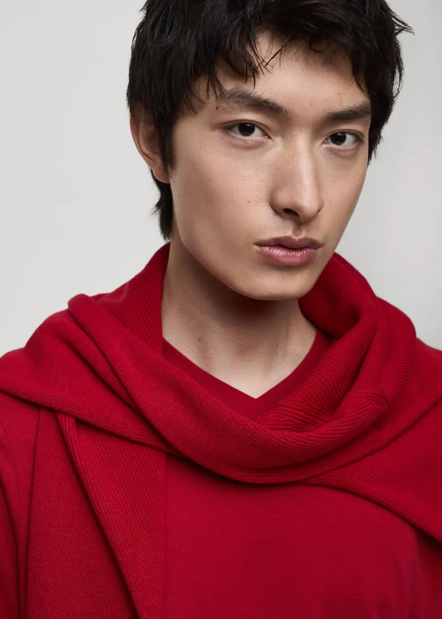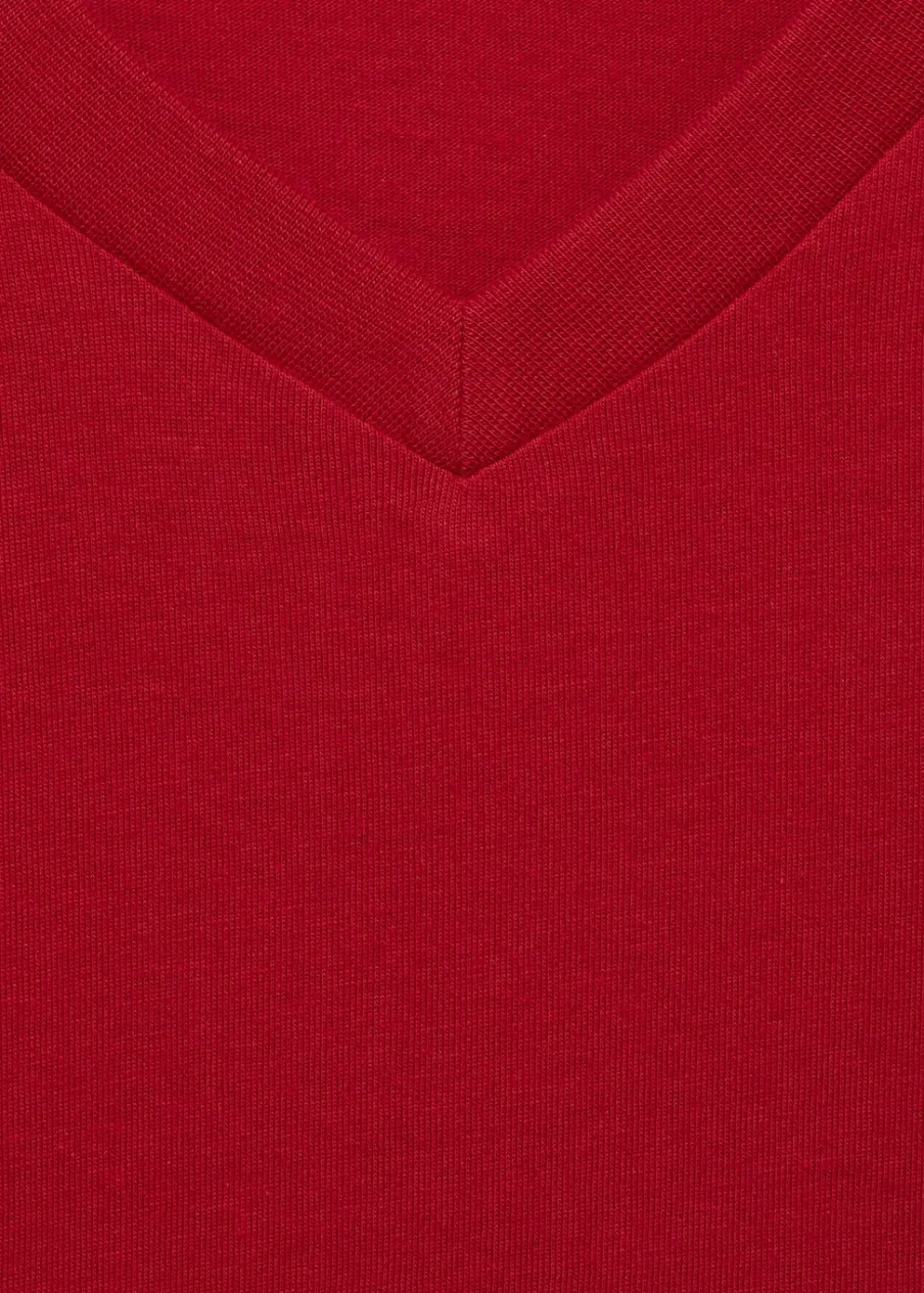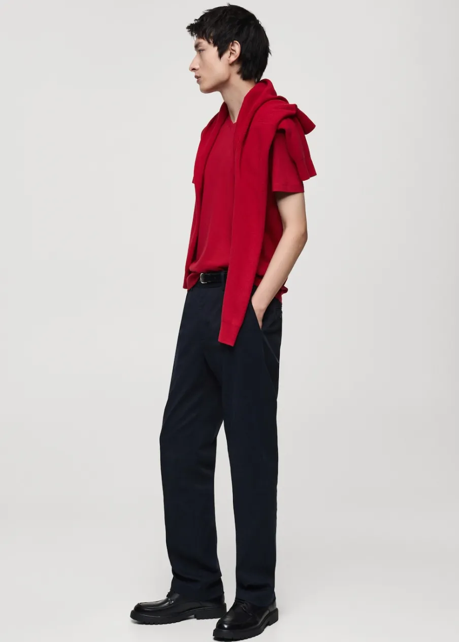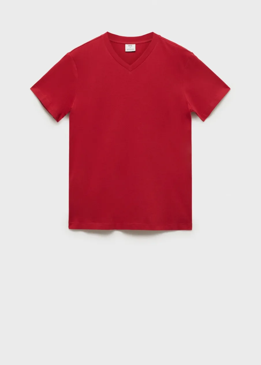 Slim-fit. 100% bomull. Dekolt V. Model ma 185 cm wzrostu i nosi rozmiar M.