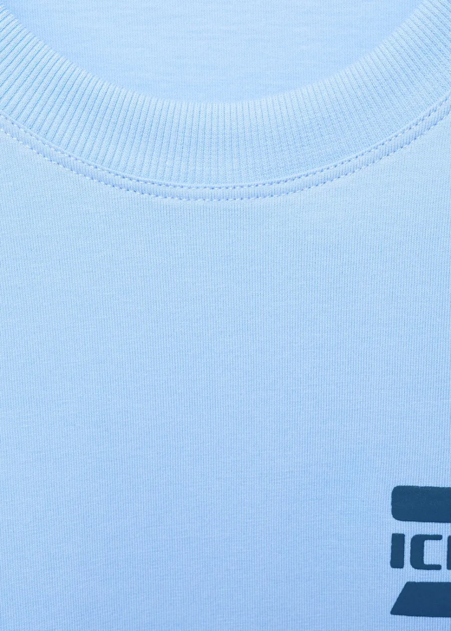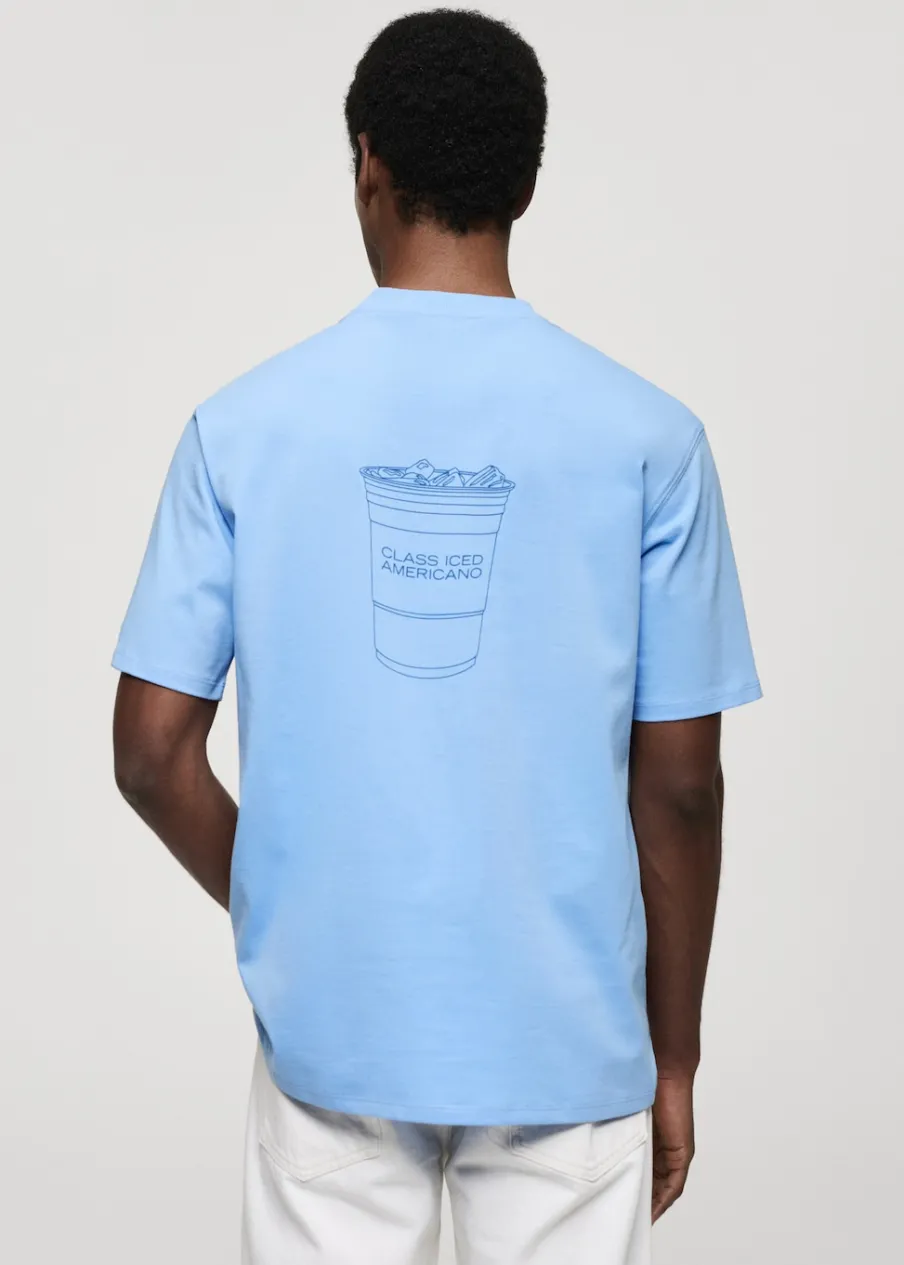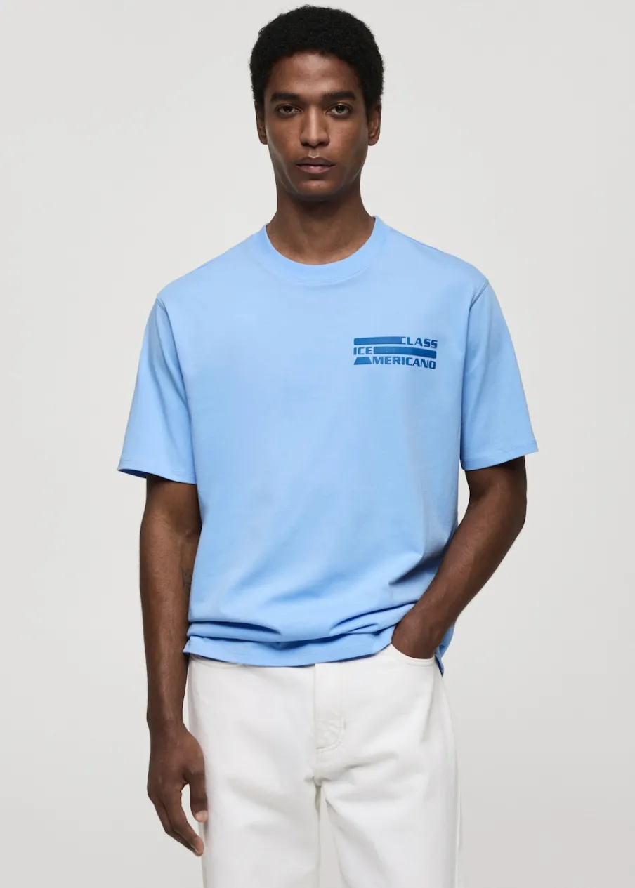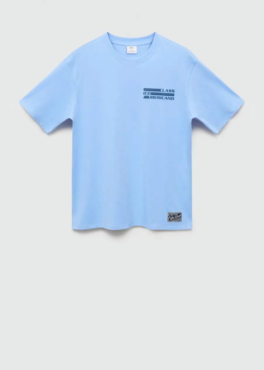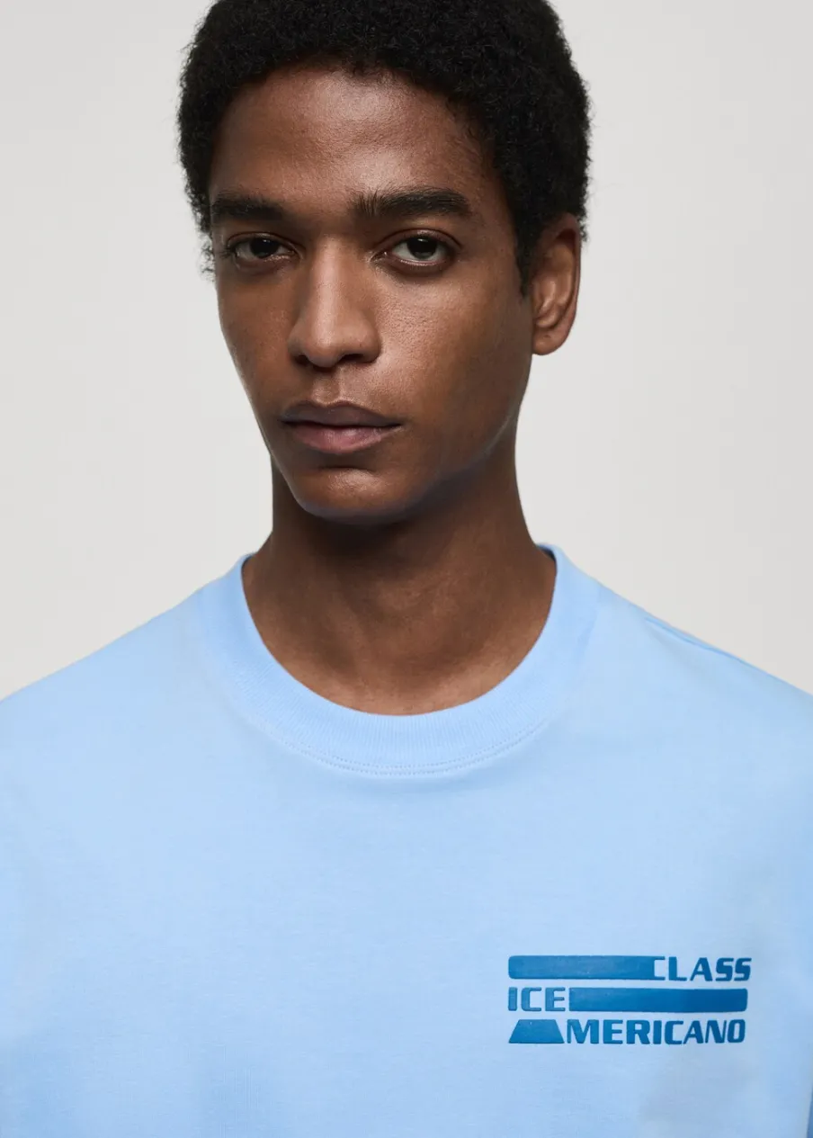 Okrągły dekolt. Nadruk na klatce piersiowej. Krótki rękaw. Prosty dół. Model ma 185 cm wzrostu i nosi rozmiar M. Nadruk z tyłu. Tkanina z 100% bawełny.