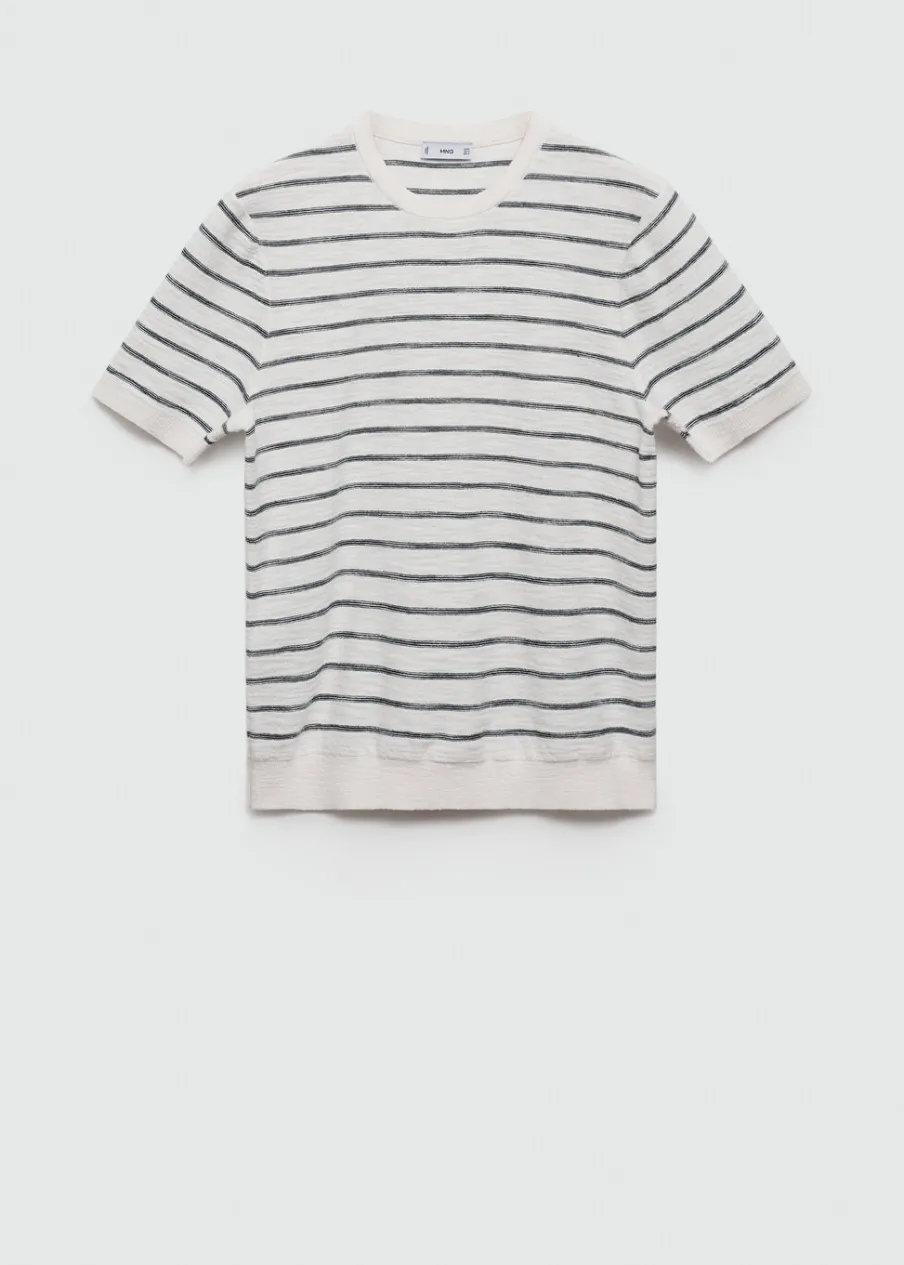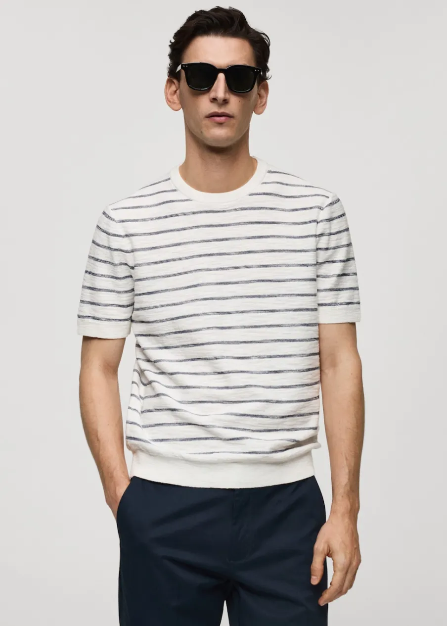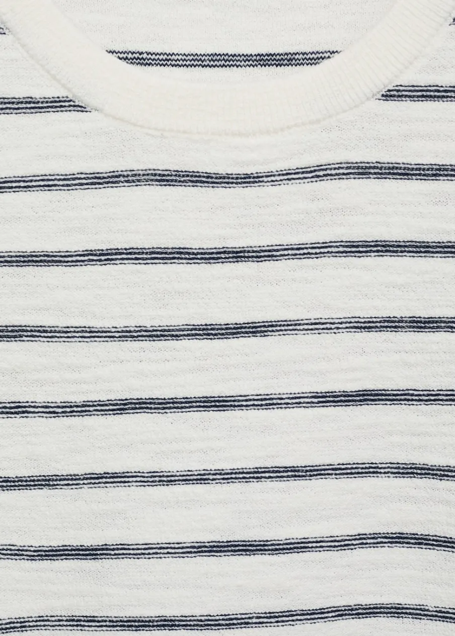 Tkanina mieszanka bawełny. Tkanina z cienkiej dzianiny. Wzór w pionowe paski. Okrągły dekolt. Krótki rękaw. Elastyczne, ściągaczowe wykończenie nogawek. Model ma 185 cm wzrostu i nosi rozmiar M. Prążkowane wykończenie na dekolcie, rękawach i u dołu.