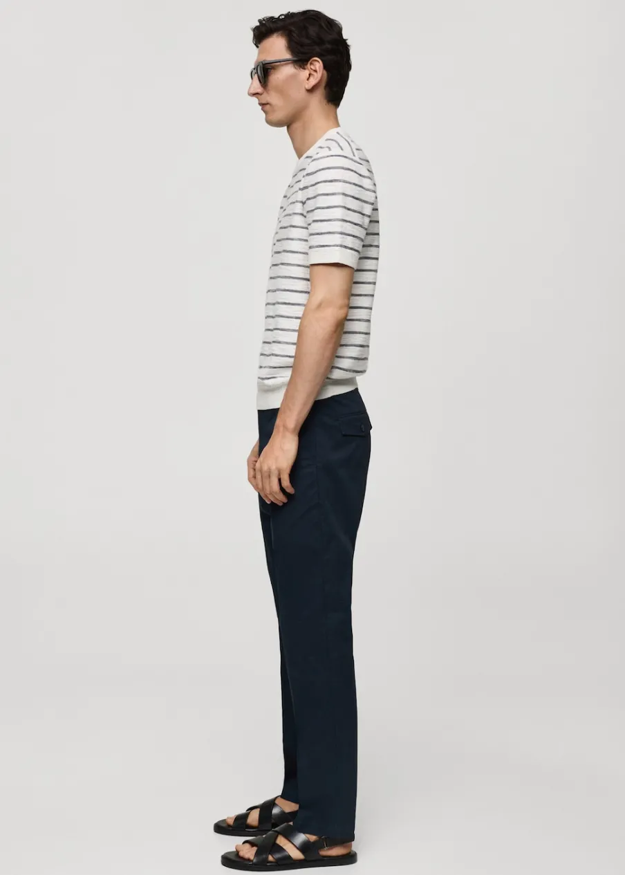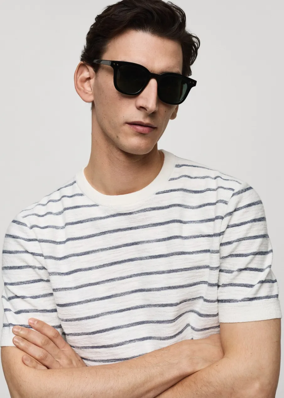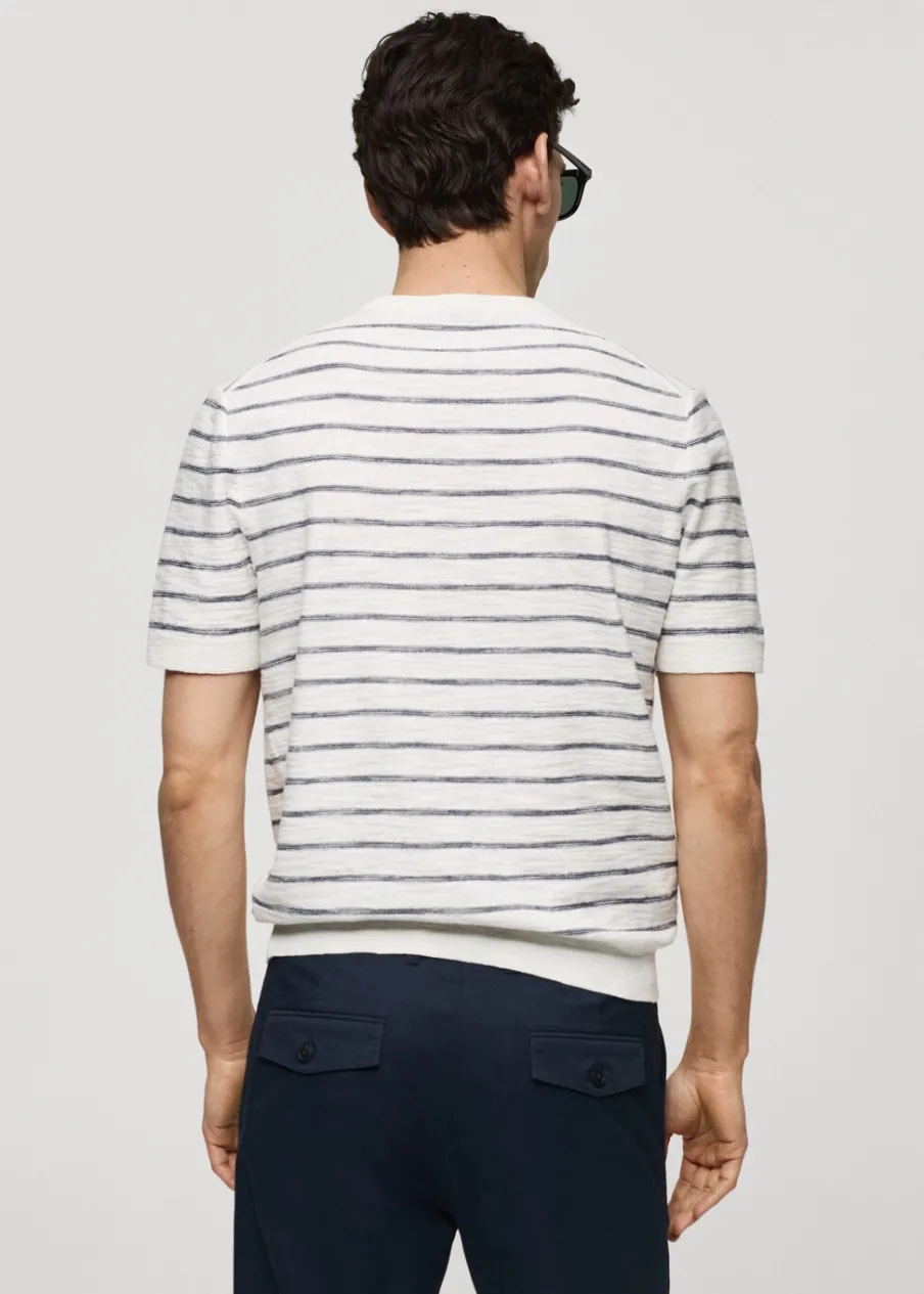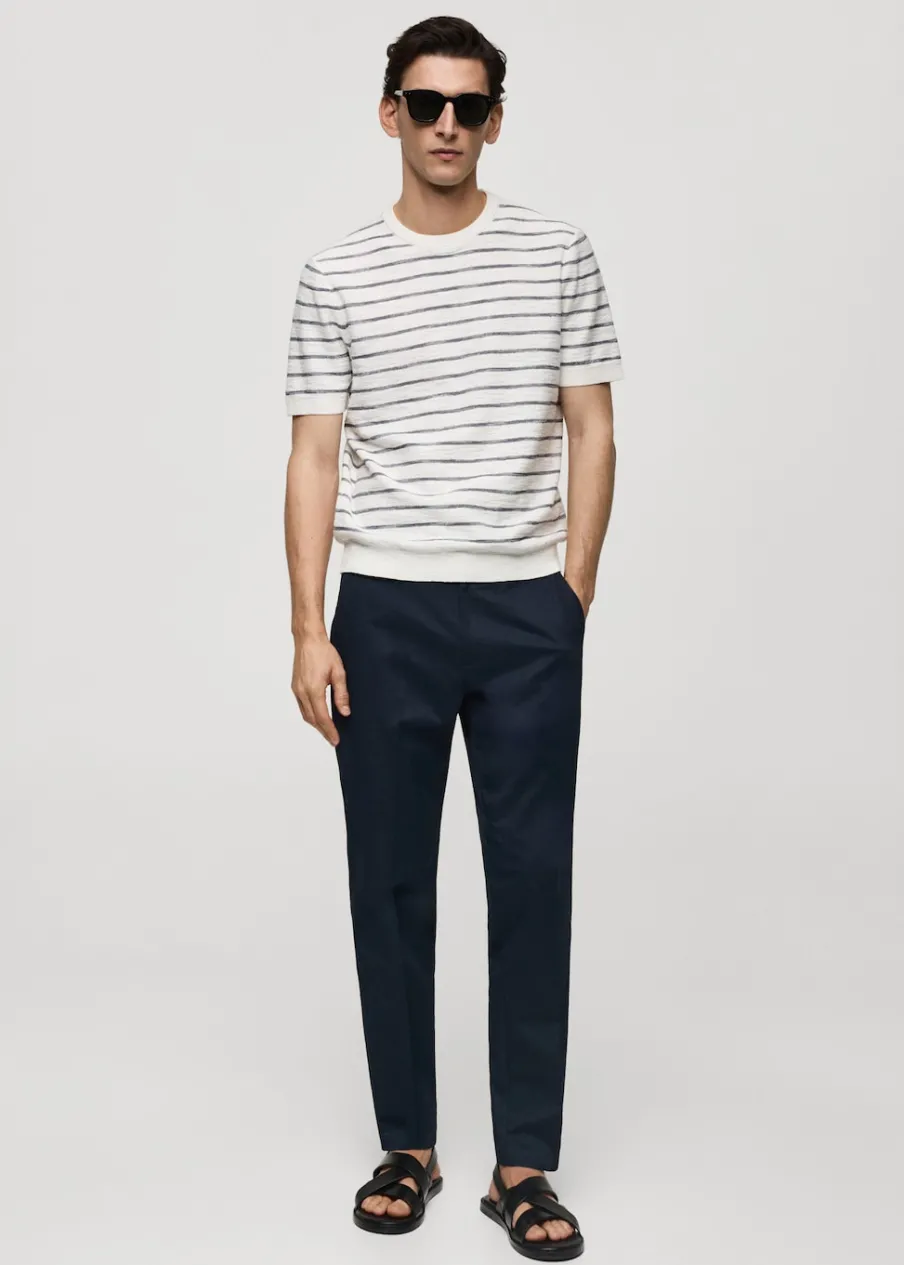 Tkanina mieszanka bawełny. Tkanina z cienkiej dzianiny. Wzór w pionowe paski. Okrągły dekolt. Krótki rękaw. Elastyczne, ściągaczowe wykończenie nogawek. Model ma 185 cm wzrostu i nosi rozmiar M. Prążkowane wykończenie na dekolcie, rękawach i u dołu.
