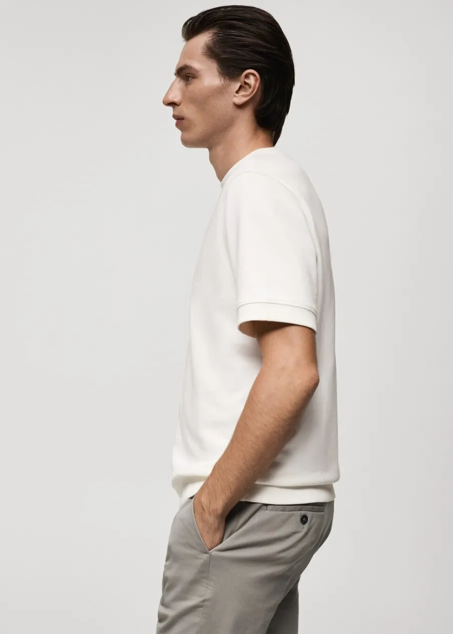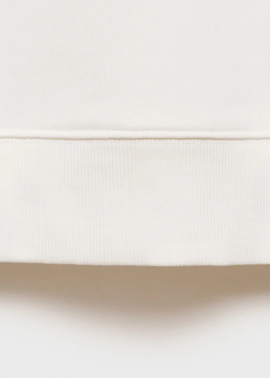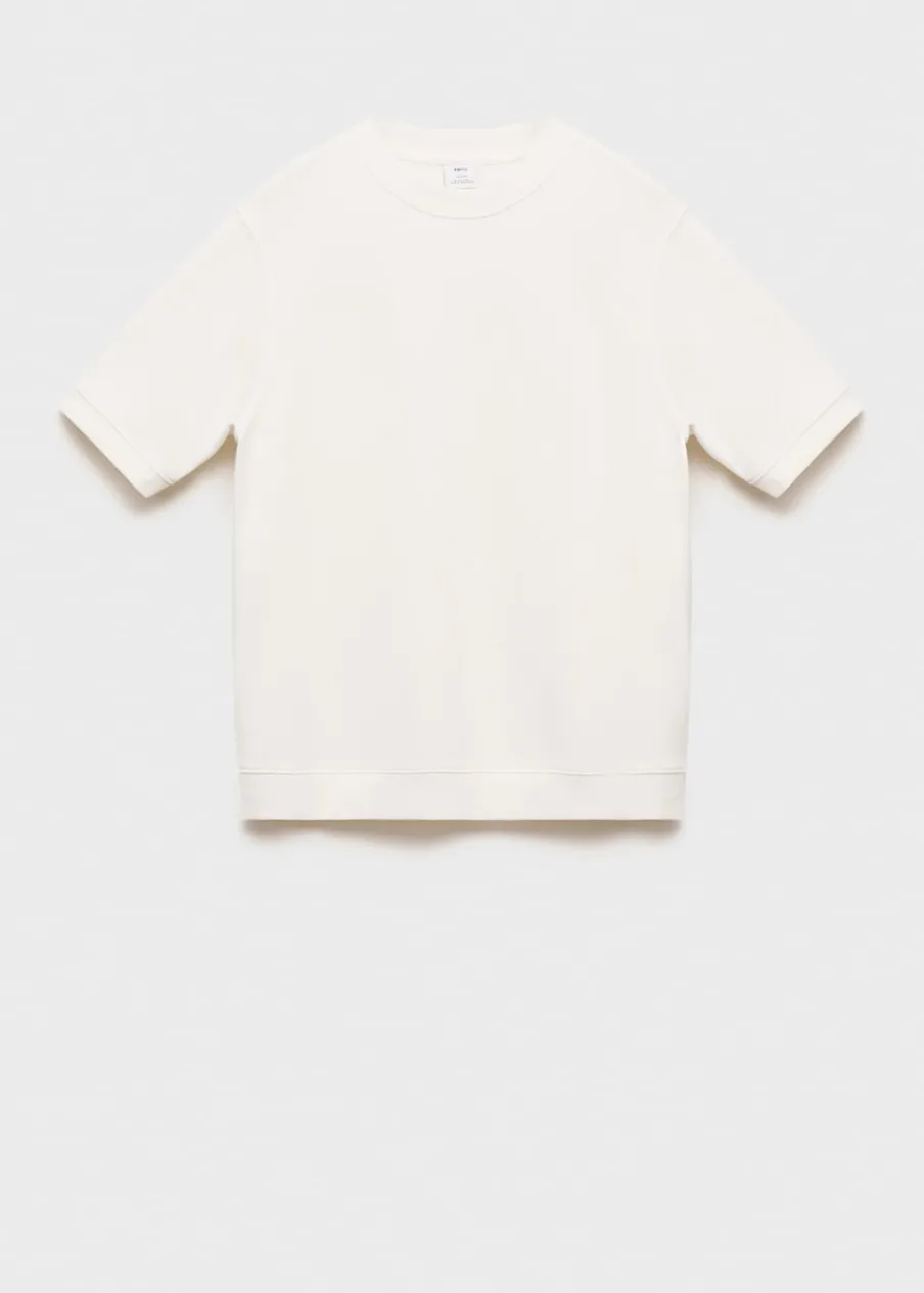 Kolor écru dostępny tylko online. Krój regular. Tkanina mieszanka bawełny. Dzianina dresowa. Prążkowane wykończenia. Krótki rękaw. Prosty dół. Model ma 185 cm wzrostu i nosi rozmiar M.