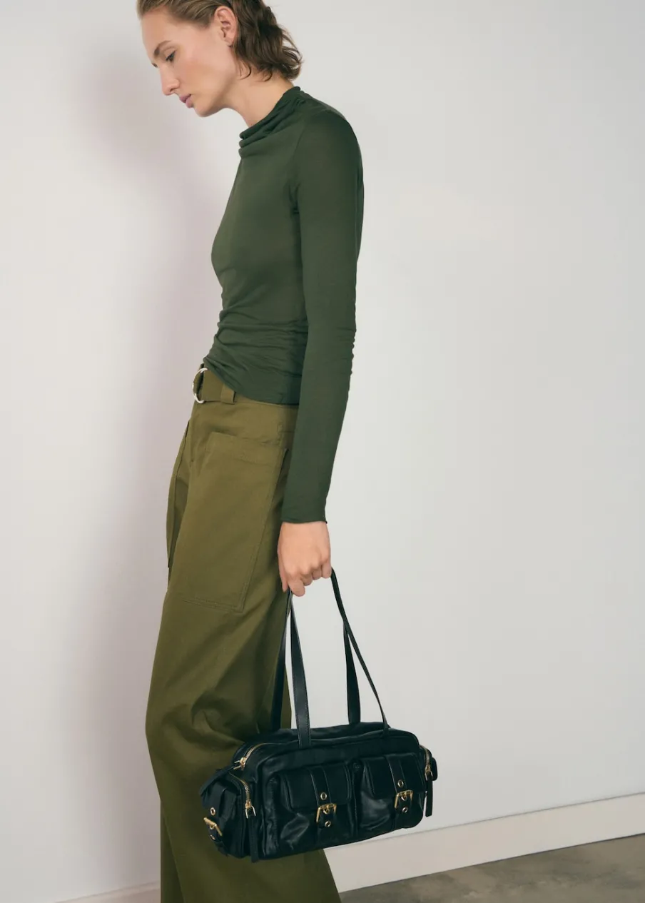 OpisLejąca tkanina. Model wcięty. Okrągły dekolt. Długi rękaw. Bez zapięcia.
