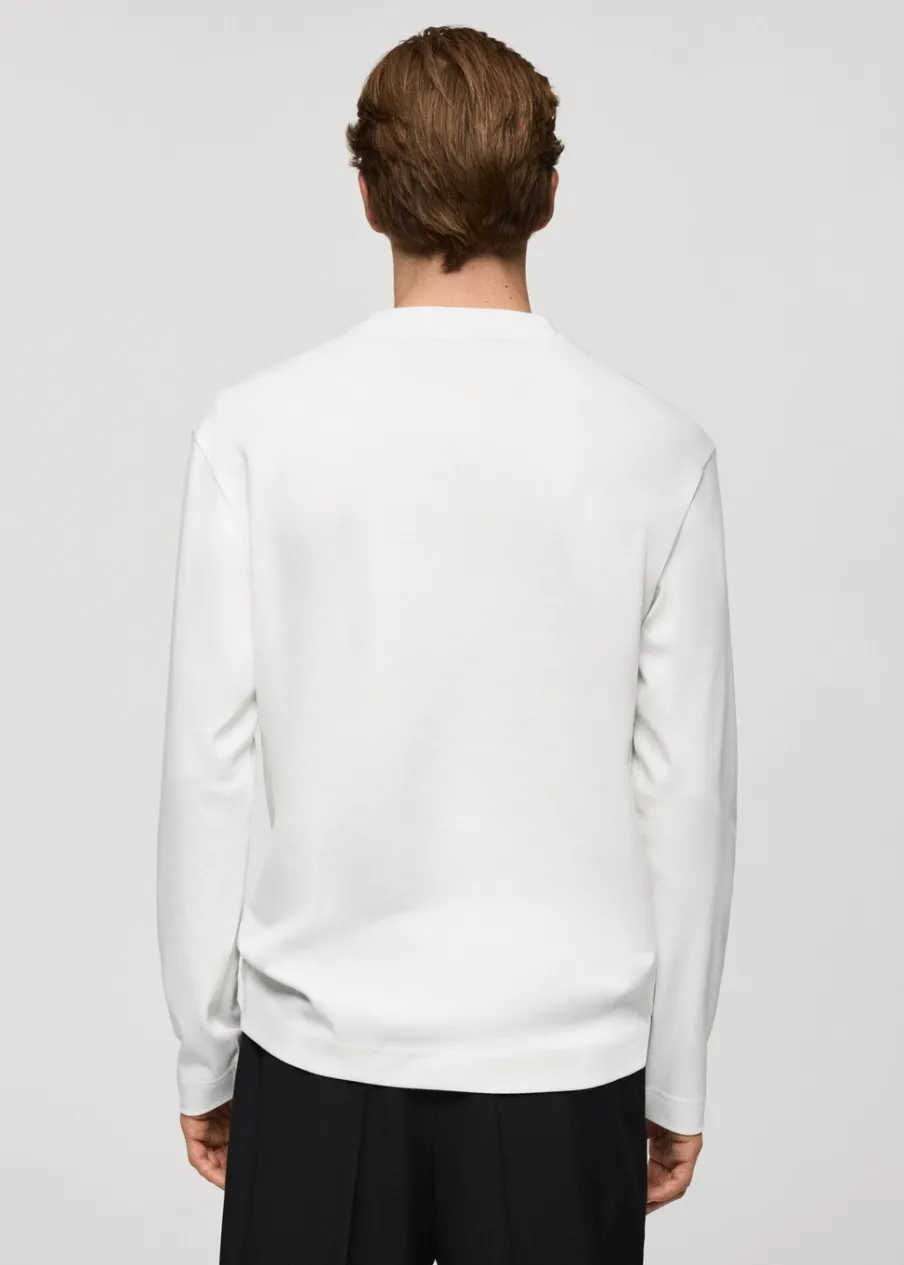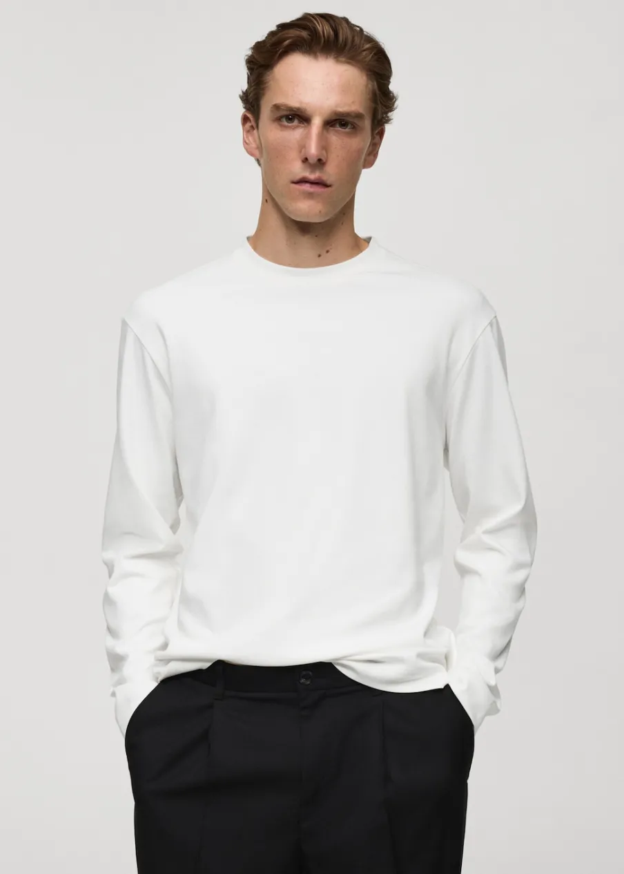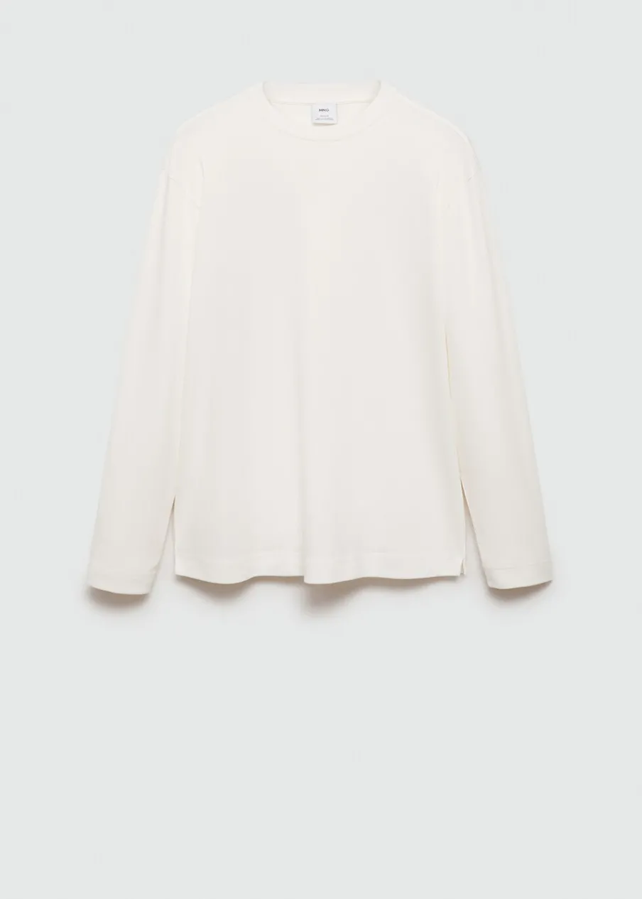 Bawełna 100%. Krój regular. Cienka tkanina. Okrągły dekolt z prążkowanym wykończeniem. Długi rękaw. Prosty dół z rozcięciami po bokach. Model ma 190 cm wzrostu i nosi rozmiar M.