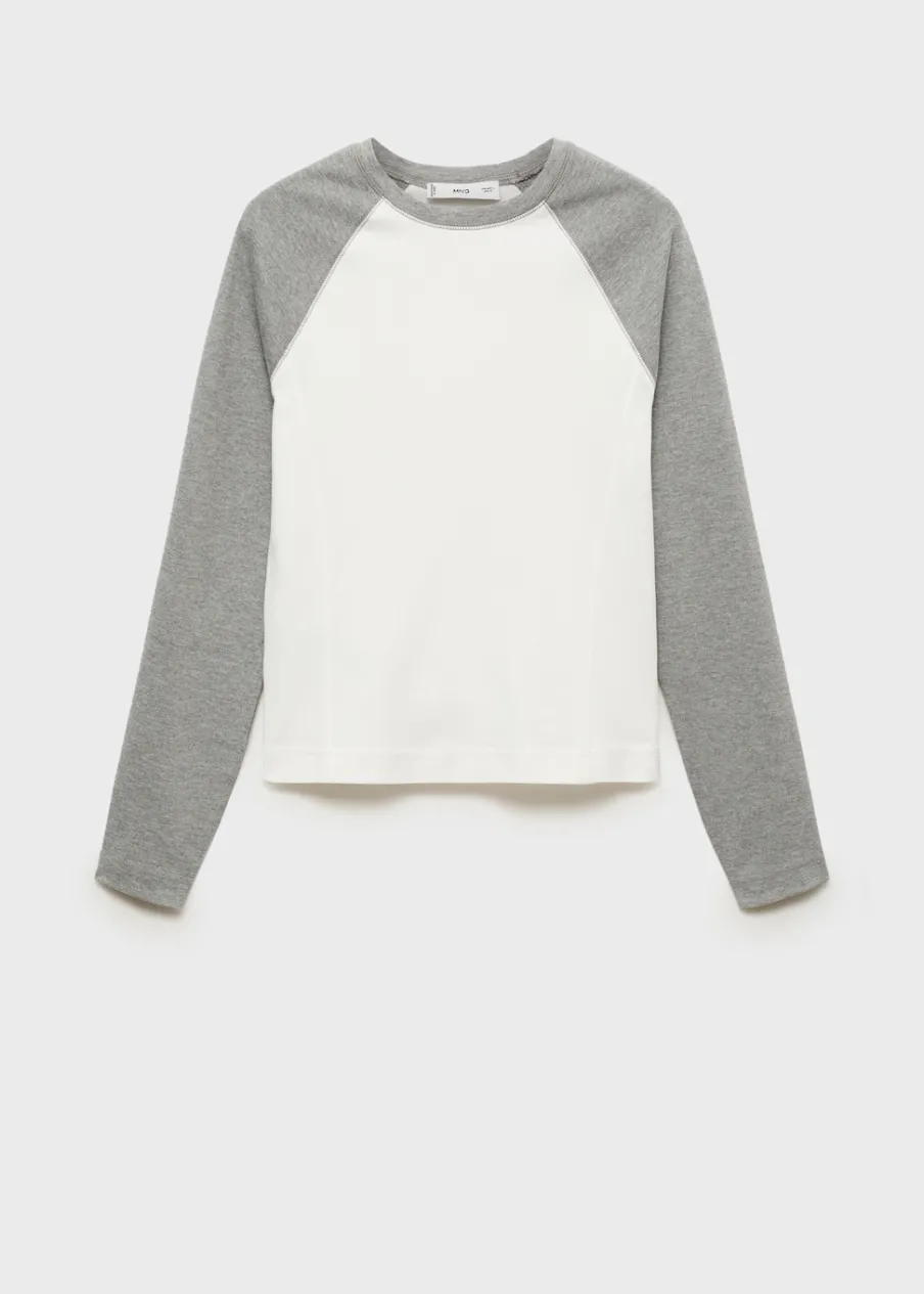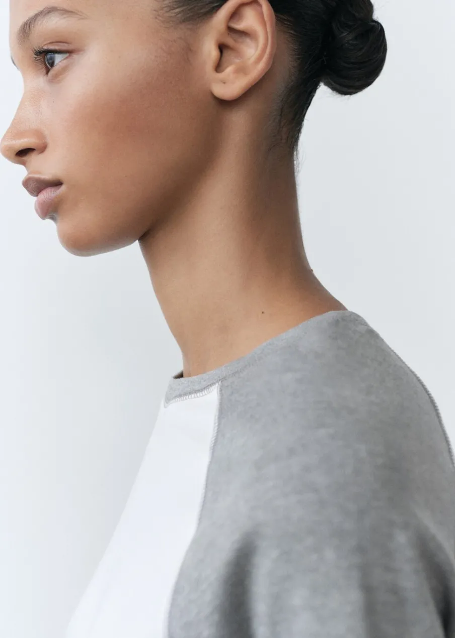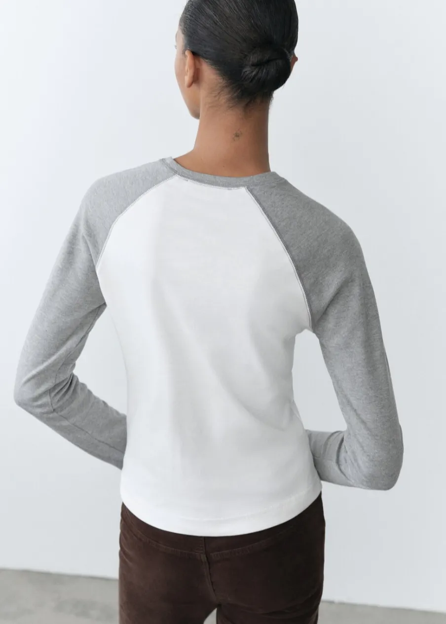 Tkanina z 100% bawełny. Model prosty. Okrągły dekolt. Długi, kontrastowy rękaw. Modelka ma 178 cm wzrostu i nosi rozmiar S/36.