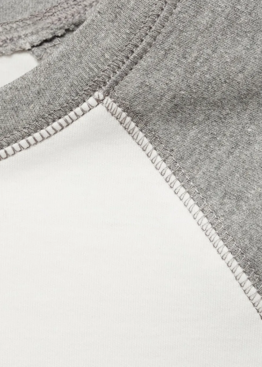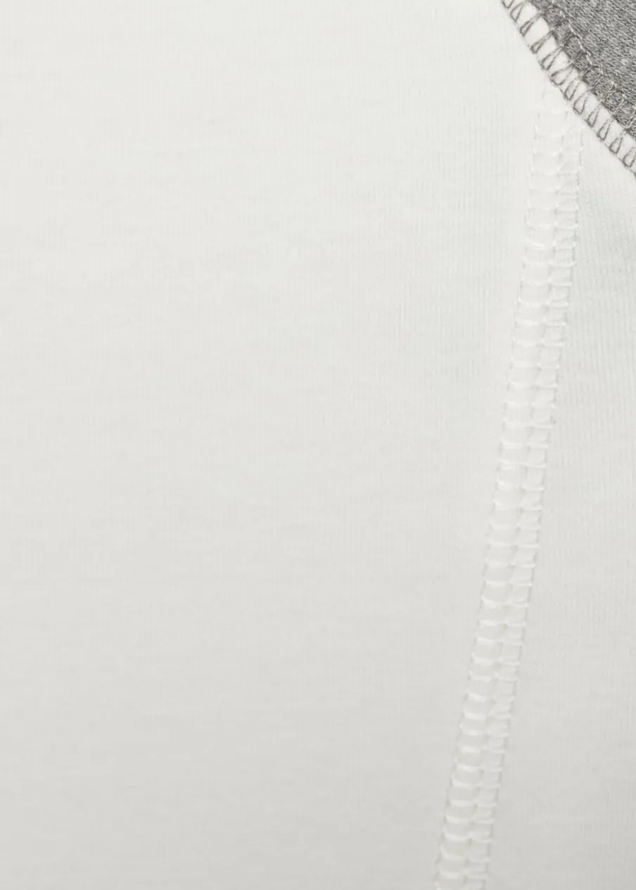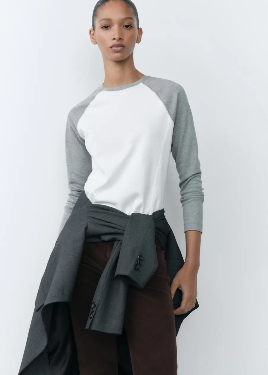 Tkanina z 100% bawełny. Model prosty. Okrągły dekolt. Długi, kontrastowy rękaw. Modelka ma 178 cm wzrostu i nosi rozmiar S/36.
