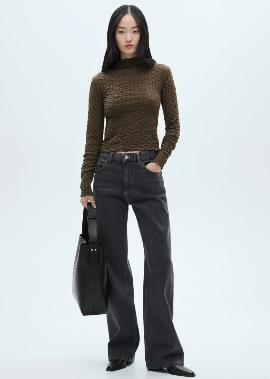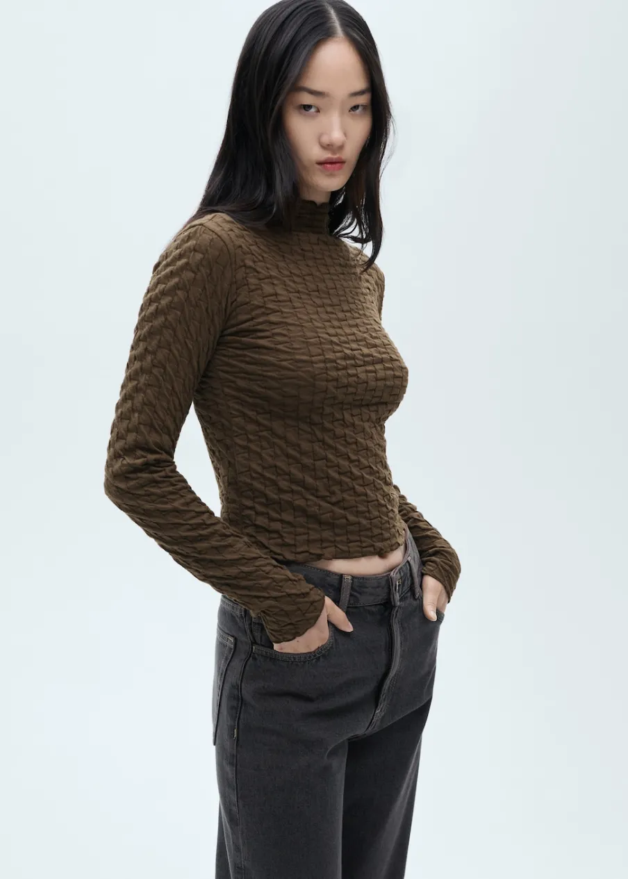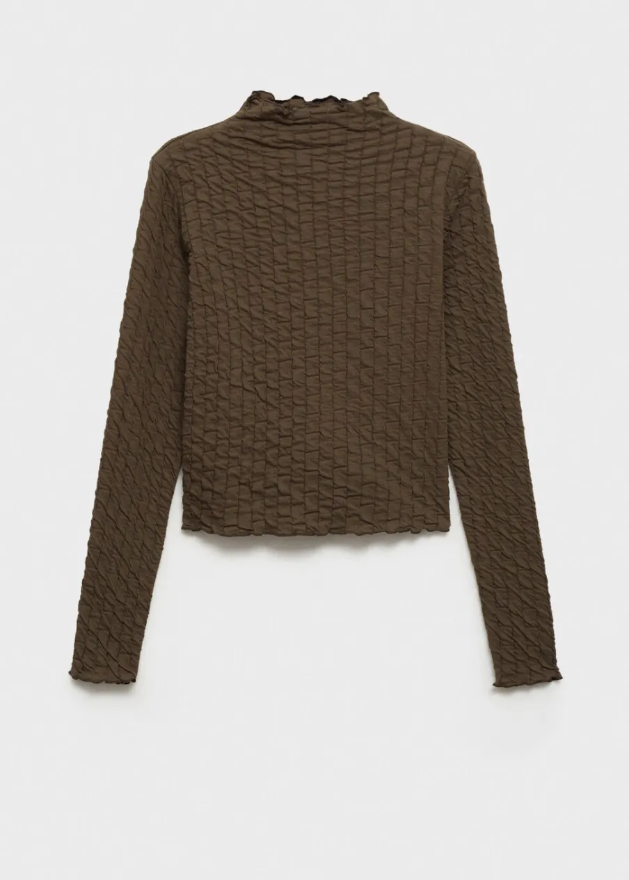 Tkanina mieszanka bawełny. Marszczona tkanina. Model prosty. Półgolf. Długi rękaw. Bez zapięcia.