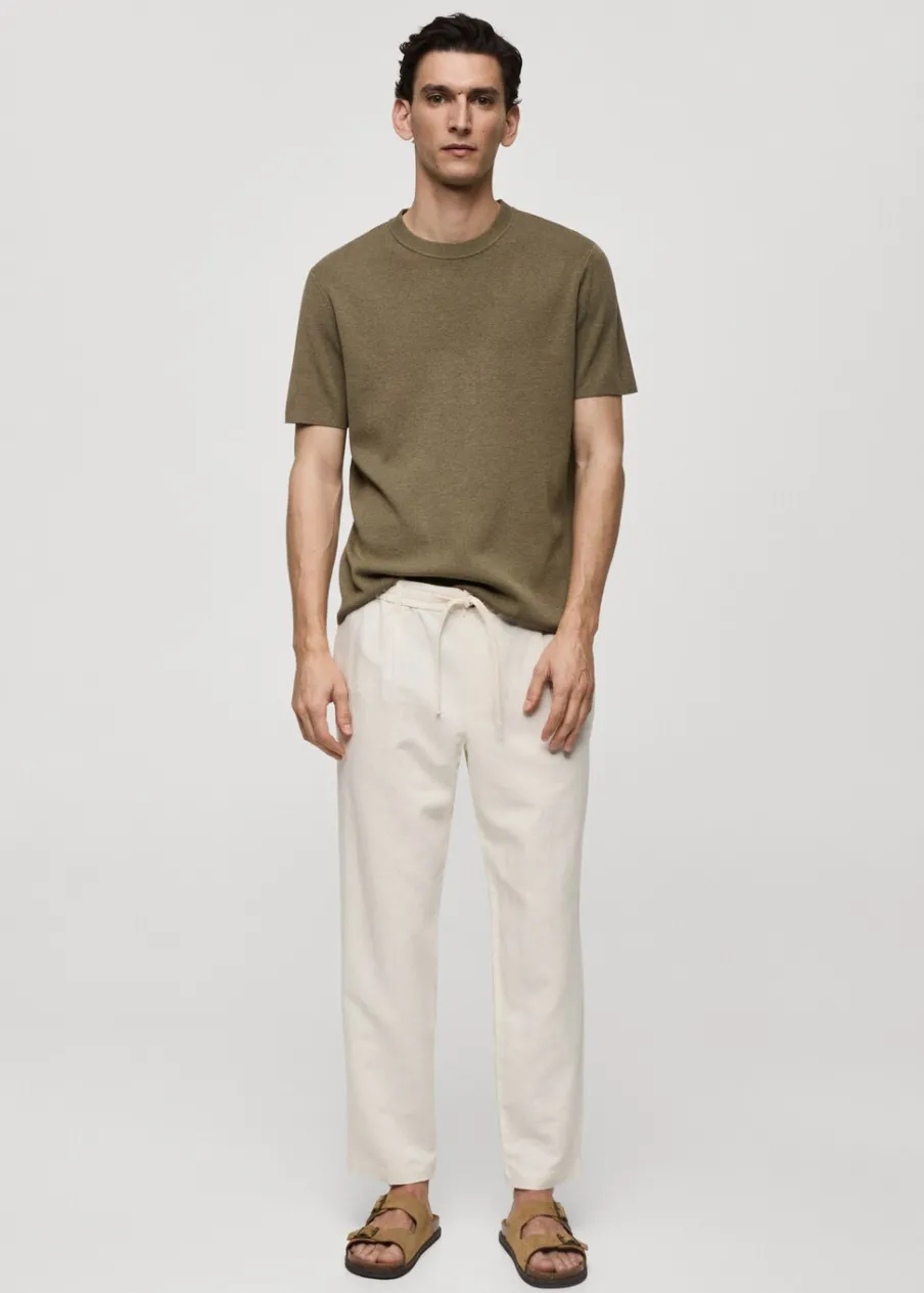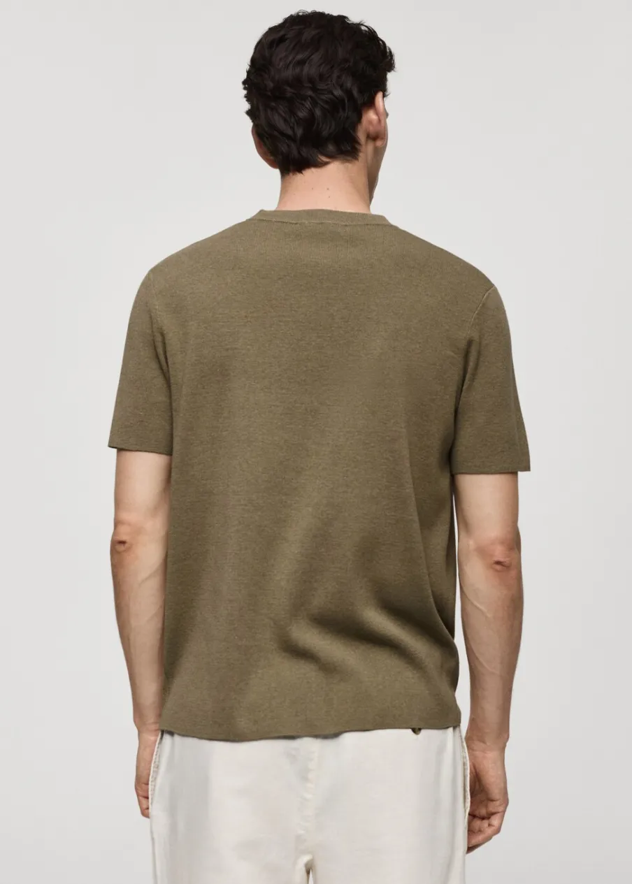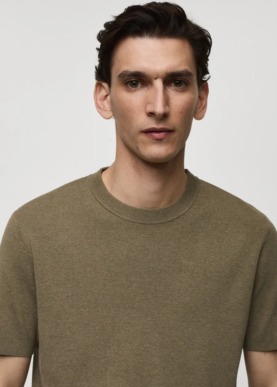 Tkanina mieszanka bawełny. Tkanina z cienkiej dzianiny. Okrągły dekolt. Krótki rękaw. Prosty dół. Model ma 185 cm wzrostu i nosi rozmiar M.