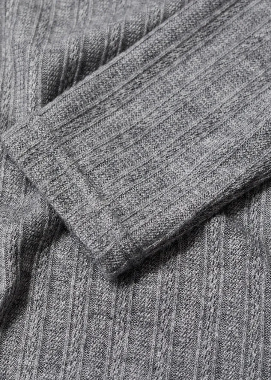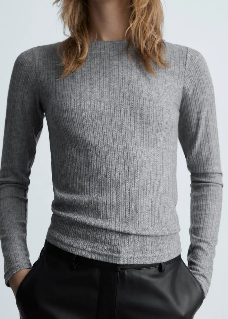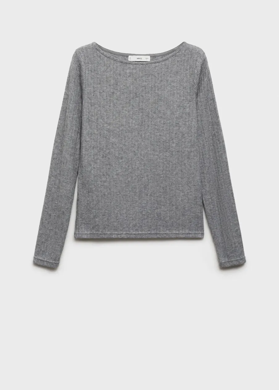 Cienka tkanina. Lejąca tkanina. Dzianina pointelle. Model prosty. Dekolt w kształcie łódki. Długi rękaw. Bez zapięcia. Model standardowy. Slim-fit. Okrągły dekolt.