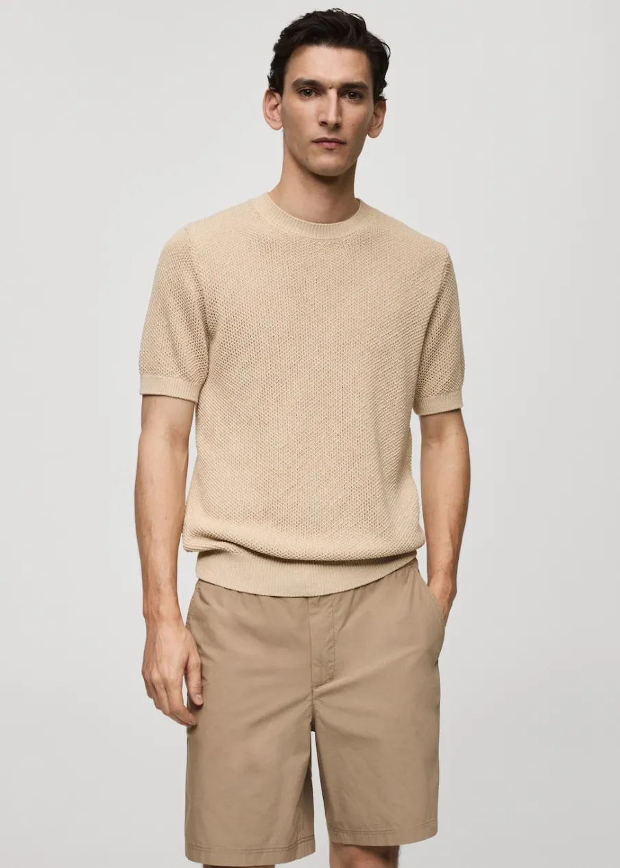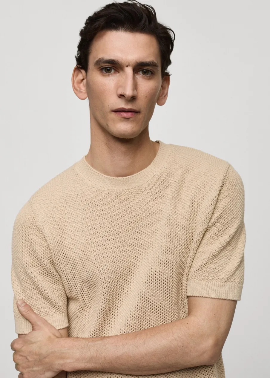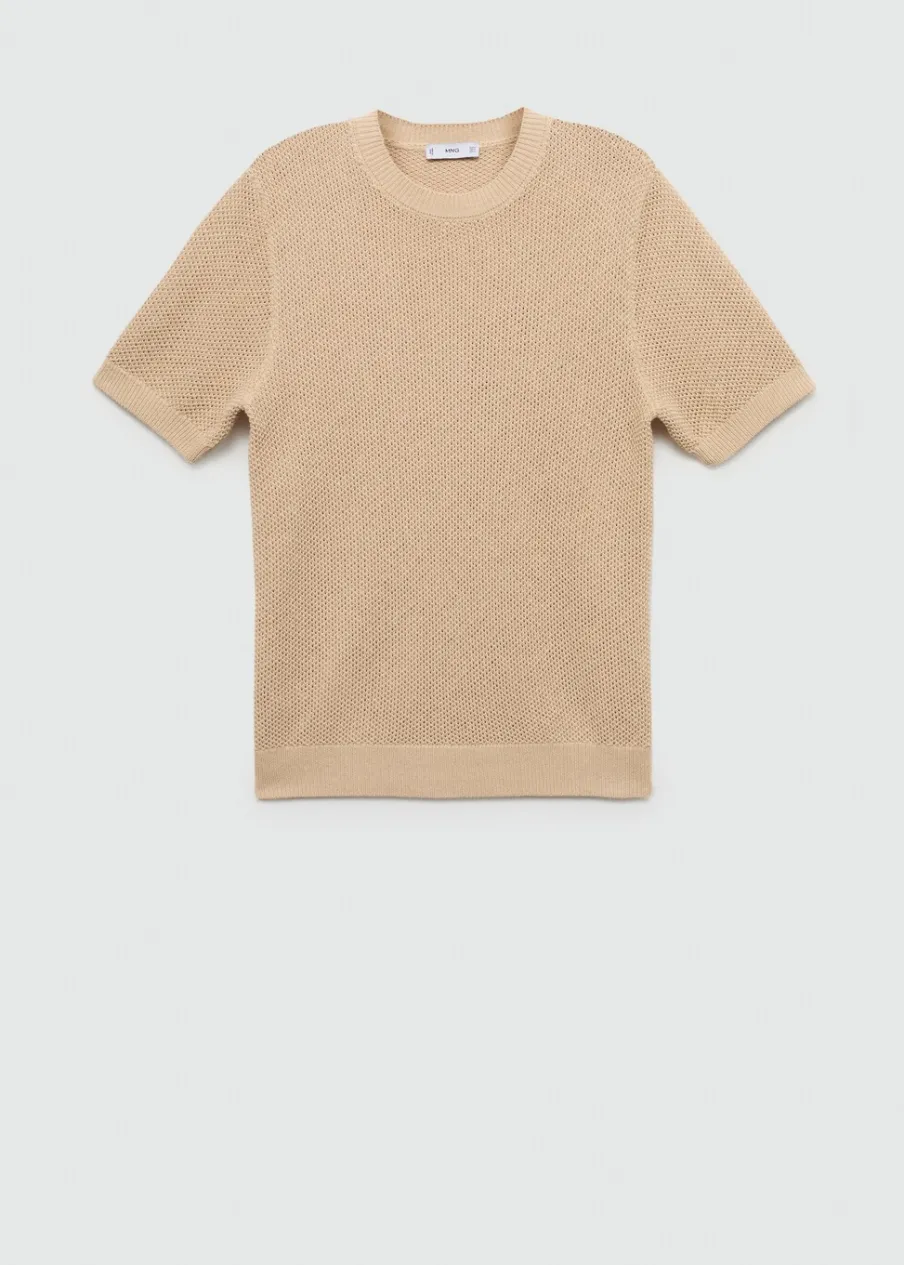 Tkanina mieszanka bawełny. Tkanina z grubej dzianiny. Okrągły dekolt. Krótki rękaw. Elastyczna gumka u dołu. Model ma 185 cm wzrostu i nosi rozmiar M. Prążkowane wykończenie na dekolcie, rękawach i u dołu.