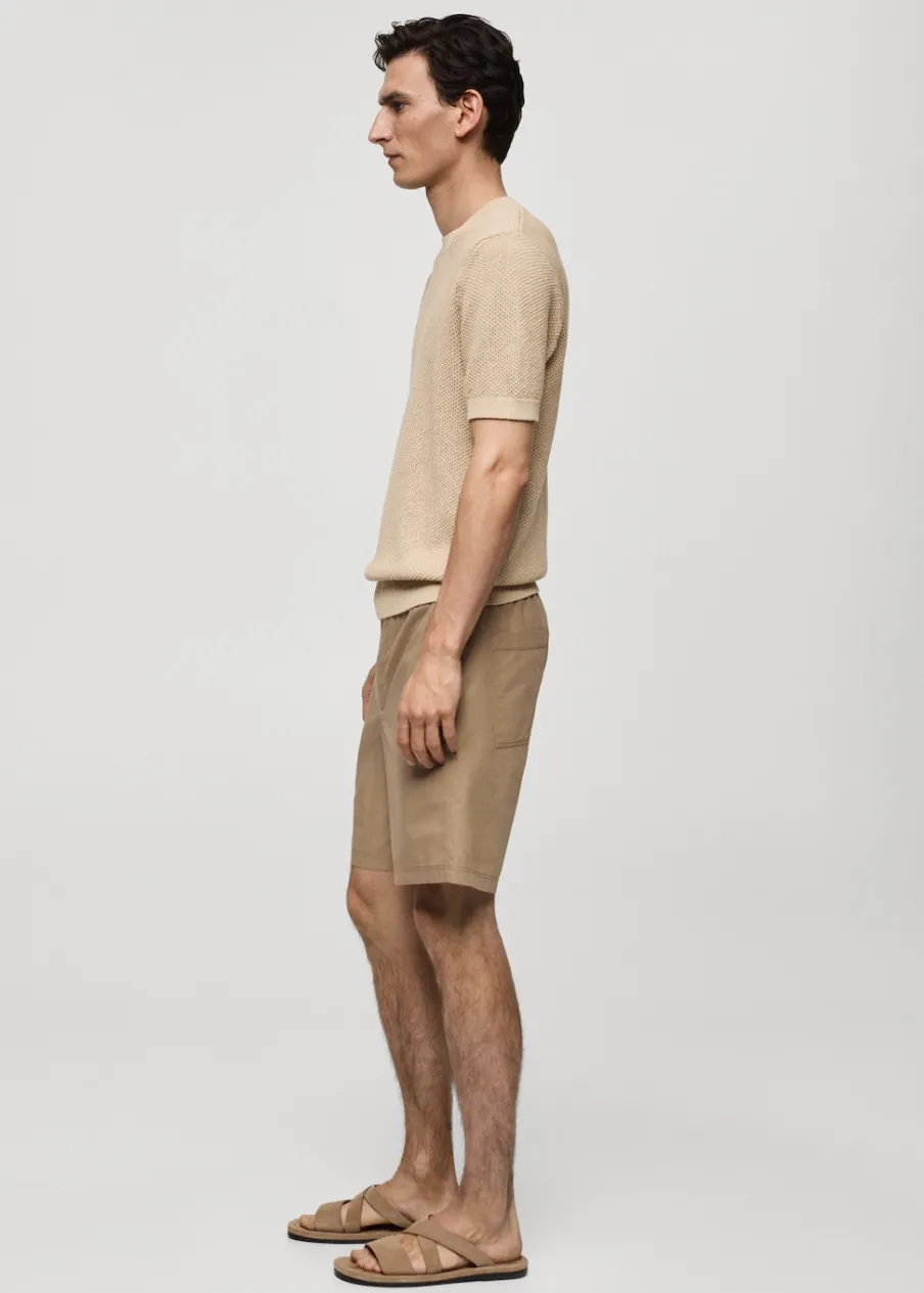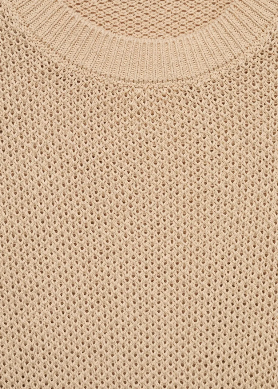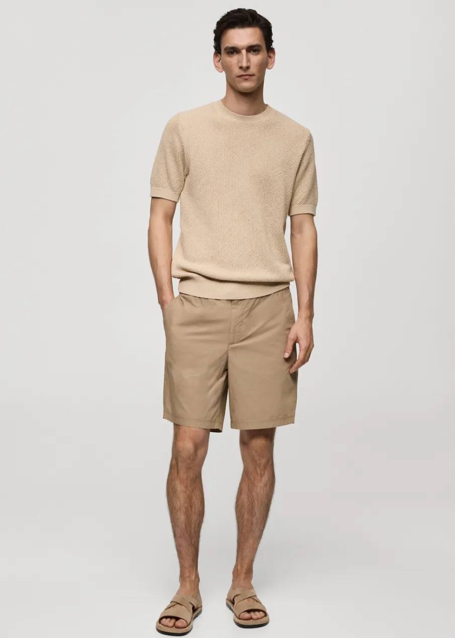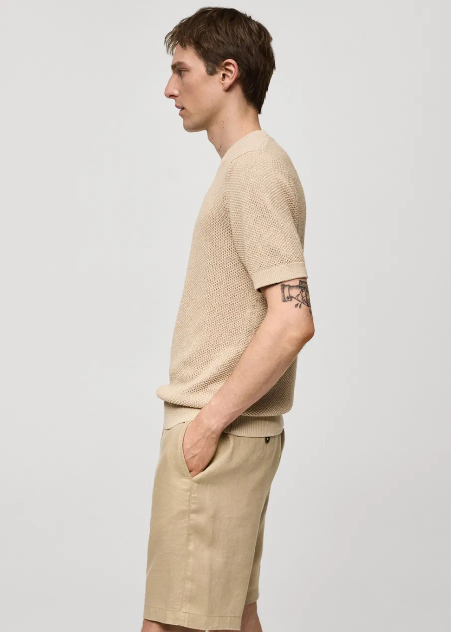 Tkanina mieszanka bawełny. Tkanina z grubej dzianiny. Okrągły dekolt. Krótki rękaw. Elastyczna gumka u dołu. Model ma 185 cm wzrostu i nosi rozmiar M. Prążkowane wykończenie na dekolcie, rękawach i u dołu.