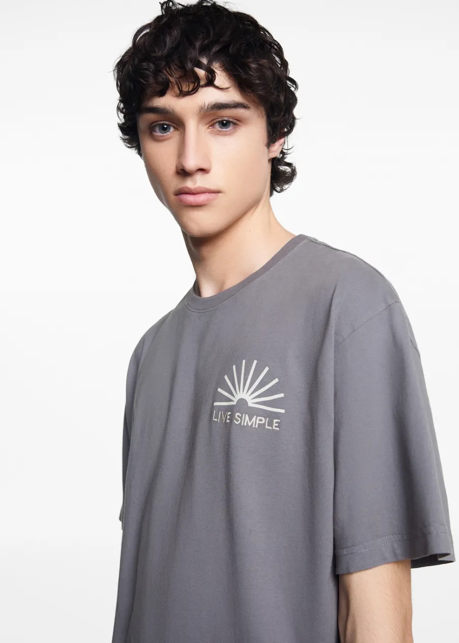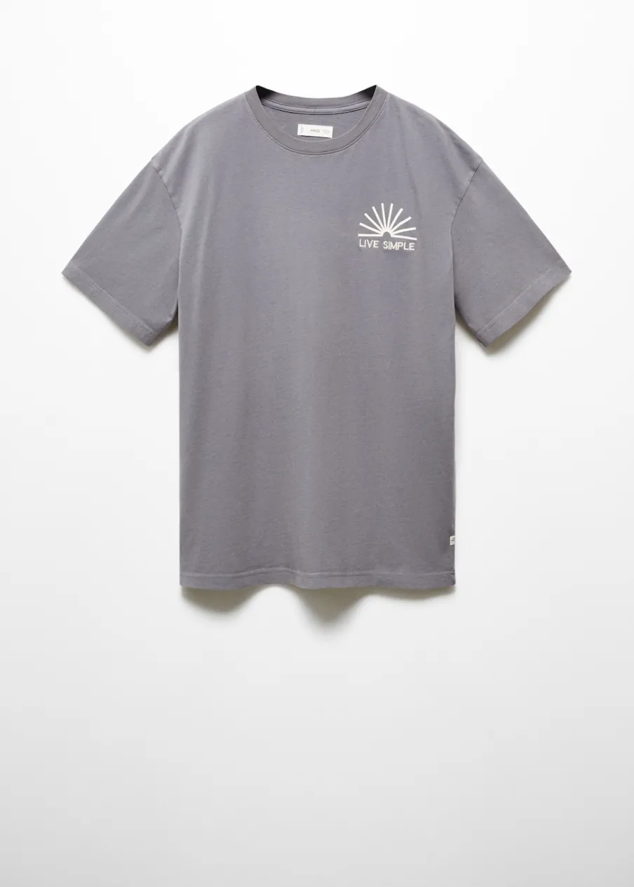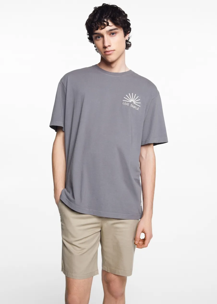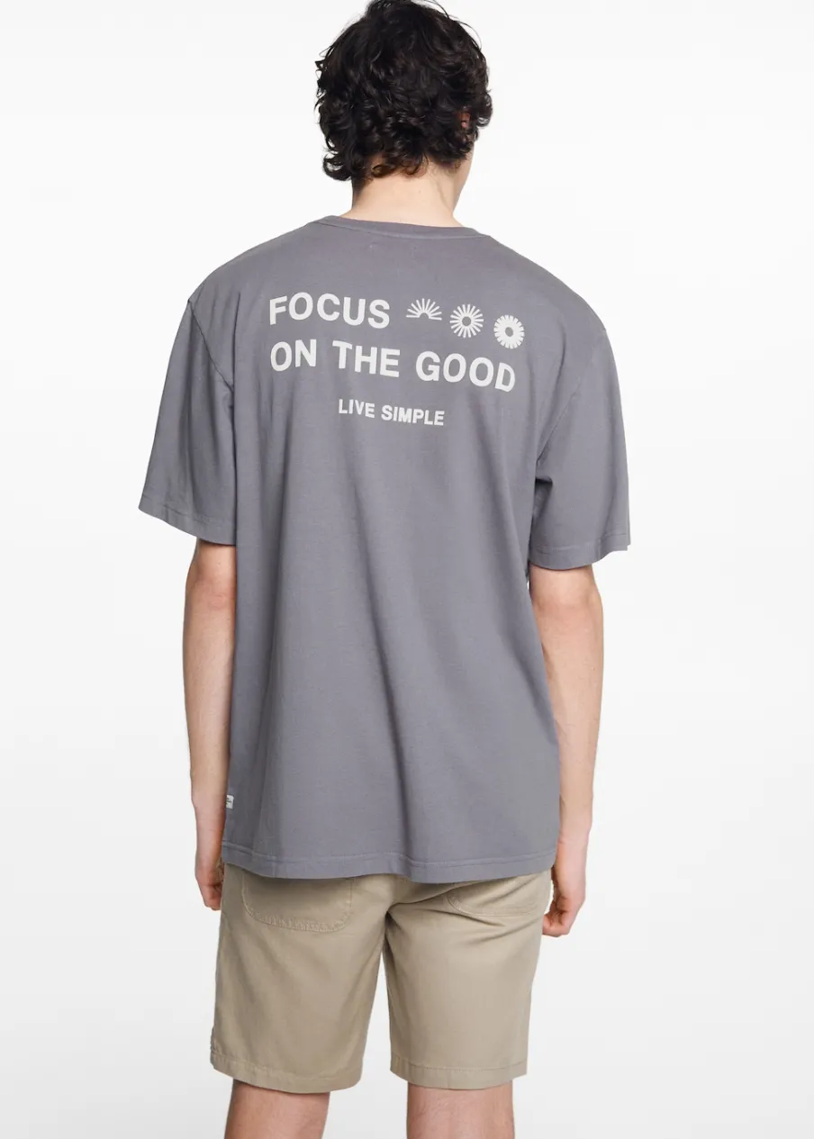 Opis100% bomull. Krój regular. Nadruk tekstu. Okrągły dekolt. Krótki rękaw. Bez zapięcia.