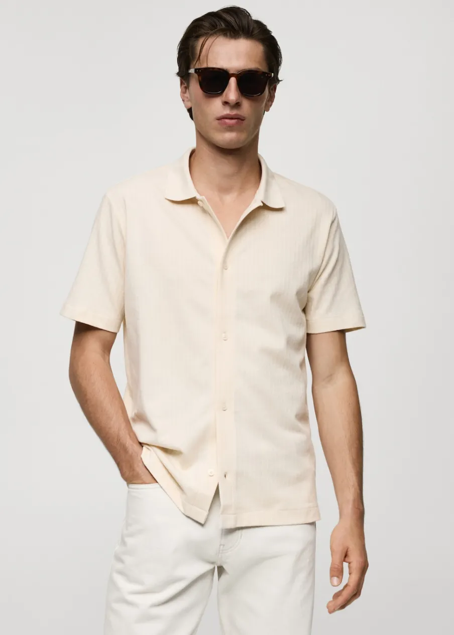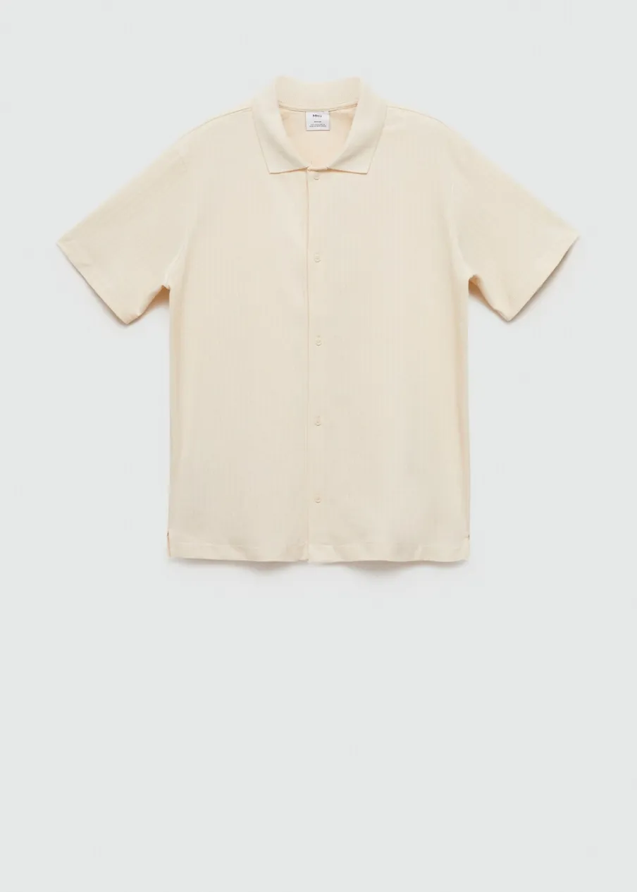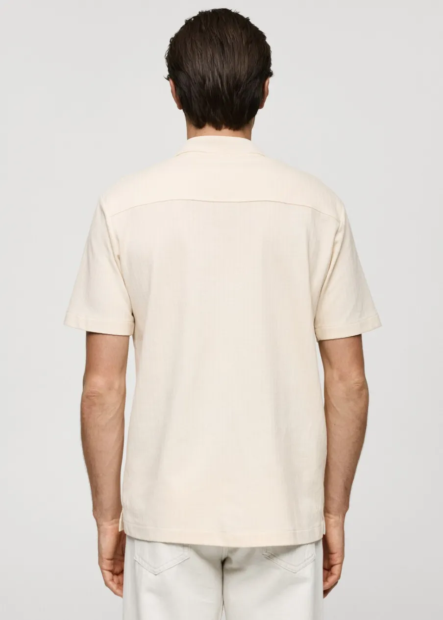 Krój regular. Tkanina bawełniana. Tkanina z mikroteksturą. Zapięcie z przodu na guziki. Krótki rękaw. Prosty dół z przeszyciem. Model ma 187 cm wzrostu i nosi rozmiar M. Prążkowany kołnierzyk polo.