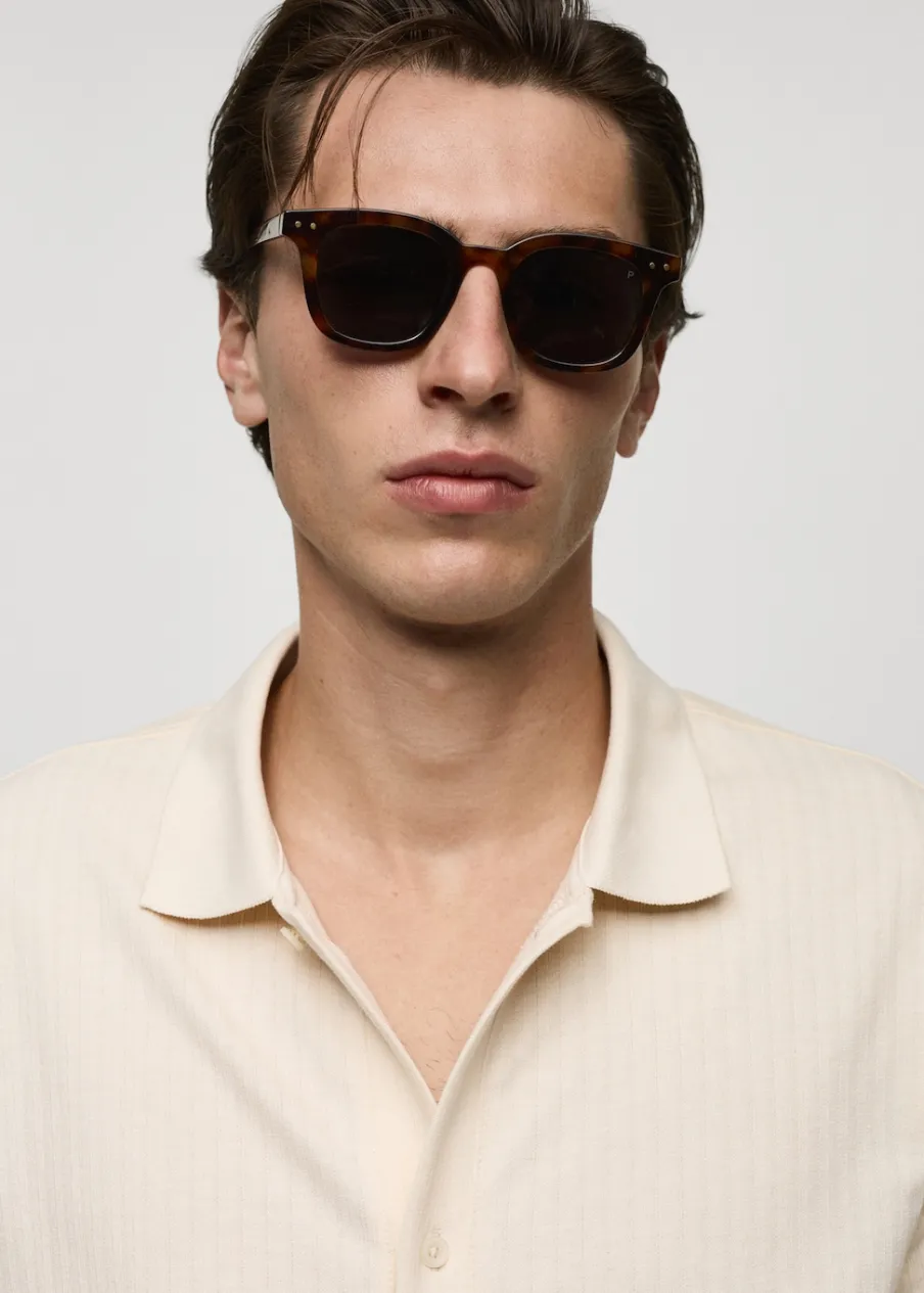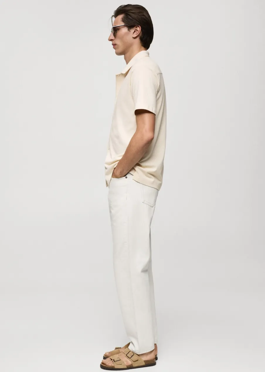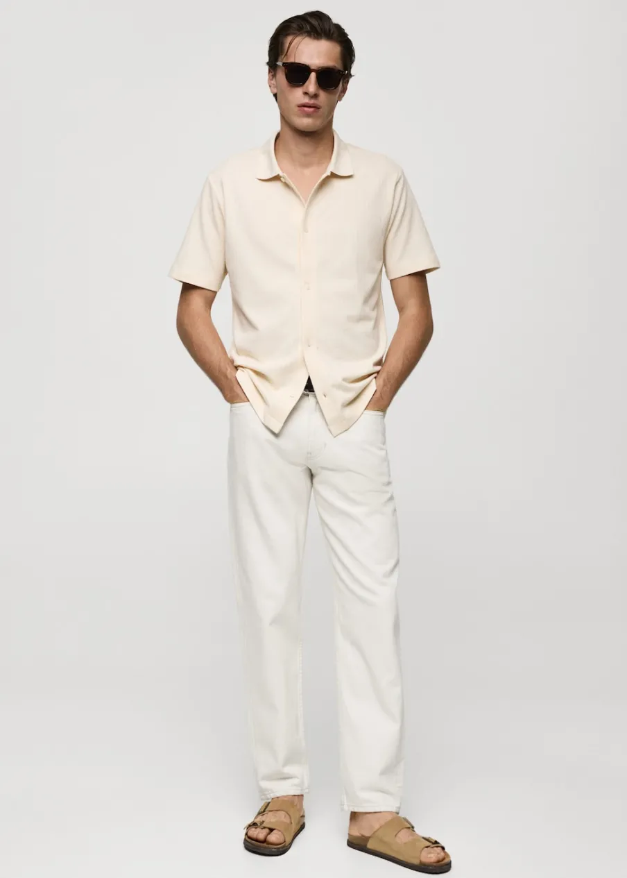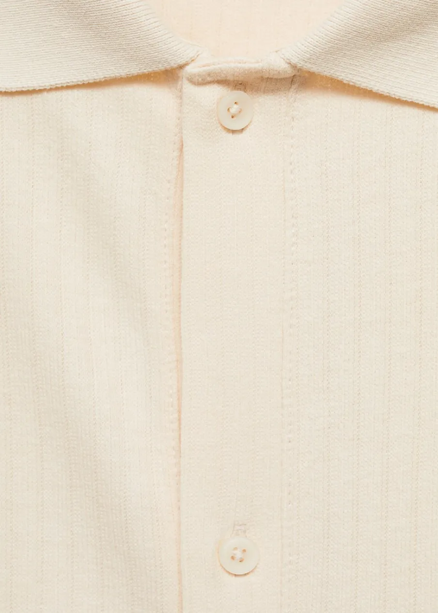 Krój regular. Tkanina bawełniana. Tkanina z mikroteksturą. Zapięcie z przodu na guziki. Krótki rękaw. Prosty dół z przeszyciem. Model ma 187 cm wzrostu i nosi rozmiar M. Prążkowany kołnierzyk polo.