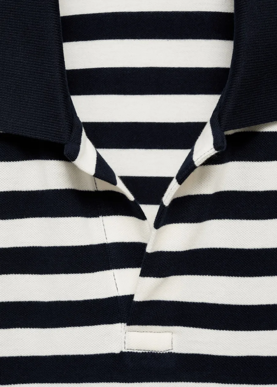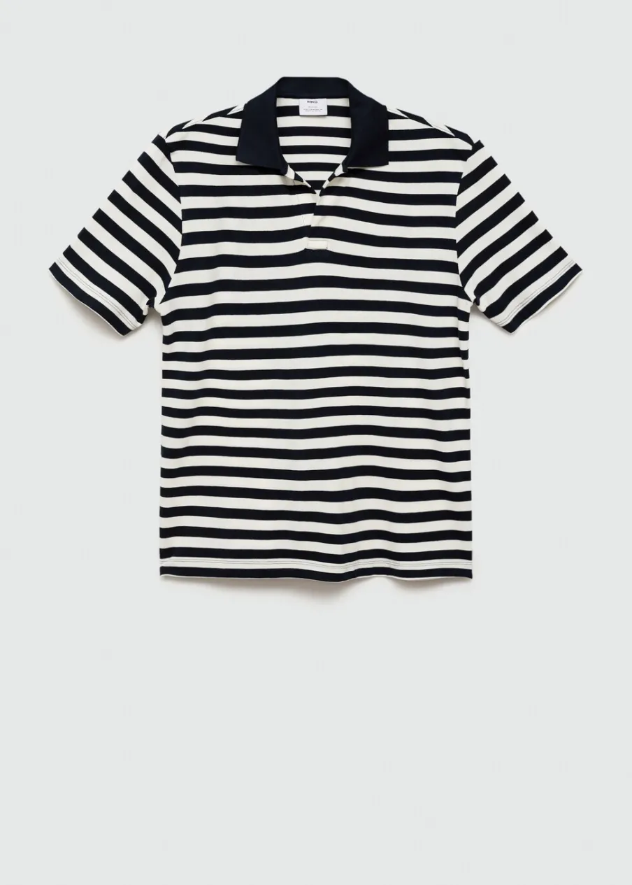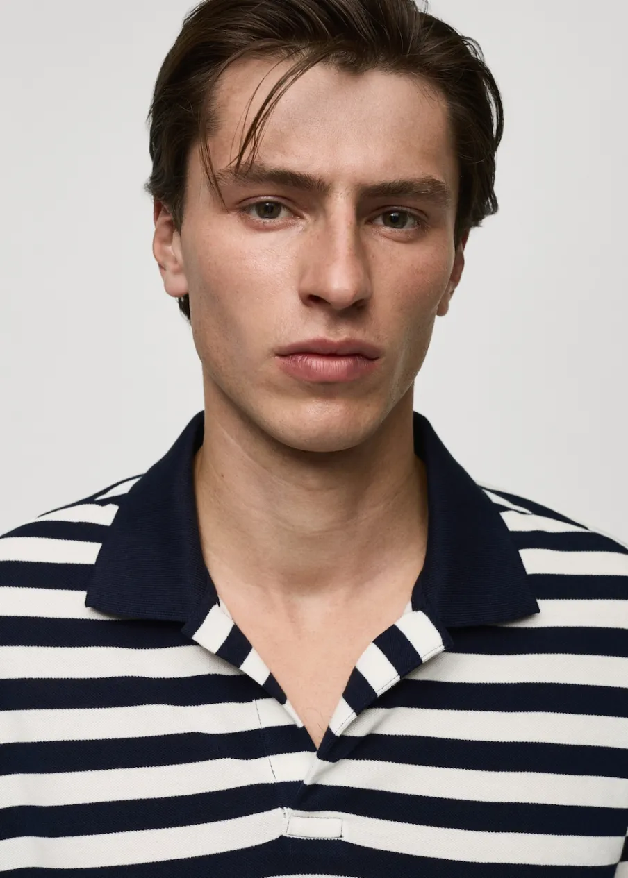 Krój regular. Tkanina z bawełnianej piki. Kołnierzyk polo z prążkowanej dzianiny z dekoltem w serek. Nadruk w poziome paski. Krótki rękaw. Prosty dół. Model ma 187 cm wzrostu i nosi rozmiar M. Tkanina z 100% bawełny.