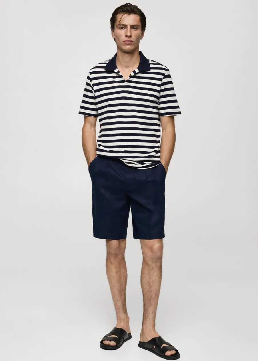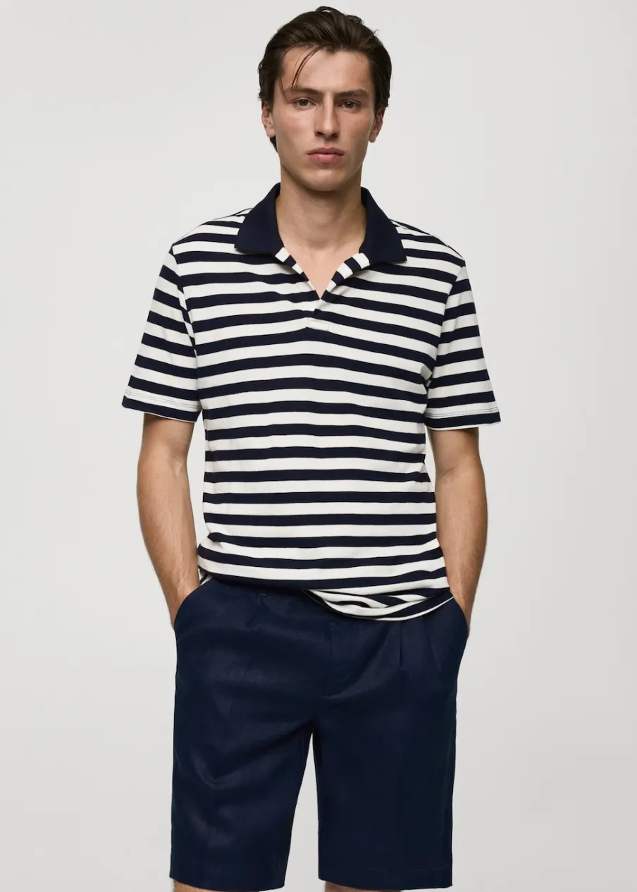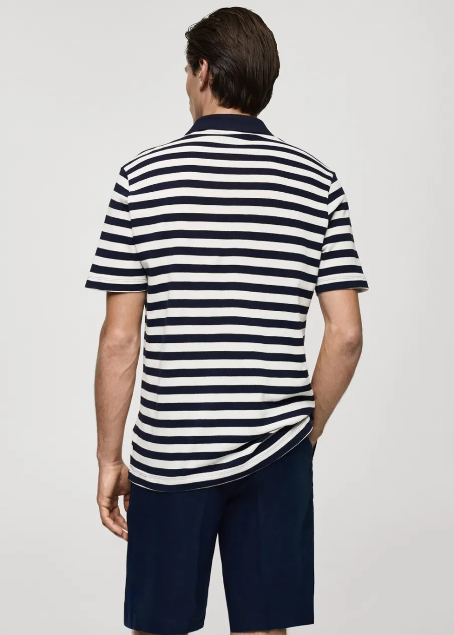 Krój regular. Tkanina z bawełnianej piki. Kołnierzyk polo z prążkowanej dzianiny z dekoltem w serek. Nadruk w poziome paski. Krótki rękaw. Prosty dół. Model ma 187 cm wzrostu i nosi rozmiar M. Tkanina z 100% bawełny.