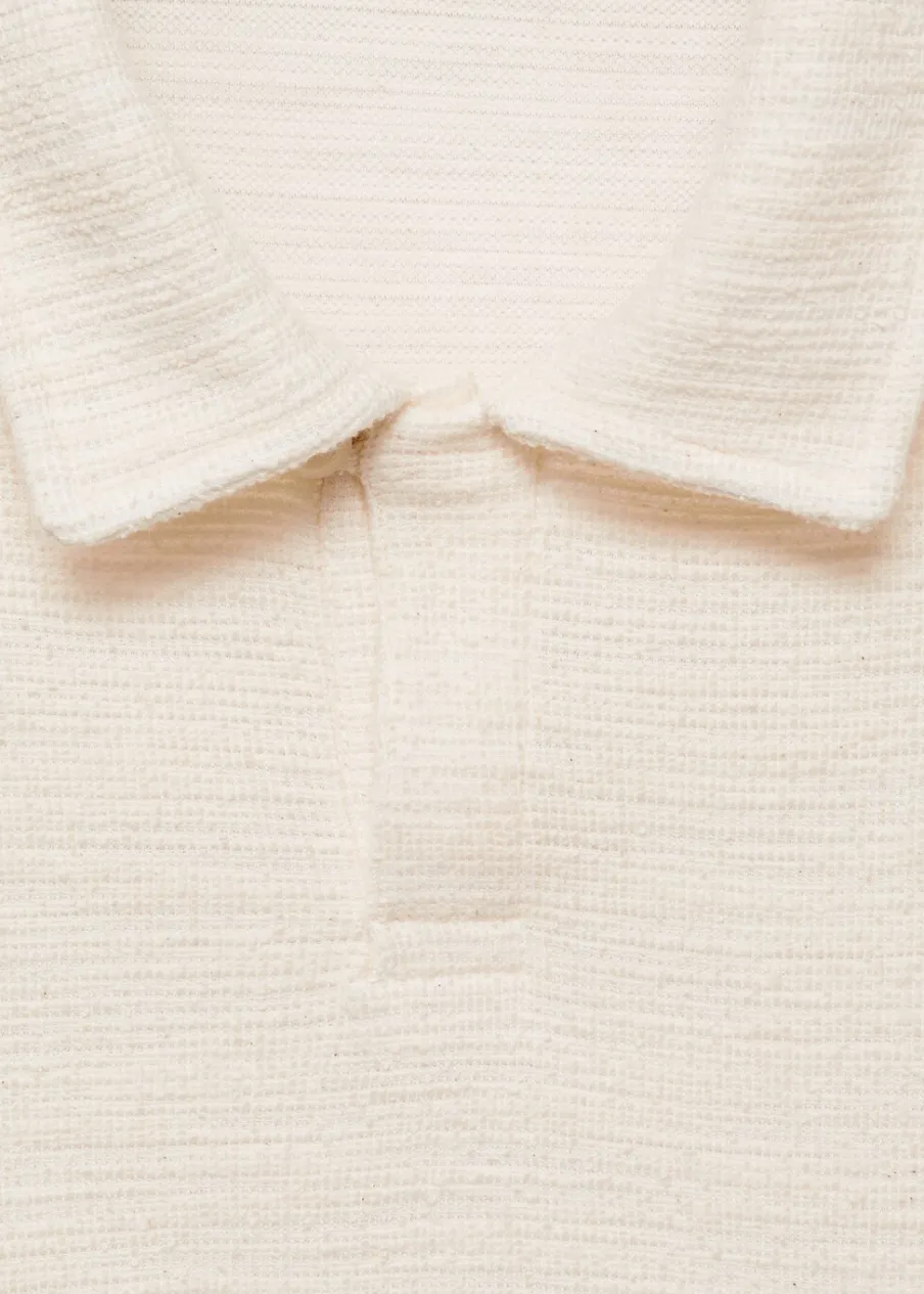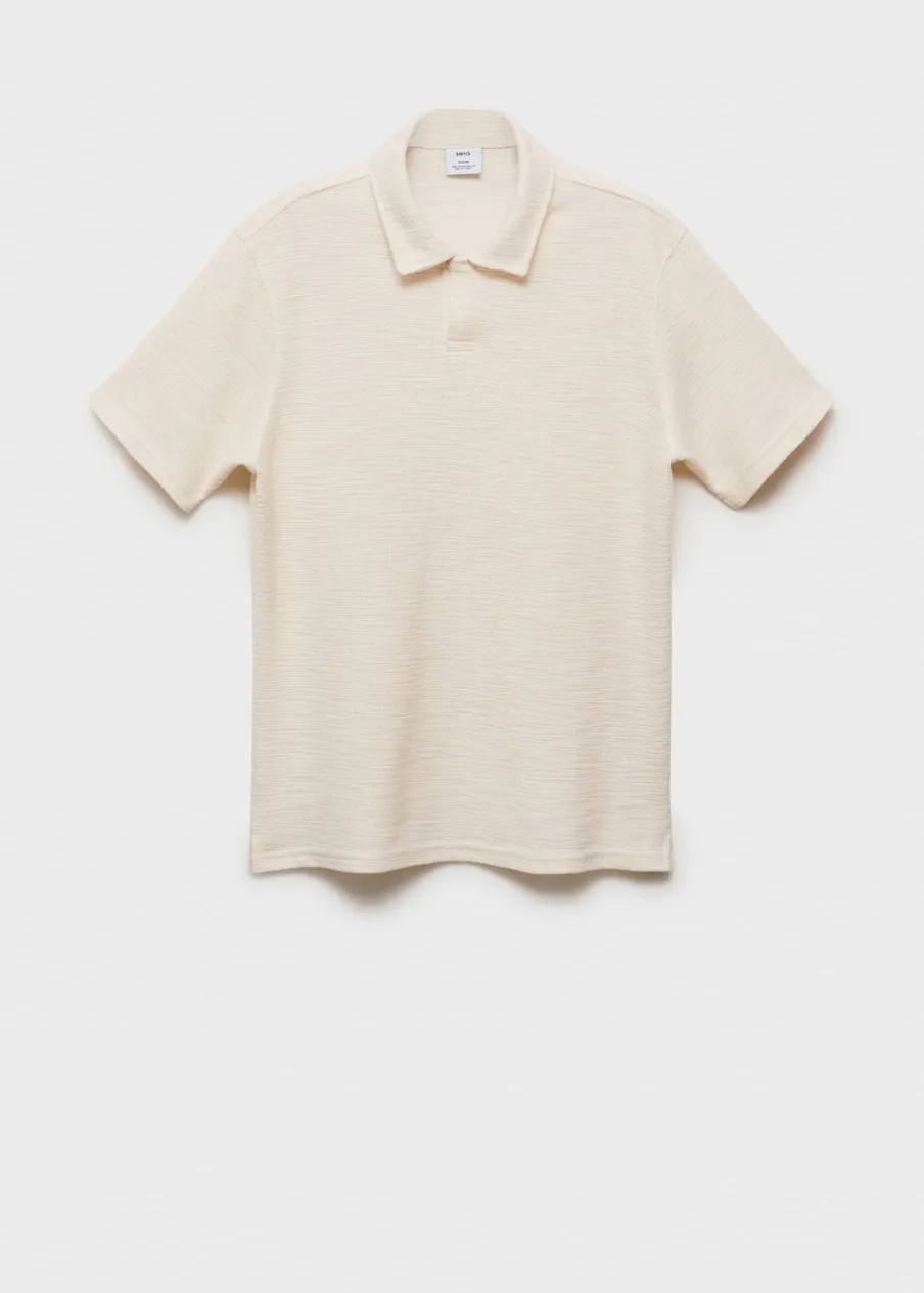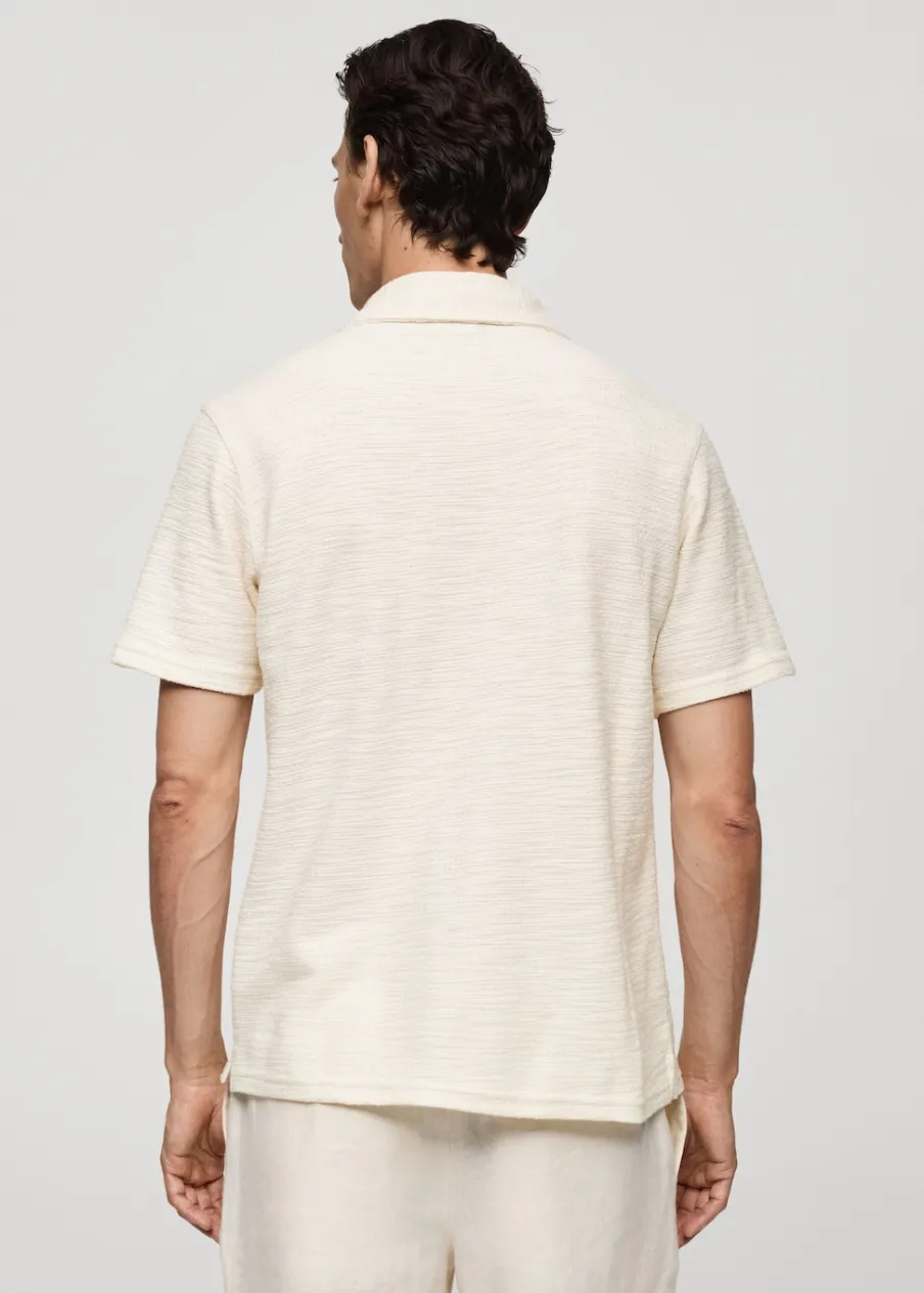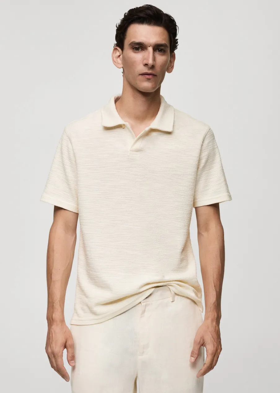 Dostępny zestaw total look. Krój regular. Tkanina mieszanka bawełny. Teksturowana tkanina. Krótki rękaw. Prosty dół. Model ma 185 cm wzrostu i nosi rozmiar M. Kołnierzyk polo z zapięciem na jeden guzik.